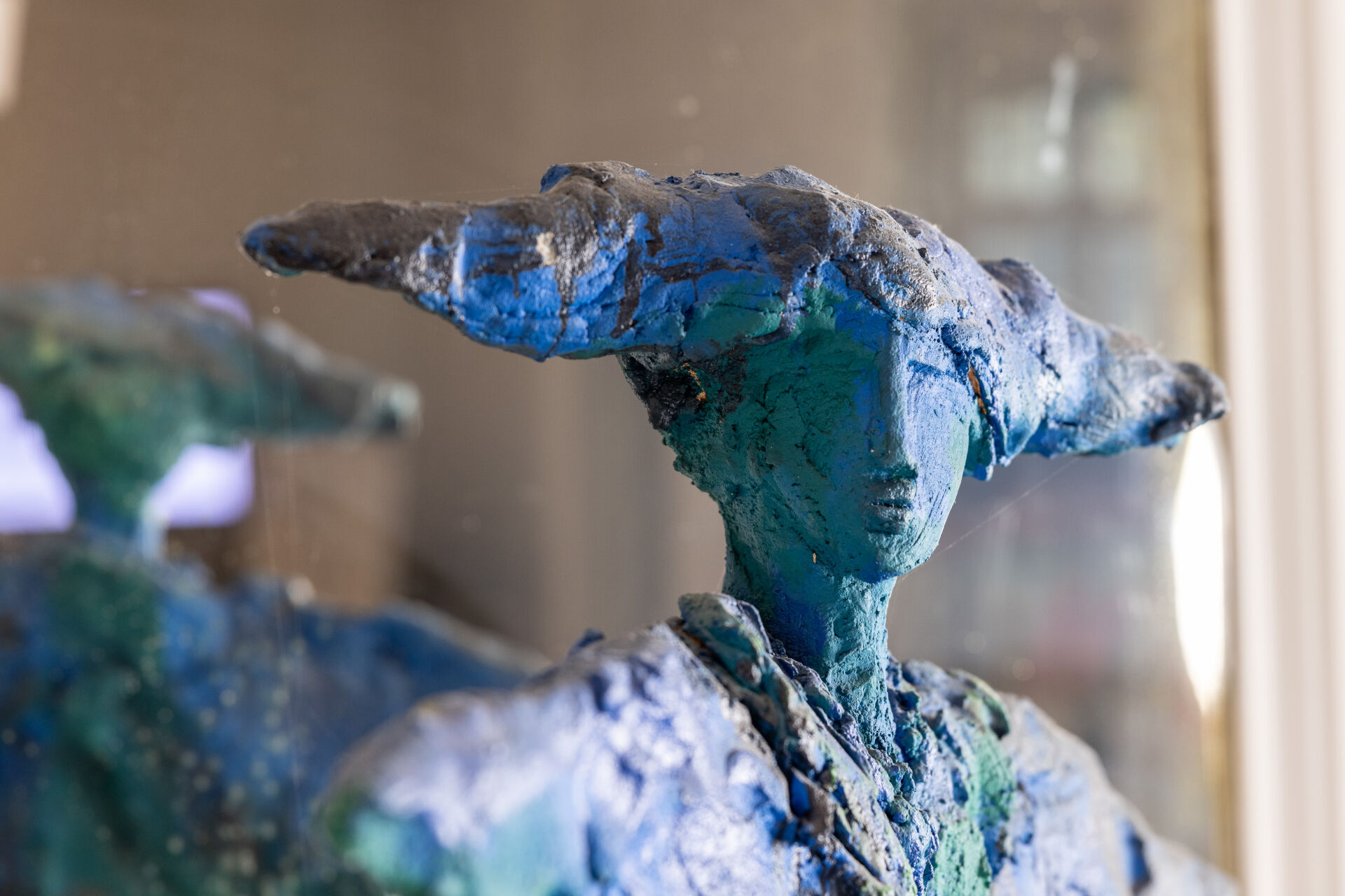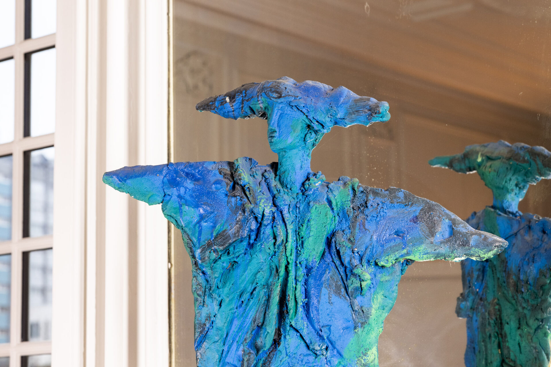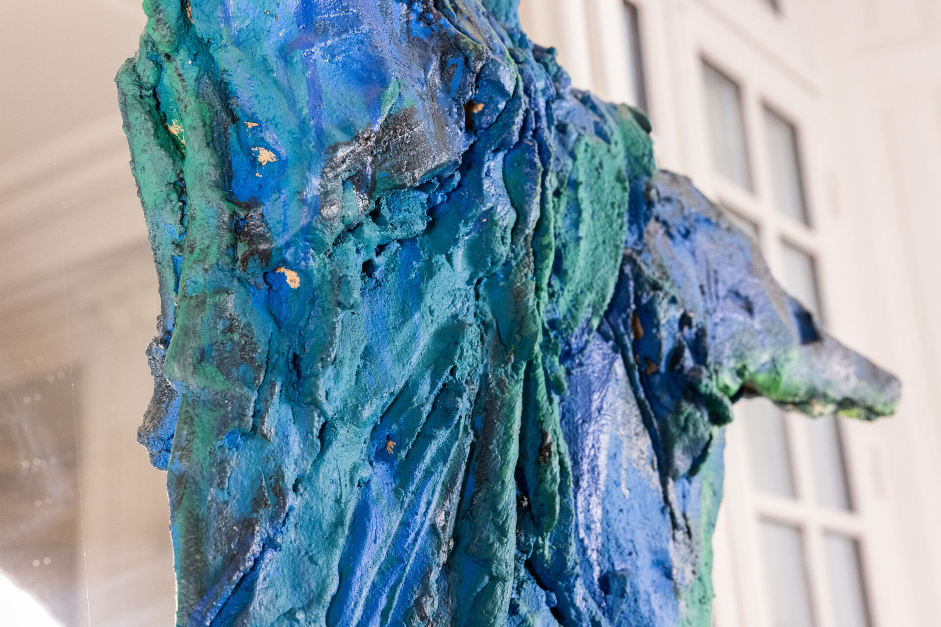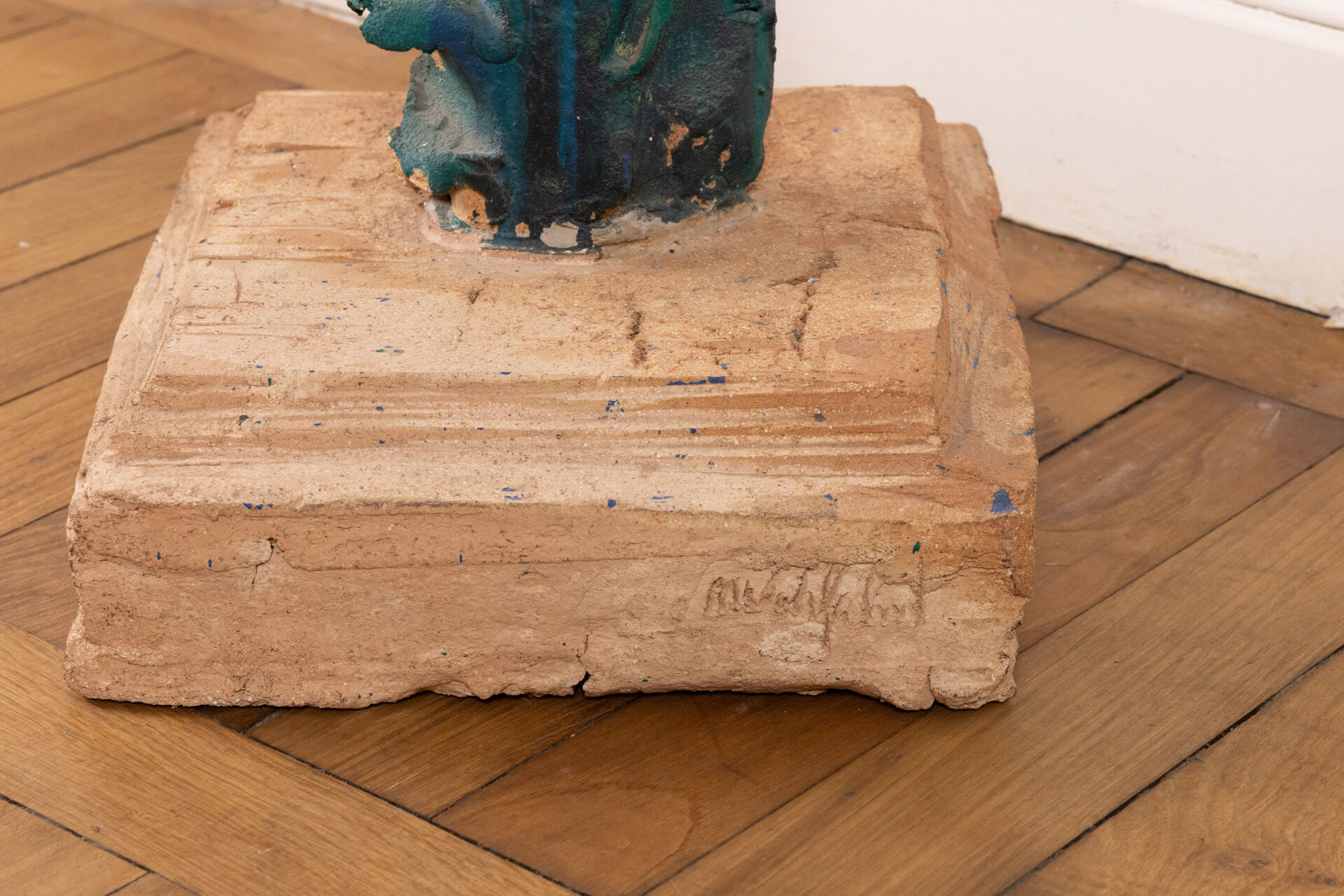 Michel WOHLFAHRT (né en 1949). Femme. Sculpture en terre cuite dans les tons bleu et vert, présentée sur socle (petits éclats). Signée sur le socle. Haut. : 213 cm - Larg. : 58 cm