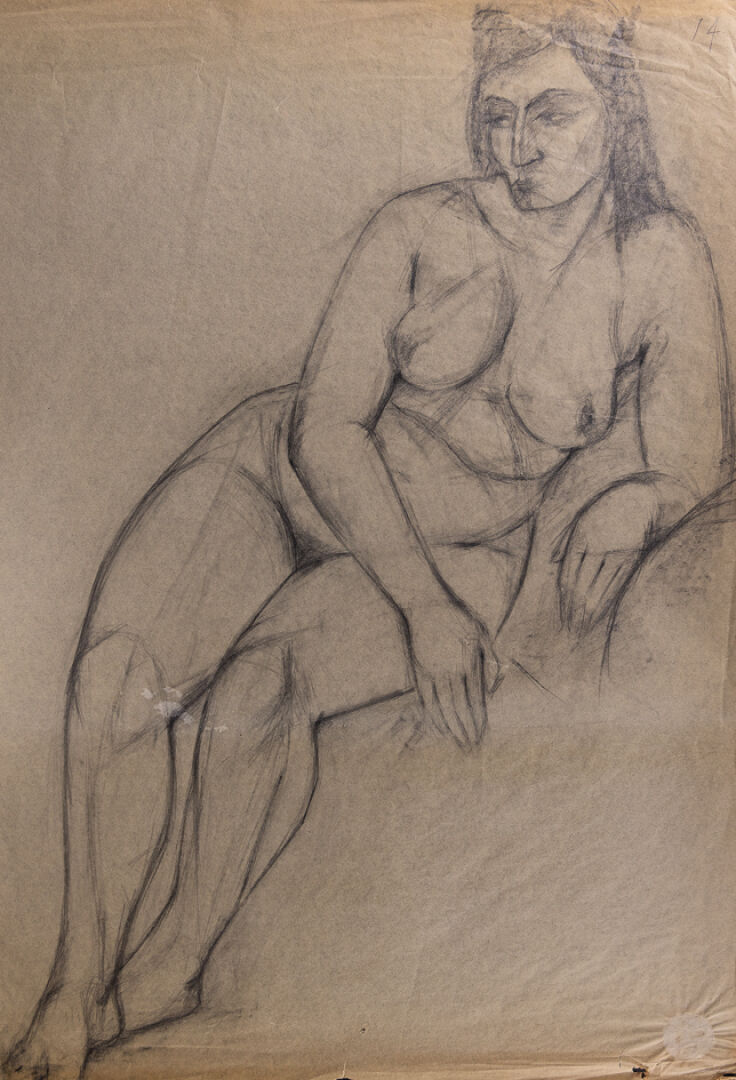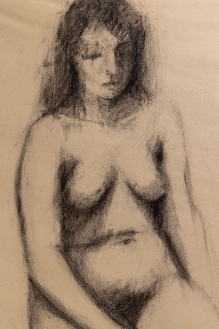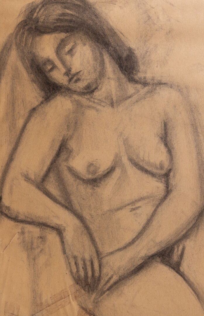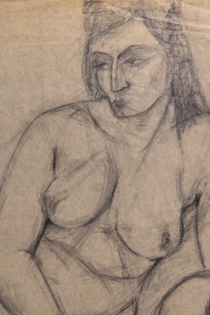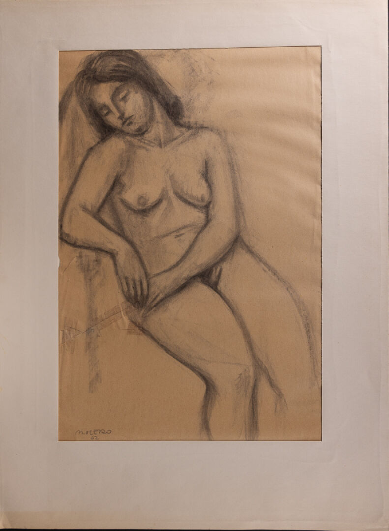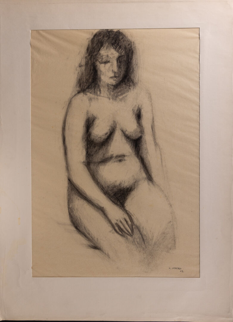 Mariano OTERO (1942-2019). Femme nue assise. Dessin signé et daté 62 en bas à gauche (déchirures, insolations). Dim. à vue : Haut. : 54 cm - Larg. : 36 cm On joint : Attribué à Mariano OTERO (1942-2019). Deux calques figurant des femmes nues, l'un signé A. OTERO et daté 63 en bas à droite, l'autre plus grand non signé numéroté 14 en haut à droite. Dim. du plus grand : Haut. : 75 cm - Larg. : 55 cm