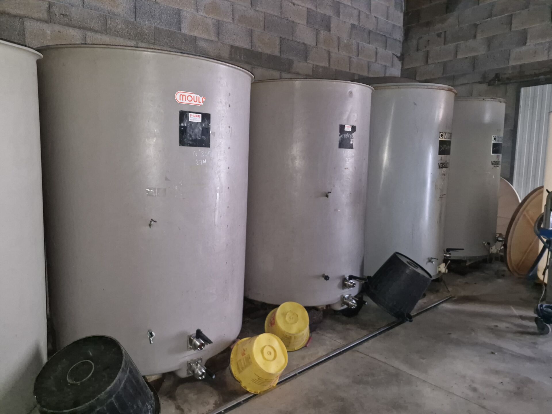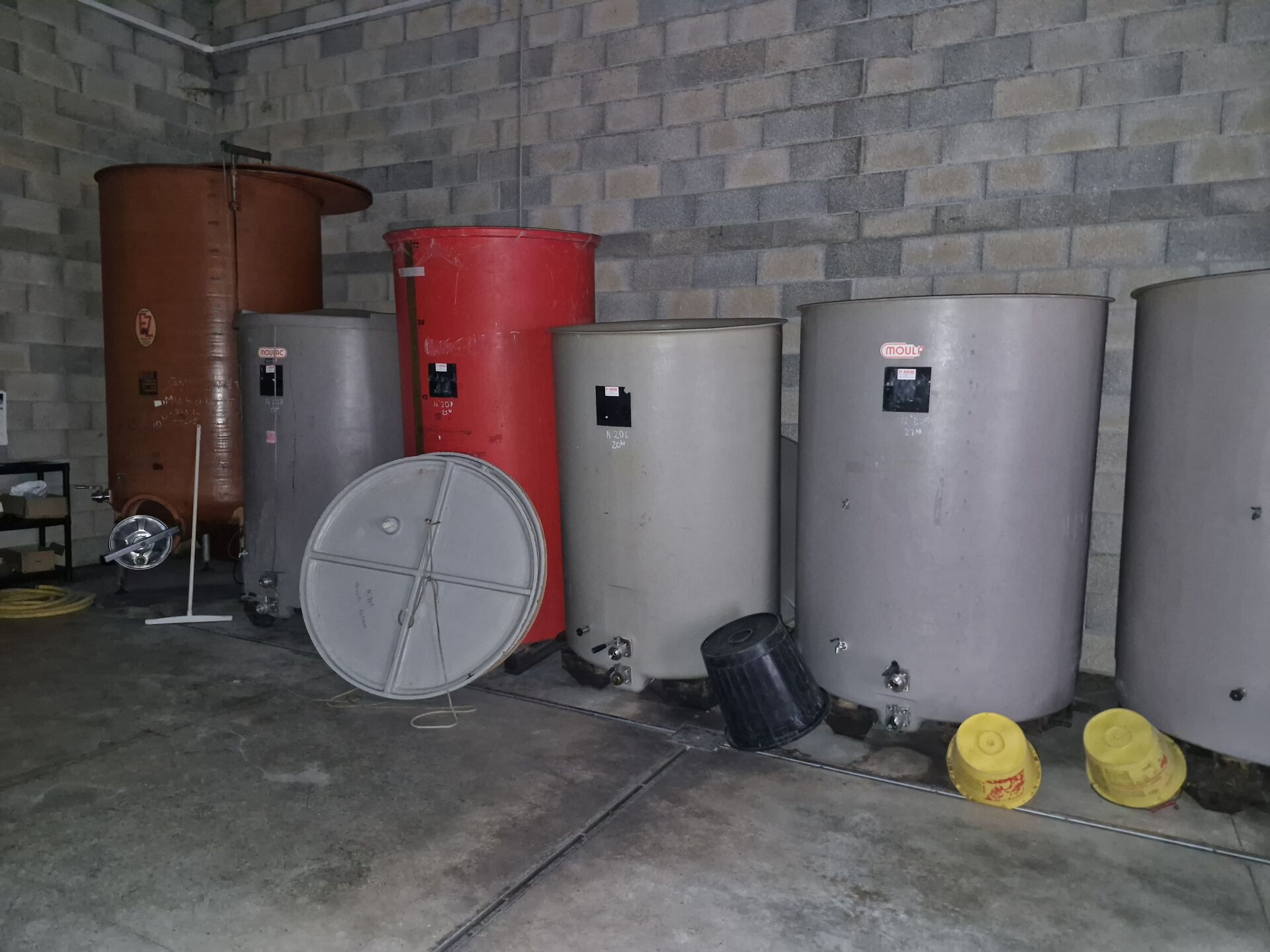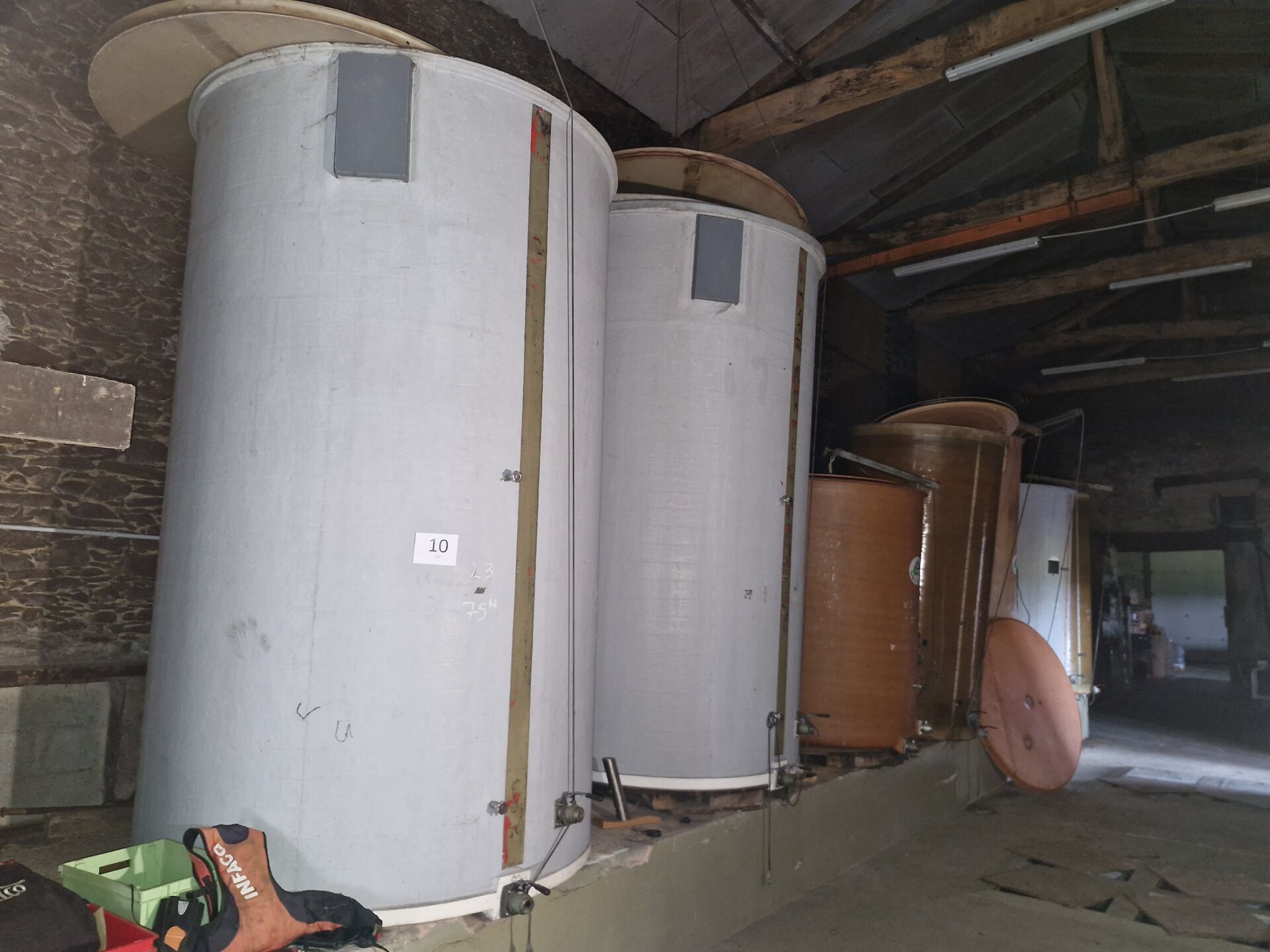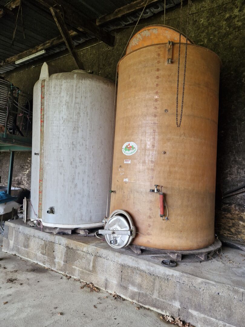 21 garde-vin en fibre ou PVC, 5x 27HL, 2x 75HL, 4x 30HL, 2x 25HL, 3x 50HL, 1x 65HL, 1x 5HL, 1x 6HL, 1x 20HL et 1x 60HL + 2 à l'extérieur (capacité inconnue)