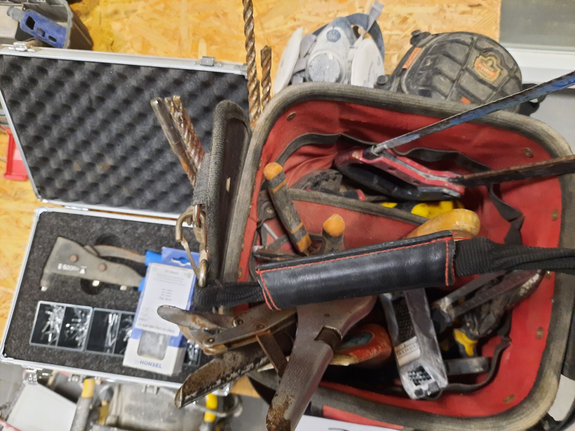 Sacoche à outils VIRAX garnie d'outillage à main (pinces, pinces étaux FACOM, cisaille, rabots...), forêts, béton, scie à métaux On joint : Pince à rivets en malette garnie de genouillère, masque