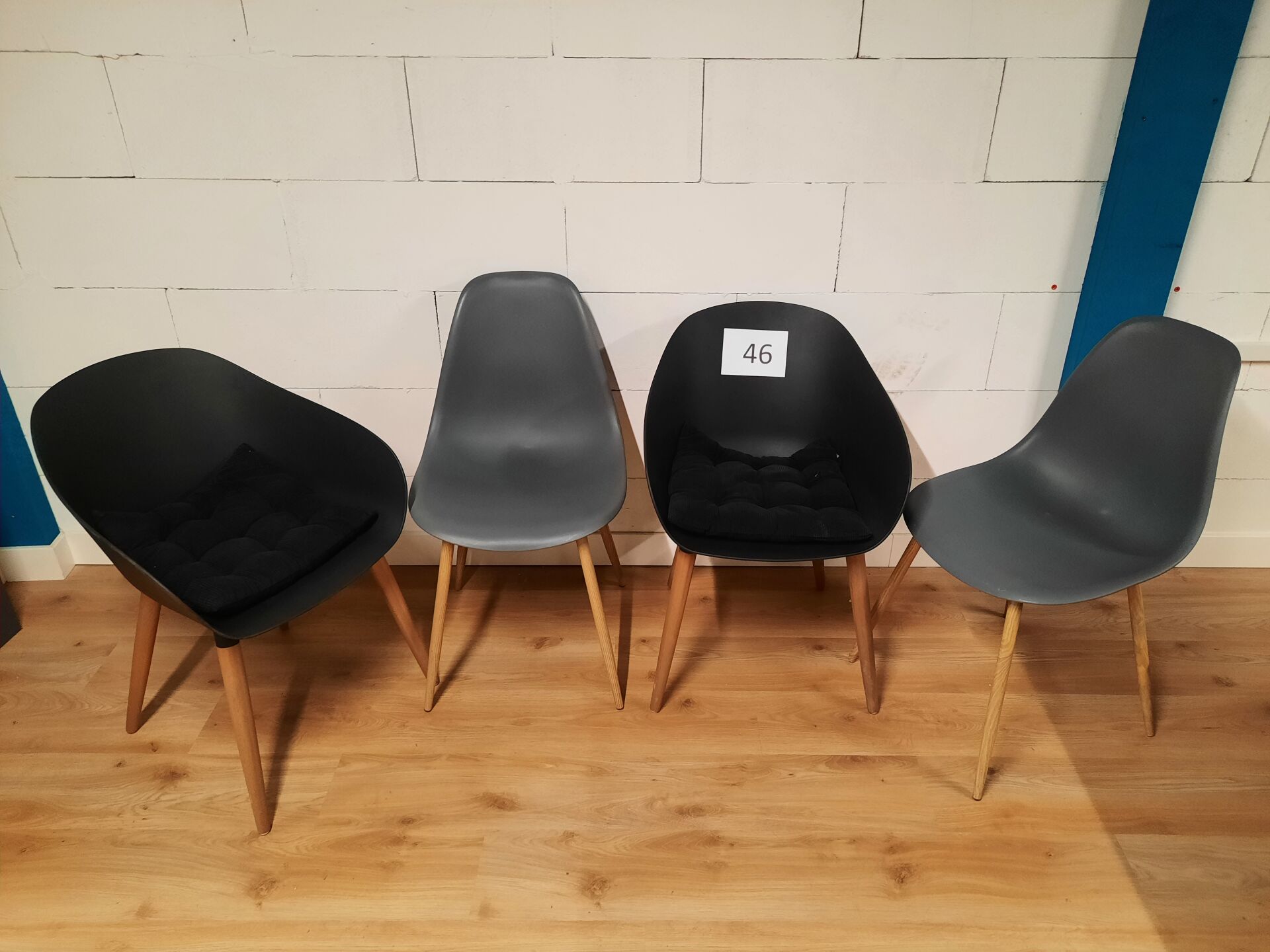 2 fauteuils coques en PVC noir piètement coupes en bois naturel 2 fauteuils coques en PVC gris piètement compas en bois naturel
