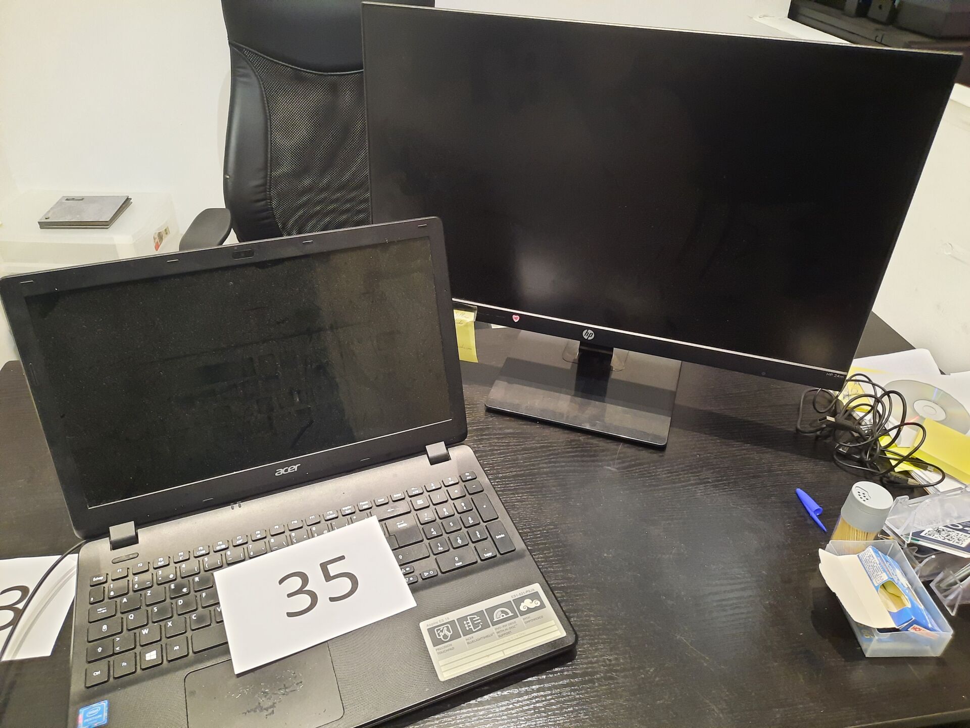 Écran HP 23" Ordinateur portable ACER modèle ASPIRE ES 15 ne s'allume pas On joint : 7 poubelles en PVC noir Cantine en métal laqué noir