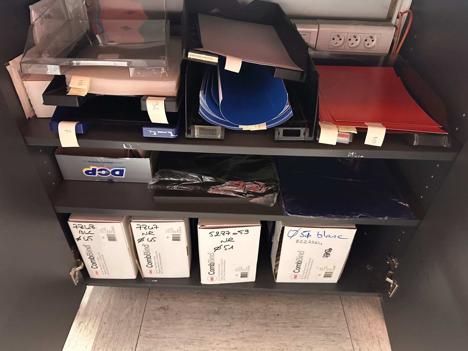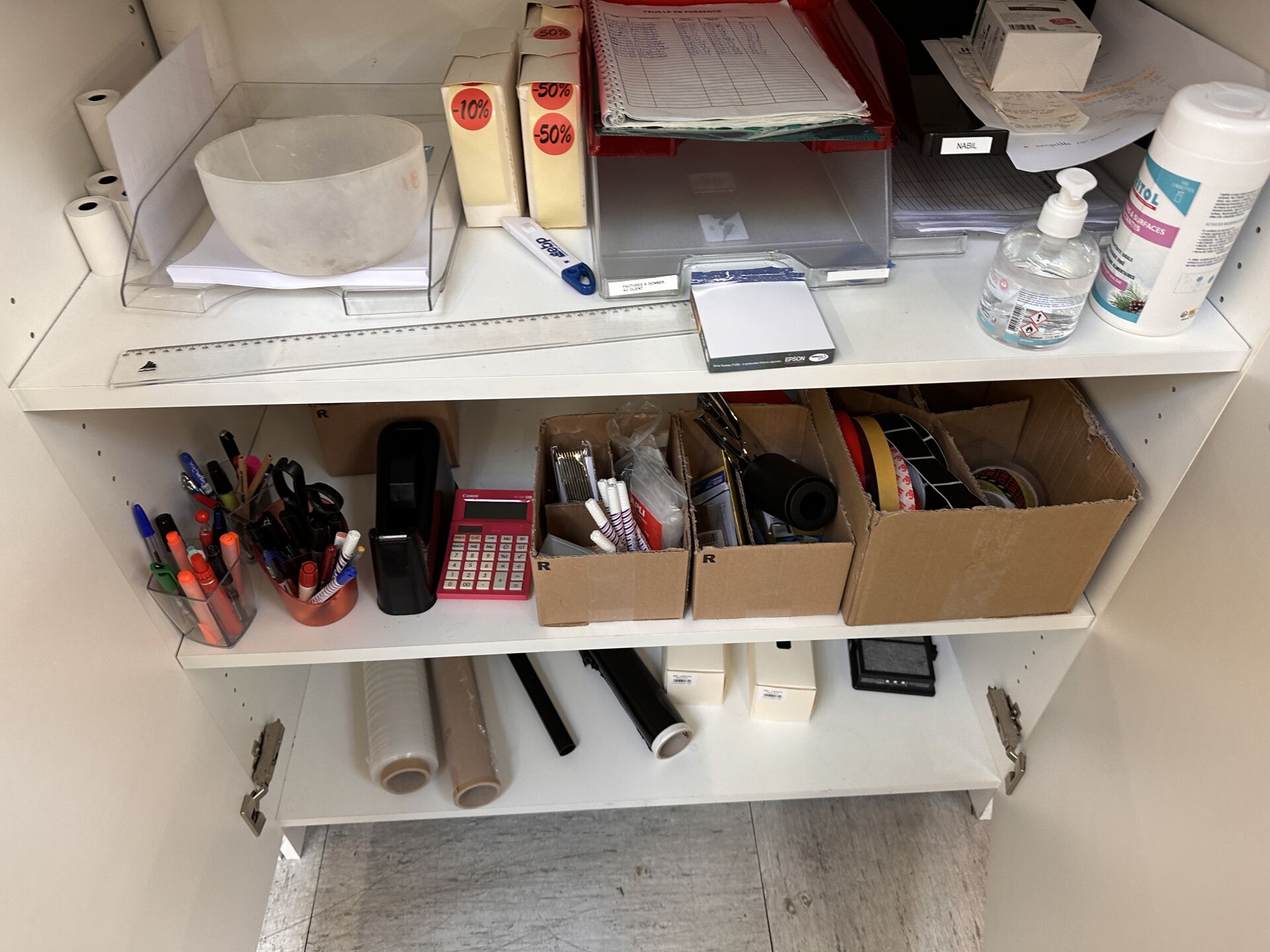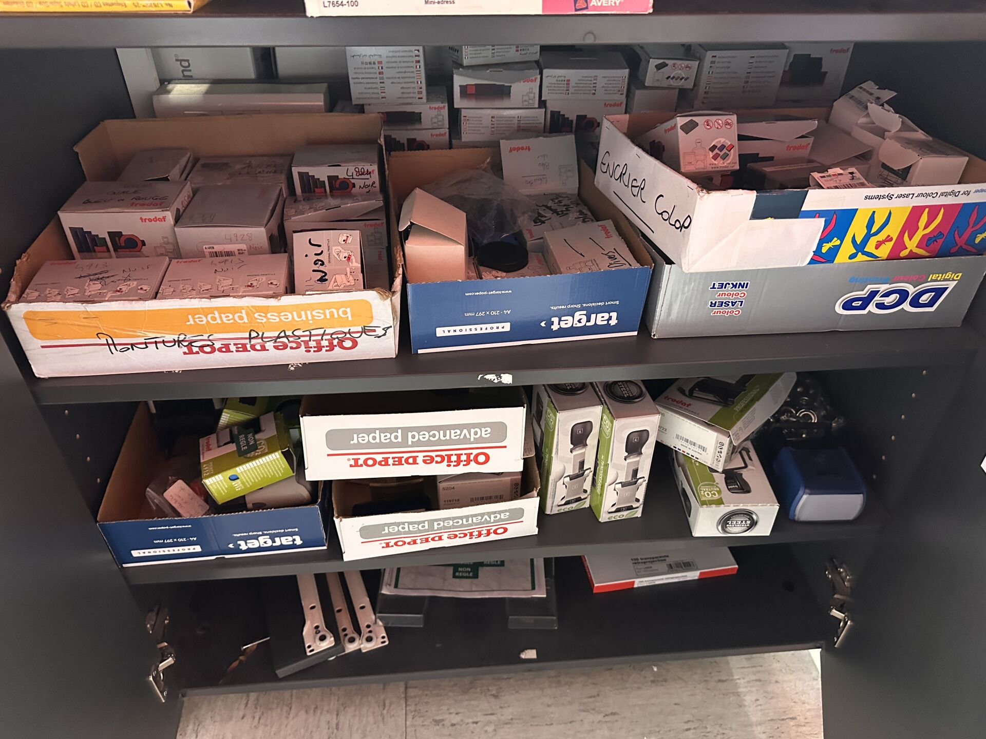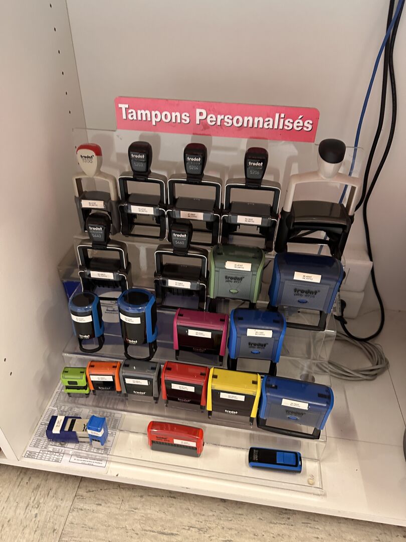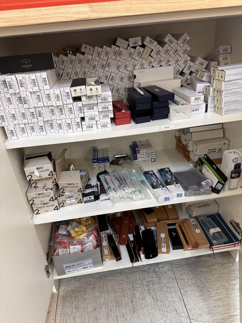 Enlèvement les 19 et 20 Février 2026 de 9h à 17h , Frais de mise à disposition 50 € TTC : Contenu des meubles de comptoir comprenant fournitures pour relieuses (spirales) , feuilles pour plastifieuses, papiers divers de différents coloris, fournitures pour relieuse thermique, tampons et cassettes d'encrage, stylos plume PARKER, stylos PENTEL, stylos OBERTHUR, cartouches d'encre BIC et recharges divers, boitiers, etc…