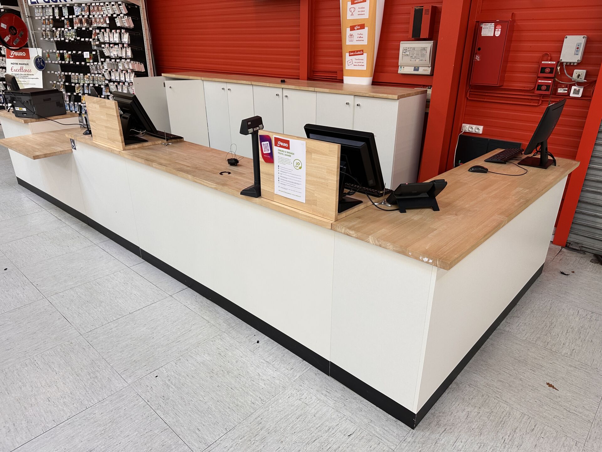 Enlèvement le 23 Février 2026 de 9h à 17h , Frais de mise à disposition 50 € TTC : Ensemble de mobilier de comptoir/caisse comprenant 6 modules plateau bois à étagère (200X55X106 cm), 6 modules assortis à 2 portes (100 X 55 X 106 cm). On y joint, 2 îlots mélaminé gris et piètement métal à tiroirs et à portes (110X110X104 cm);, Ensemble de mobilier de comptoir/caisse comprenant 5 modules plateau bois à étagère (2 en 203 X 55 X91- 2 en 100 X 55 X 91, et 1 en 100 X 85 X 76 cm), 4 modules assortis à 2 portes (100 X 55 X 120 cm). 3 chaises haute: 1 tournante tissus et filet noir, 1 tabouret bois/métal et 1 tabouret tournant de comptoir,
