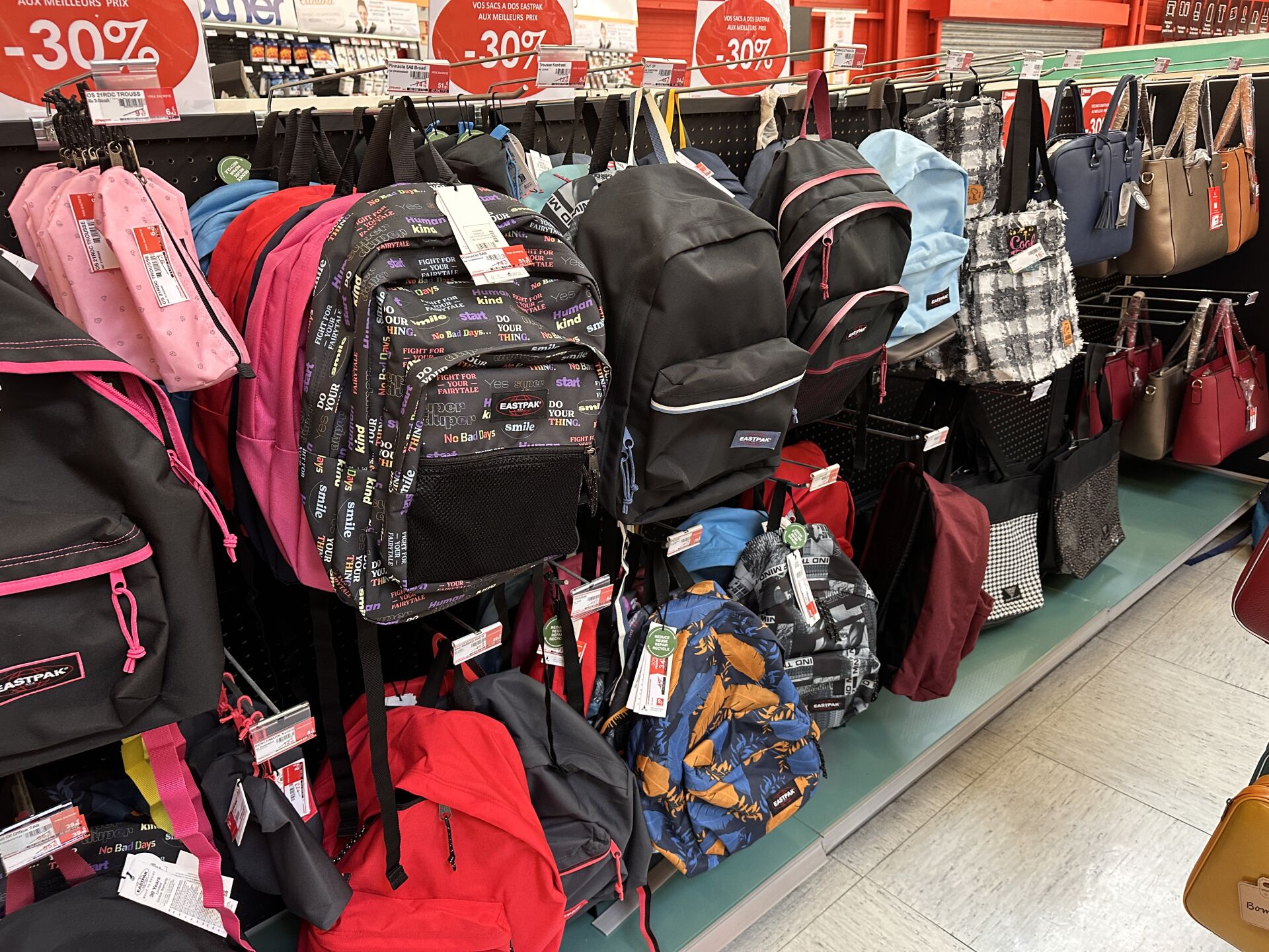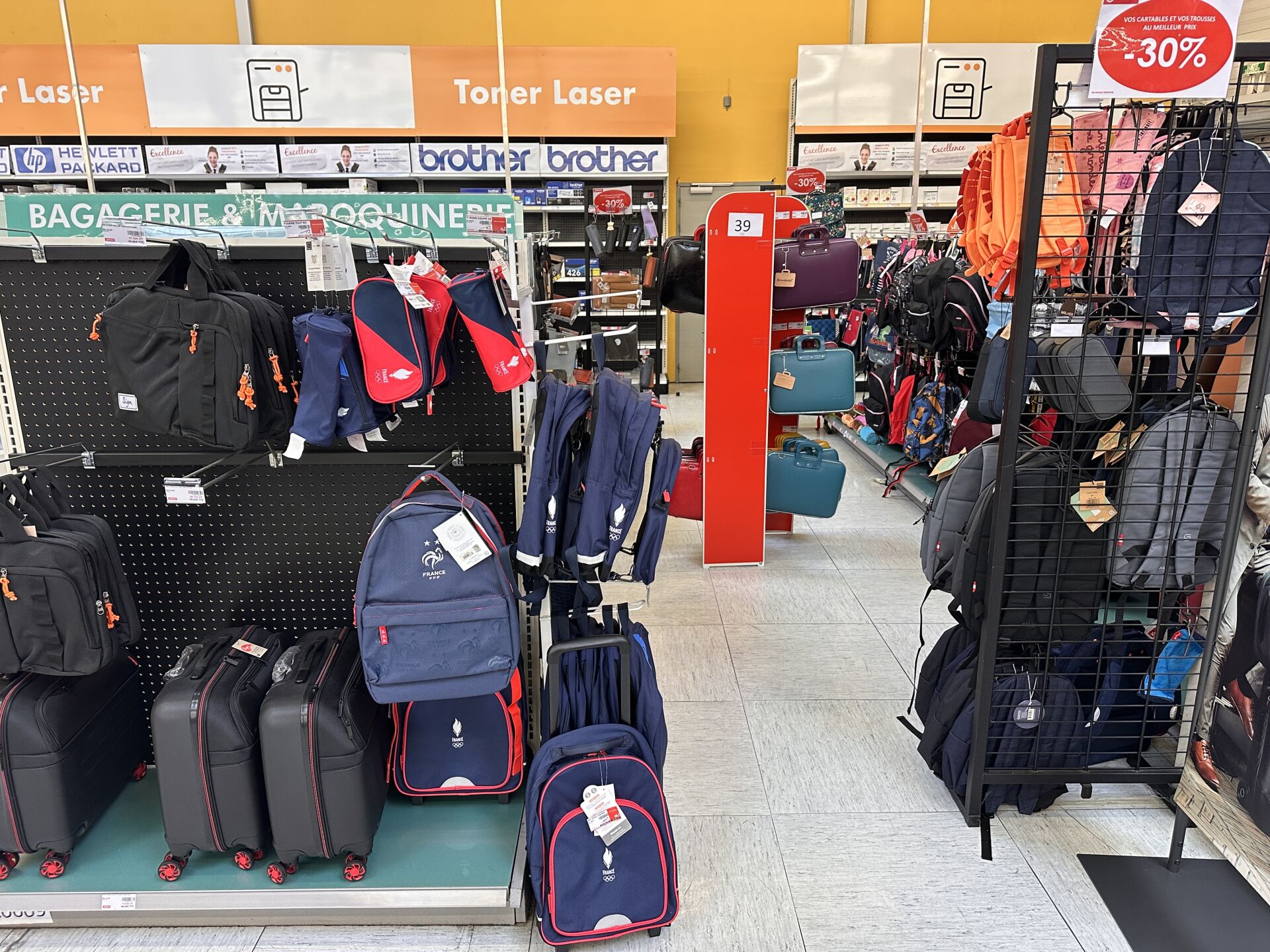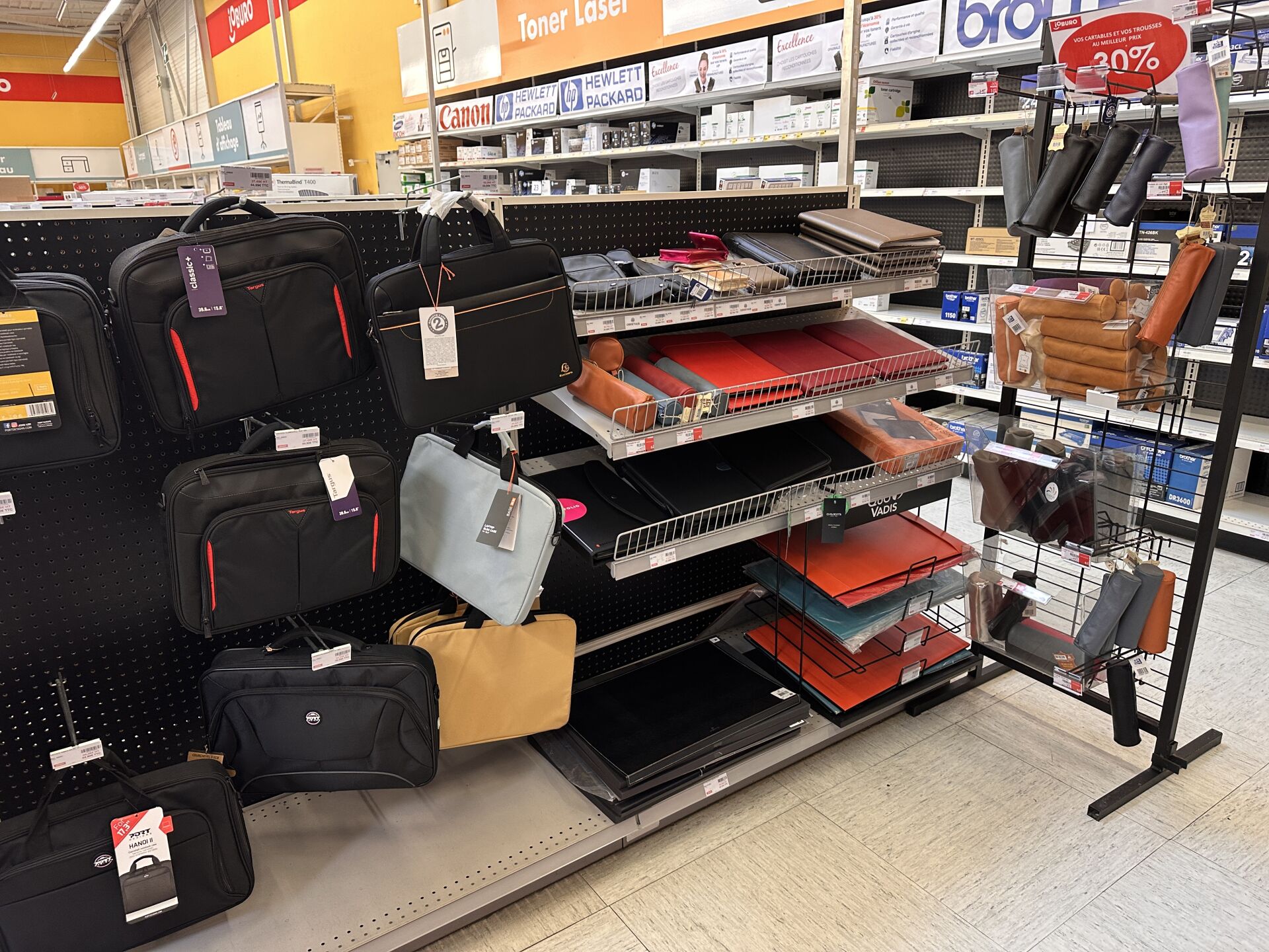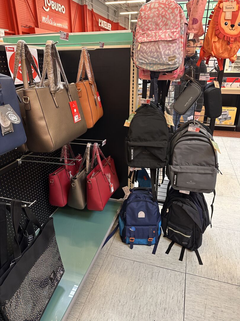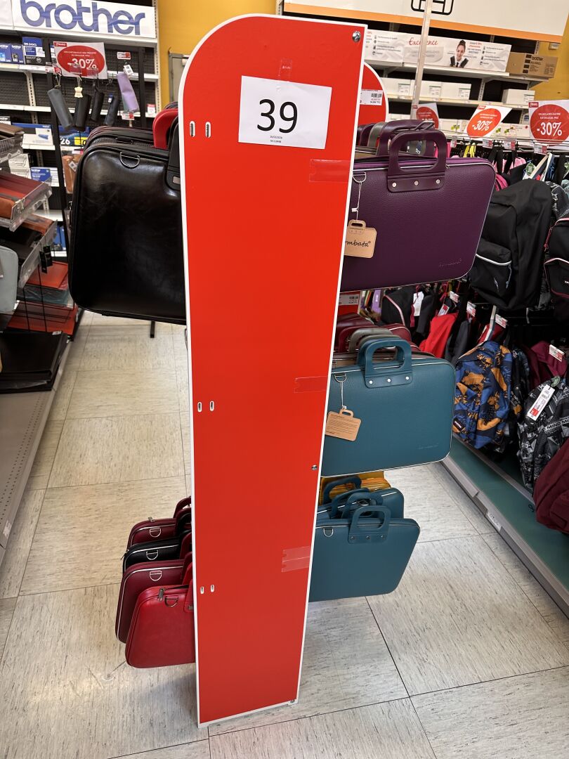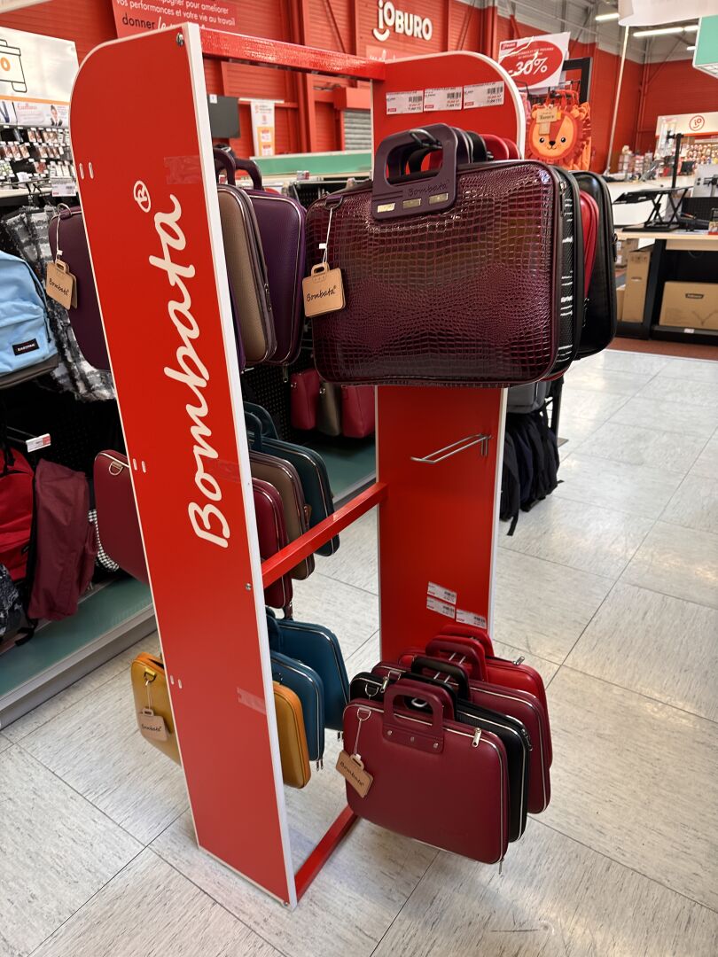 Enlèvement les 19 et 20 Février 2026 de 9h à 17h , Frais de mise à disposition 50 € TTC : Sur 1 présentoir (vendu avec), 1 stock de 19 sacoches et malettes BAMBATA différents coloris et matières, Sur 1 travée de gondole, 1 stock de sacs et sacoches (environ 50 articles) et trousses (environ 60) TARGUS, PORT DESIGNS, BASE XX, EXACOMPTA, et sous-main OBERTHUR, etc…, Sur 1 travée de gondole, 1 stock de sacs cabats (environ 15 articles), à dos et cartables (environ 60 articles), dont EASTPACK, OBERTHUR, TANN'S, INTERDIT DE ME GRONDER, WALKER, … Et environ 50 trousses pour enfants