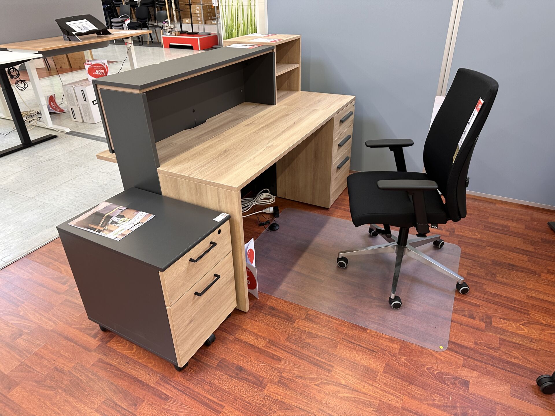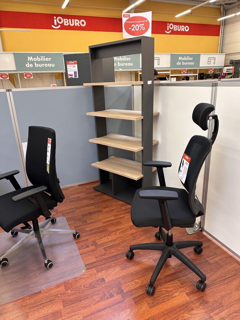 Enlèvement les 19 et 20 Février 2026 de 9h à 17h , Frais de mise à disposition 30 € TTC : 1 banque d'accueil droite "ZOOM" mélaminé façon chêne et gris (163X86x114cm), 1 caisson et 1 étagère assortis, 2 fauteuils tournant/roulant tissus et filet noir