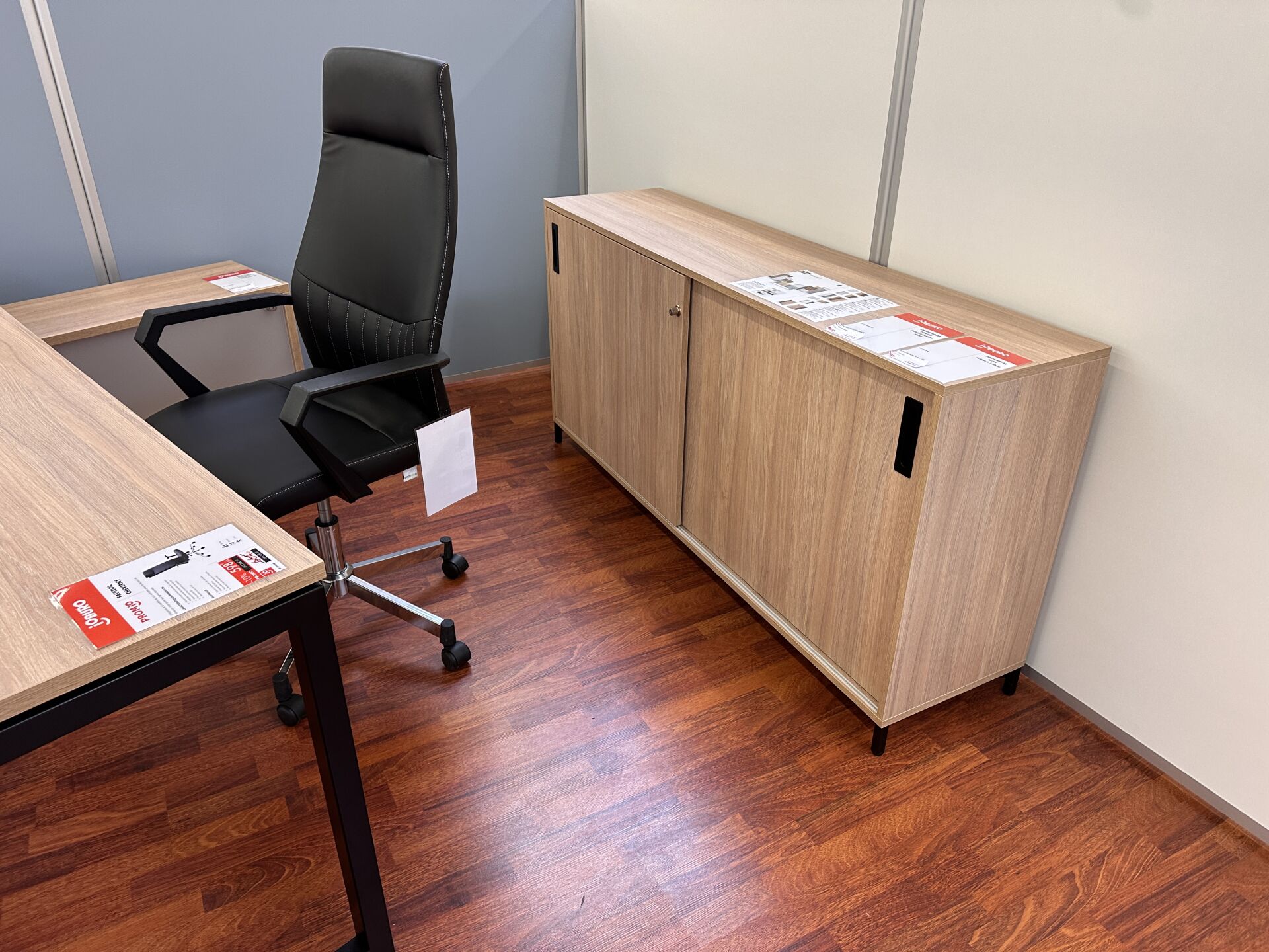 Enlèvement les 19 et 20 Février 2026 de 9h à 17h , Frais de mise à disposition 30 € TTC : 1 ensemble de bureau "ANNAKO" , table mélaminé façon bois, piètements métal noir 200X100 cm, 2 meubles bas assortis à 2 portes coulissantes (160X40 et 140X35 cm), 1 fauteuil de direction simili cuir noir, 1 chaise coque tournante PVC/tissus bleu