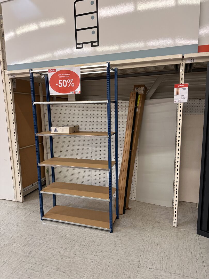 Enlèvement les 19 et 20 Février 2026 de 9h à 17h , Frais de mise à disposition 50 € TTC : Dans 9 modules de racks, 1 stock de mobilier de bureau comprenant: 1 armoire haute à rideau metal gris, 4 armoires basses à rideau metal gris ou blanc, 1 étagère cornière metal bleu et galva 6 niveaux, 3 classeurs metal à 4 tiroirs, 1 meuble bas metal noir à 3 tiroirs, 10 caissons mobiles ou fixe, metal ou melaminé, trieurs PVC et bloc trieur à tiroirs, 1 lot de 20 tapis absorbants RAINBOW différentes dimensions. On y joint 1 écran pour vidéoprojecteur