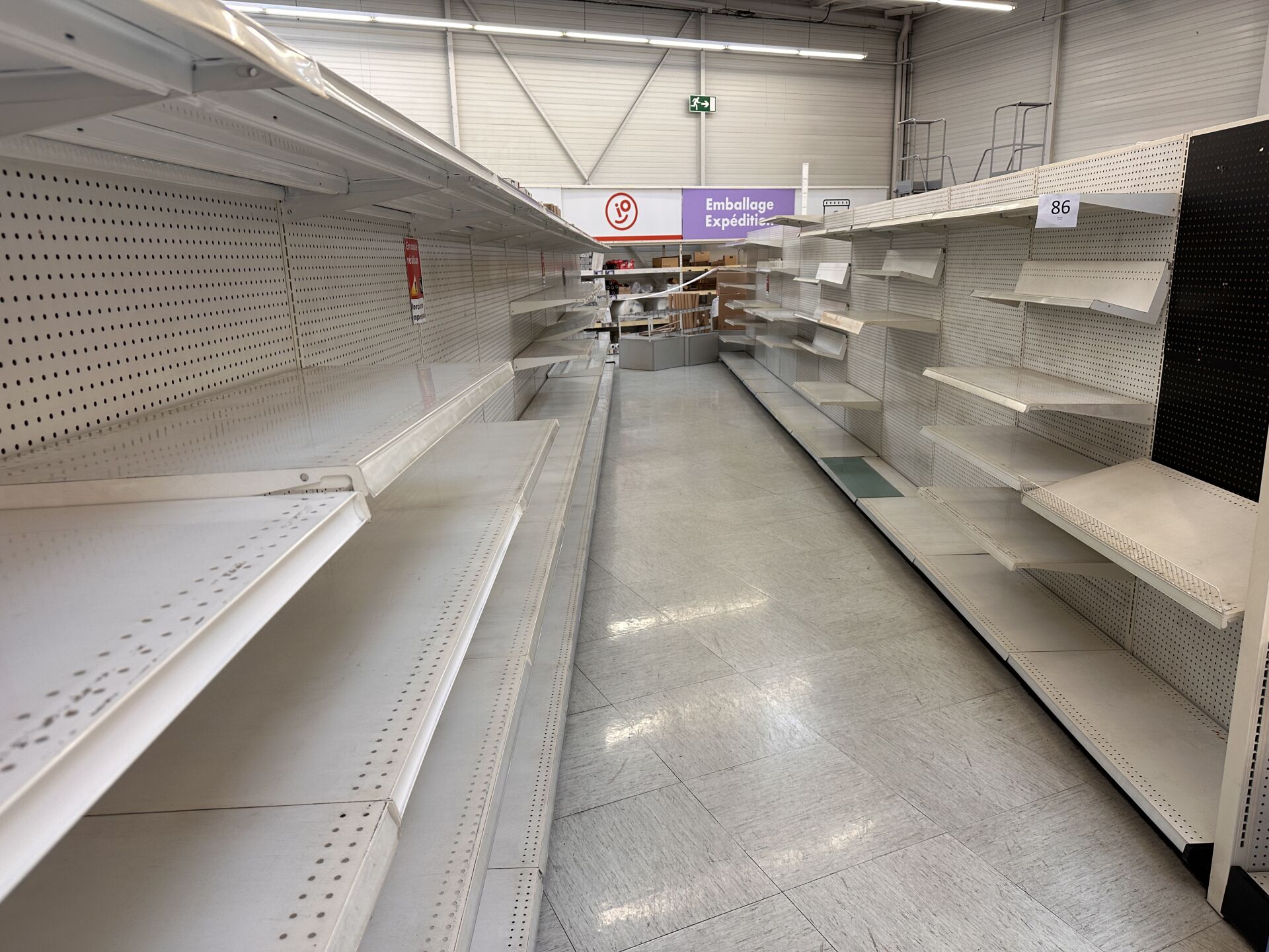Enlèvement le 23 Février 2026 de 9h à 17h , Frais de mise à disposition 50 € TTC : 1 aménagement de magasin comprenant : - 1 travée 5 modules de gondoles métal gris avec pics d'affichage - 1 travée 3 modules d'étagères présentoirs gondoles 6 niveaux métal blanc - 1 travée de gondoles 8 modules 7 niveaux - 1 travée 7 modules composée d'étagères grillagées, de plan ou mélaminé - 1 travée 7 modules pour présentation de mobilier métal blanc - 1 travée 2 modules pour présentation de mobilier métal blanc - 1 travée 7 modules pour présentation de mobilier métal blanc - 1 travée 12 modules d'étagères grillagées 4 niveaux avec présentoirs gondoles perforés tiges ou étagères - 1 travée 5 panneaux rainurés mélaminé habillage façon bois équipement tiges et l'une équipement gondoles métal blanc - 1 travée en ilot central de gondoles métal blanc avec 1 étagère tête de gondoles et 2 fois 10 modules double face métal blanc - 1 travée en ilot haut 2 fois 12 modules double face avec 1 étagère en tête de gondoles métal blanc - 1 travée en ilot haut 2 fois 12 modules double face avec 1 étagère en tête de gondoles métal blanc - 1 travée en ilot haut 2 fois 12 modules double face avec 1 étagère en tête de gondoles métal blanc - 1 travée en ilot haut 2 fois 11 modules double face avec 1 étagère en tête de gondoles métal blanc - 2 ilots mi-hauts de présentation pour le matériel informatique comprenant 2 fois 6 modules métal gris double face et 1 étagère en tête de gondole perforée métal gris - 2 ilots mi-hauts de présentation pour le matériel informatique comprenant 2 fois 4 modules métal gris double face et 1 étagère en tête de gondole perforée - 2 ilots mi-hauts de présentation pour la maroquinerie scolaire 2 fois 4 modules double face métal gris avec étagères de gondoles perforées mélaminé noir + accessoires de gondoles dans la réserve 3 tables de présentation en ilot central plateau mélaminé habillage façon bois piètement métal noir perforé (1 en métal noir) 3 étagères en ilot de présentation métal blanc et mélaminé perforé noir