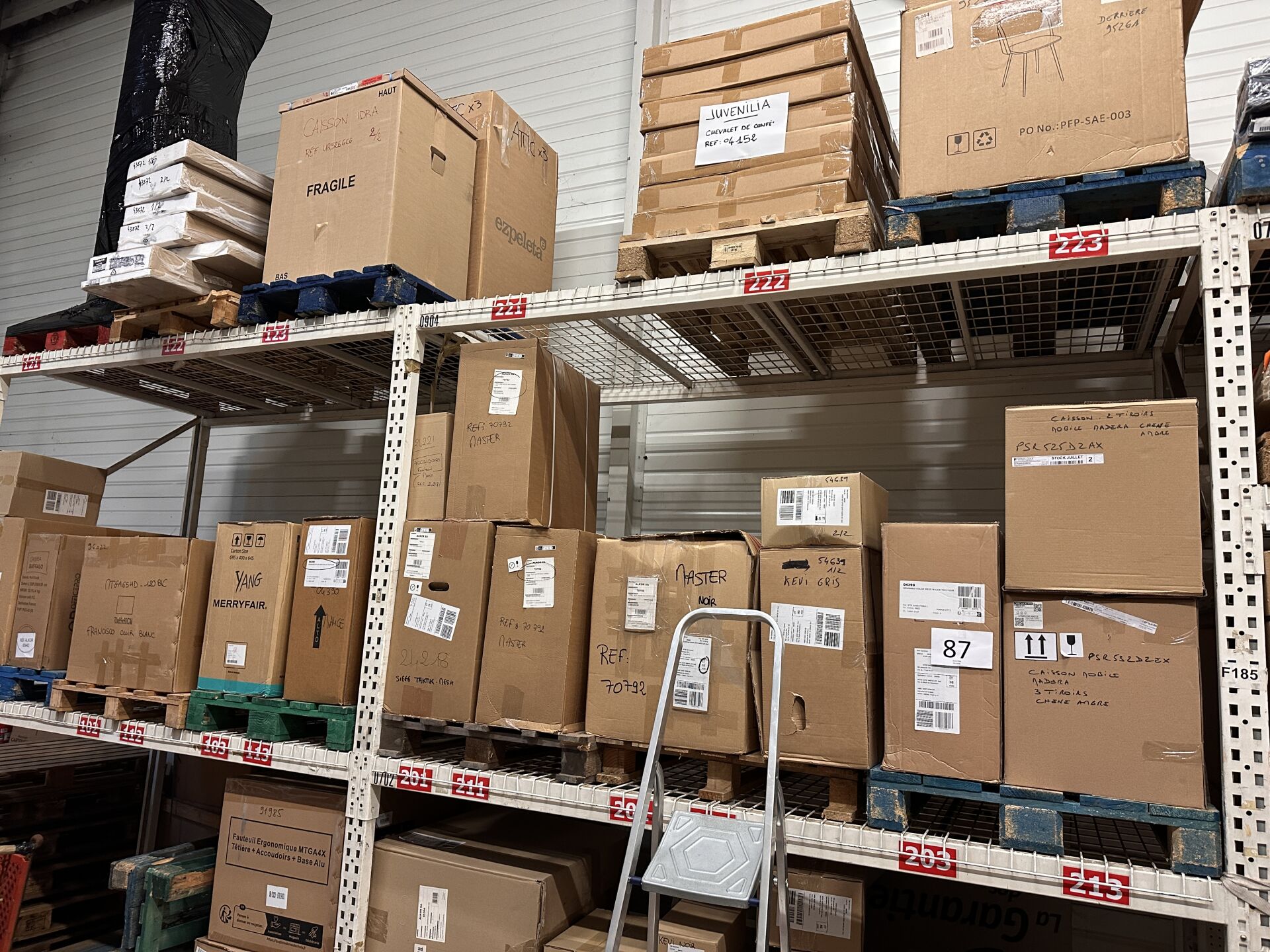 Enlèvement les 19 et 20 Février 2026 de 9h à 17h , Frais de mise à disposition 50 € TTC : Contenu des stocks de la réserve comprenant mobilier de bureau emballé, accessoires de mobilier, accessoires de bureau (tableaux, éléments de fauteuils et chaises, etc…(sur environ 30 palettes)