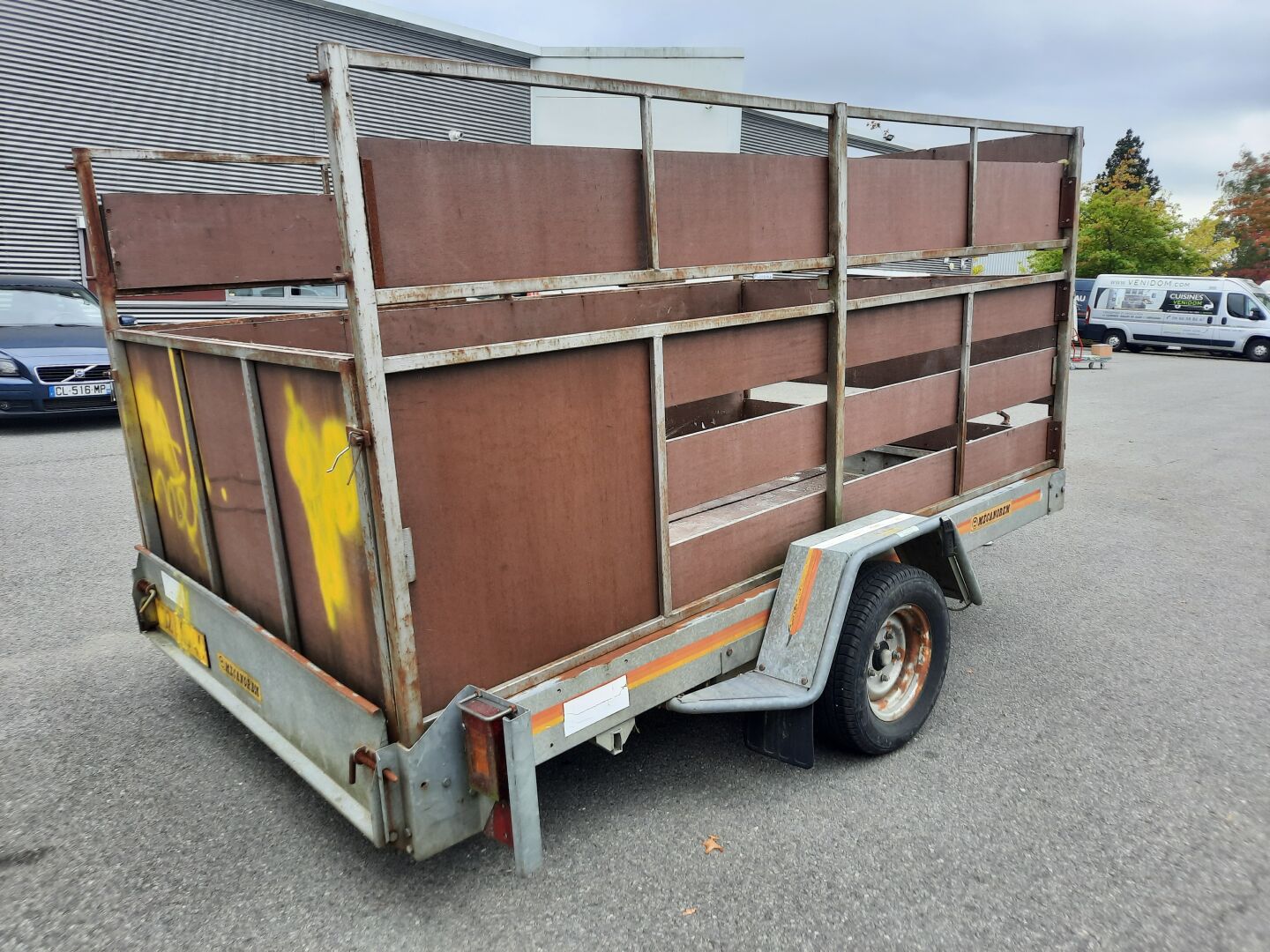 FIV AVEC NO DE FORMULE PTC : 1100KG RIDELLES SURELEVEES / REMORQUE TAGUEE A L'ARRIERE. FEUX DE GABARIT CASSES SUR LE COTE G ET D. CABLE DE LA PRISE ELECTRIQUE DENUDE. FEUX AR HS DIMENSIONS HORS TOUT:LONG. ENVIRON 4.5 M LARG.2.40M.LONG DU PLATEAU :3.10 M LARG.1.80 M.