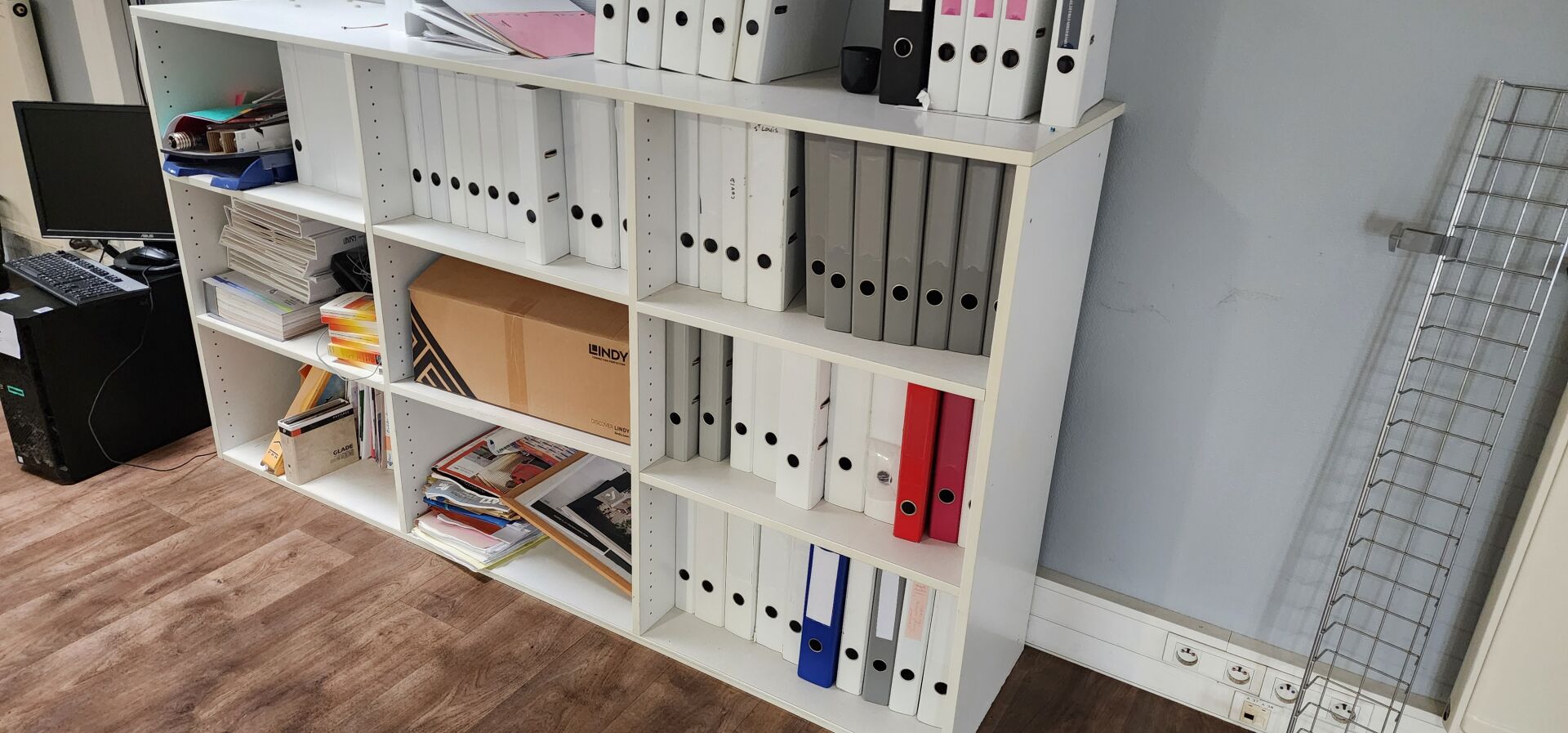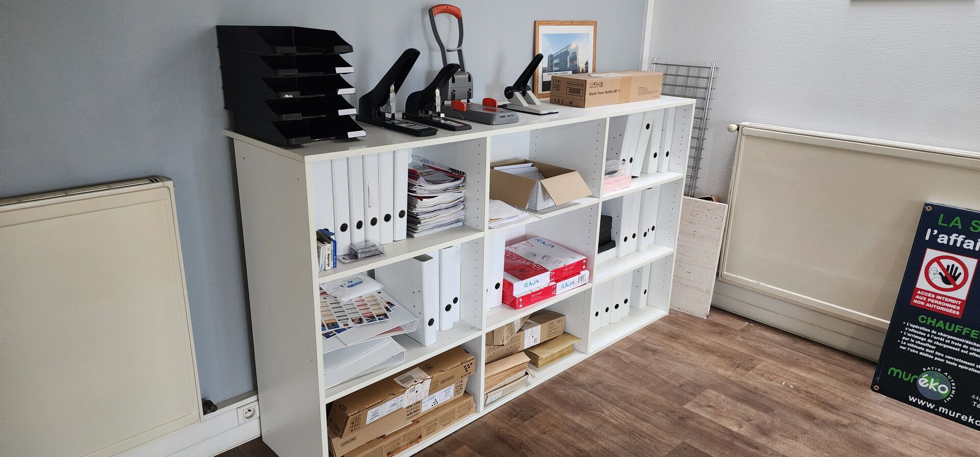 1 canapé cuir blanc et noir 2 places largeur 150 cm 1 tapis, 10 cadres décoratifs, 1 pendule, 1 distributeur de gel hydroalcoolique 1 guéridon métal et mélaminé blanc diam 105 m 2 meubles mélaminé à hauteur d'appui 200 x 45 cm 2 chaises simili cuir noir 1 chaise et 1 siège dactylo vétustes 1 petit lot de matériel et stock résiduel de fournitures de bureaux dont plastifieuse GBC QuickStart H320, agrafeuses, etc...