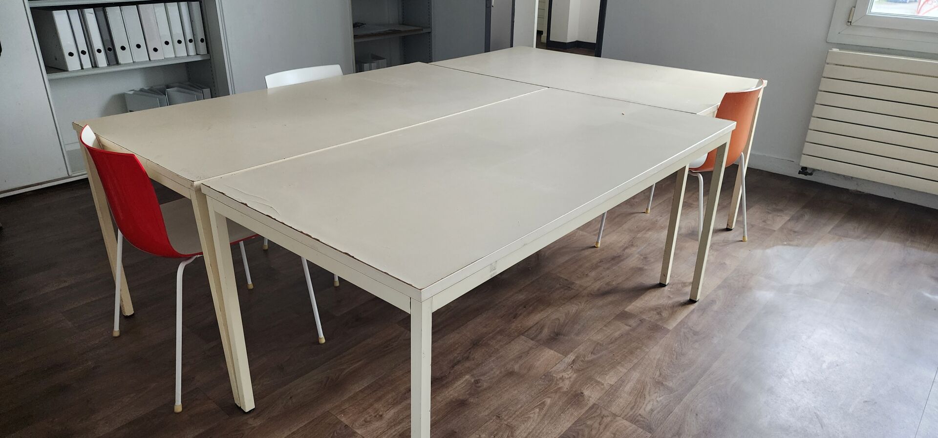 3 tables métal et mélaminé beige 160 x 80 cm et 140 x 80 cm (état moyen) 1 bureau métal et mélaminé blanc 160 x 160 cm 1 meuble mélaminé à hauteur d'appui 250 x 50 cm 5 chaises (mauvais état), 1 lot de classeurs blancs