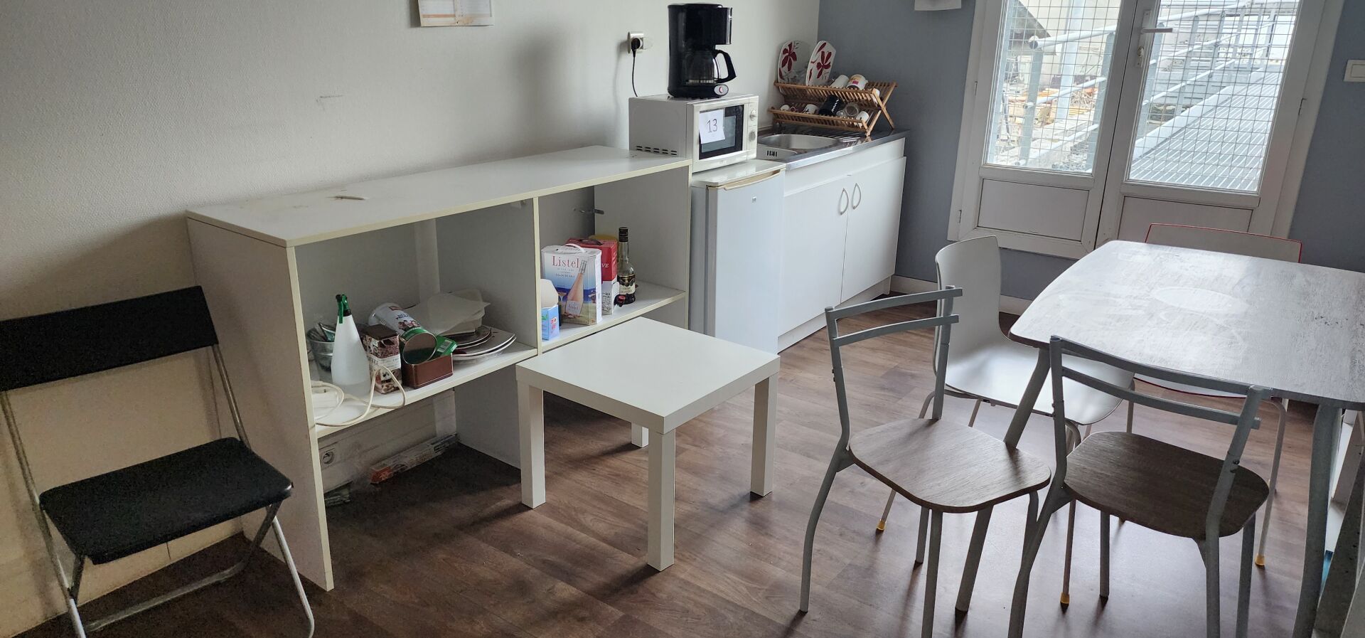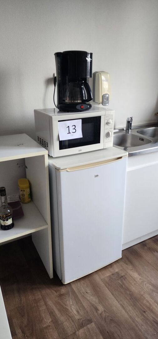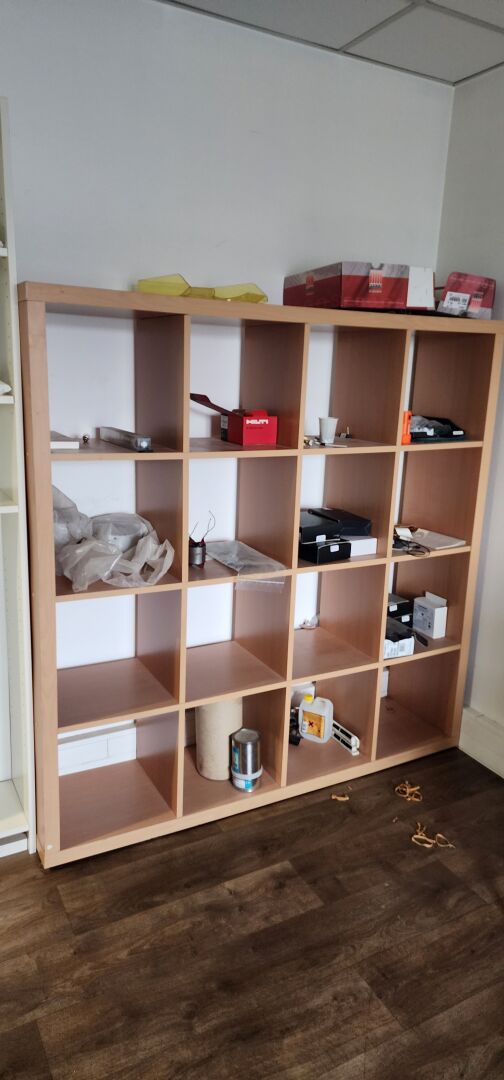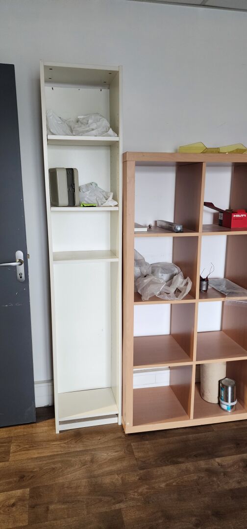 1 table métal blanc et mélaminé bois 110 x 70 cm 5 chaises dépareillées, l'une accidentée 1 table basse Ikea mélaminé blanc 1 bibliothèque Ikea 16 cases mélaminé bois 160 x 40 x 160 cm 2 meubles mélaminé blanc 1 réfrigérateur table-top LISTO 1 micro-ondes LISTO, 1 cafetière
