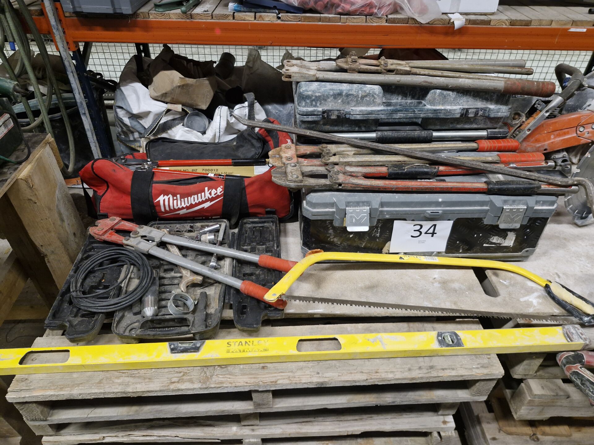 1 petit lot d'outillage à main comprenant : 2 caisses à outils, 1 sacoche MILWAUKEE, 1 pince à sertir, 4 coupe-boulons, 1 niveau à bulle STANLEY, 1 scie ...
