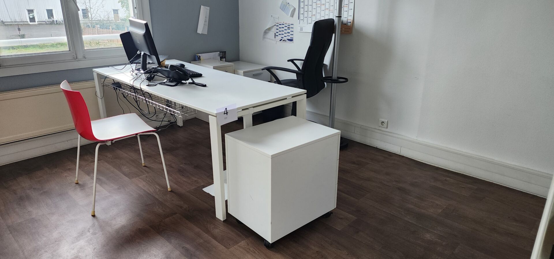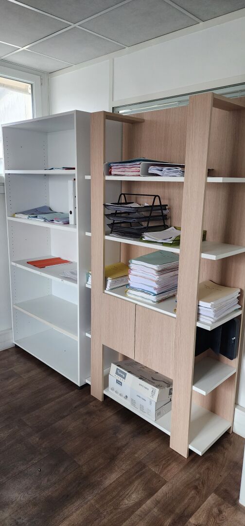1 bureau métal et mélaminé blanc 180 x 80 cm 1 caisson mobile métal blanc 2 caissons métal blanc à tiroirs 1 fauteuil direction mauvais état 1 chaise 1 porte-manteau 2 bibliothèques mélaminé dépareillées 100 x 44 cm