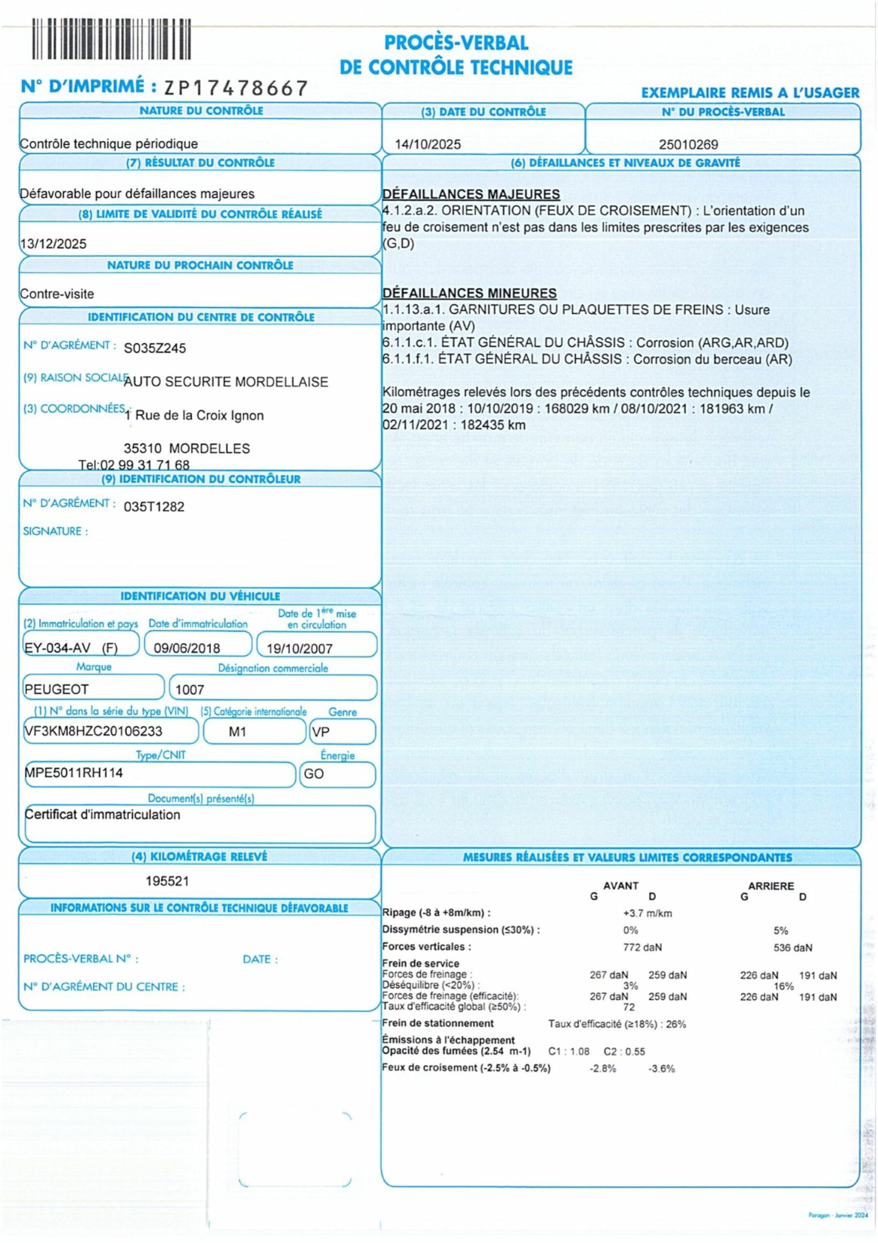 BOITE MANUELLE 5 VITESSES VITRES ET RETRO ELECTRIQUES PORTIERES ELECTRIQUES COMMANDES AU VOLANT CLIMATISATION SIEGES TISSU BLEU FROTTEMENTS, RAYURES DEFAILLANCES MAJEURES : MAUVAISE ORIENTATION DES FEUX DE CROISEMENT DEFAILLANCES MINEURES : GARNITURES OU PLAQUETTES DE FREINS USURE IMPORTANTE AV CORROSION DU CHASSIS ARG AR ARD ET DU BERCEAU