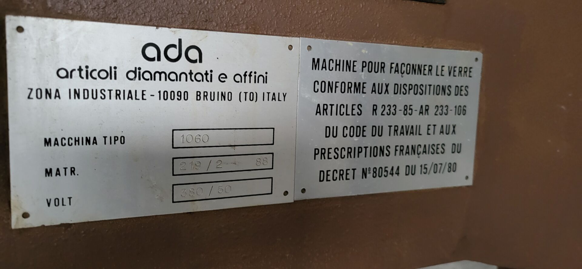 Perceuse à verre ADA 1060, en panne N/S : 219/2 88 320 x 140 cm