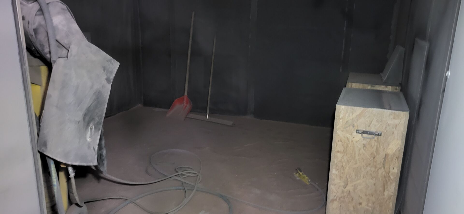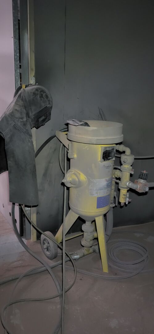 Cabine de sablage démontable, environ 3.5 x 3.3m avec sableuse NOREXO 60L NOB 60 à commande au pied (année 2015) NS : 87228 avec cagoule de protection (prévoir l'étanchéité du plafond)