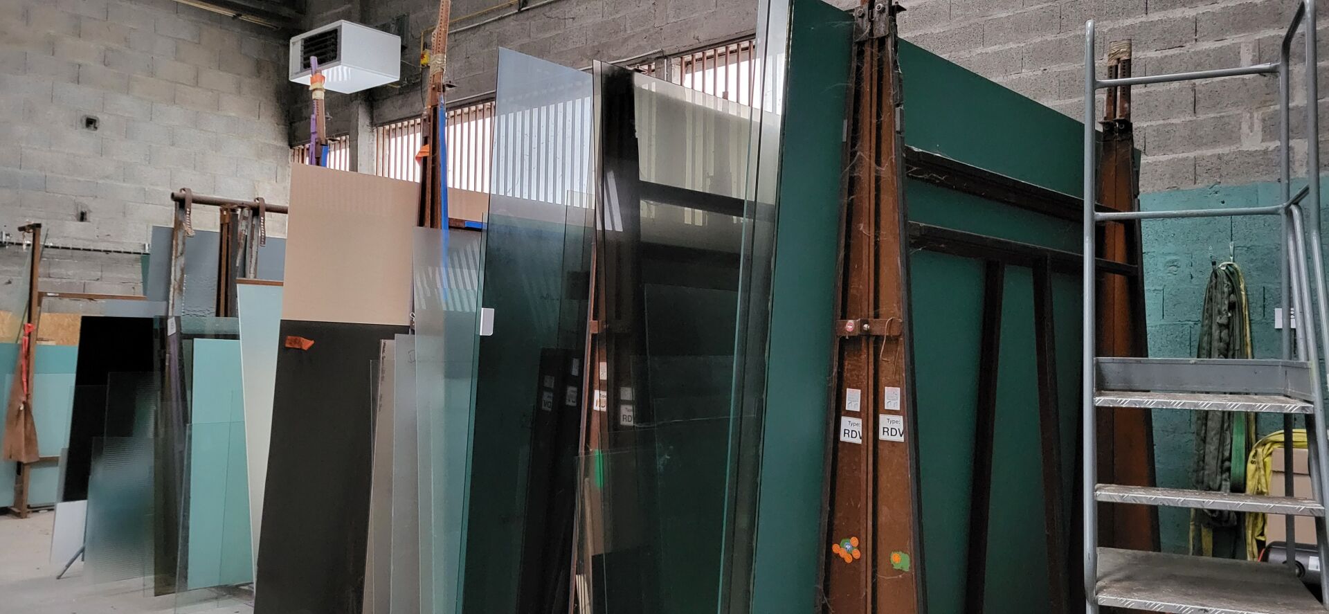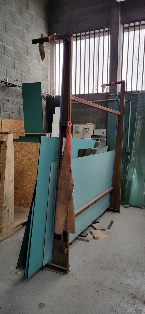 7 chevalets acier pour panneaux de verre, diverses dimensions, dits "chevalets perdus" vendus avec le contenu de plaques de verre de différentes tailles et couleurs