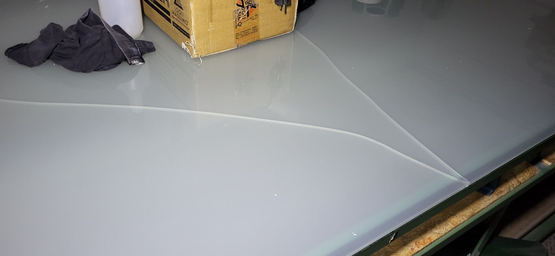 Table de travail en acier mobile, plateau verre félé dimensions : 255 x 120 cm
