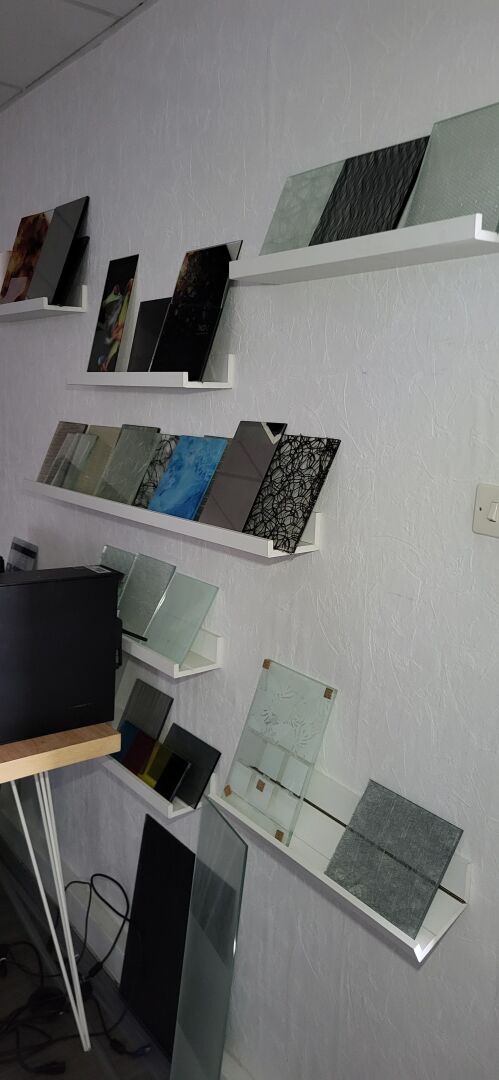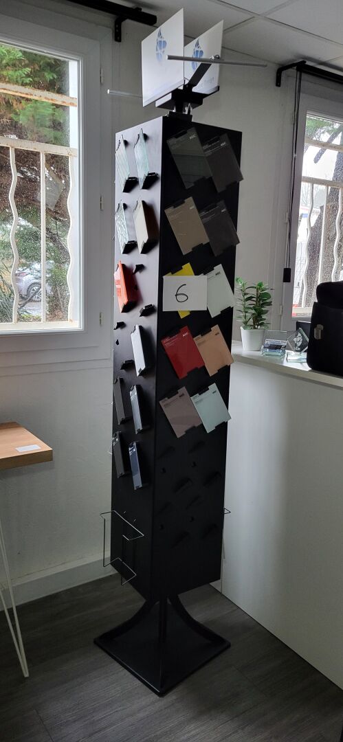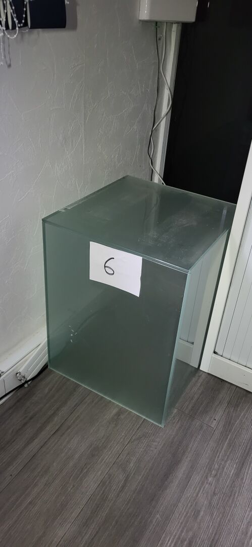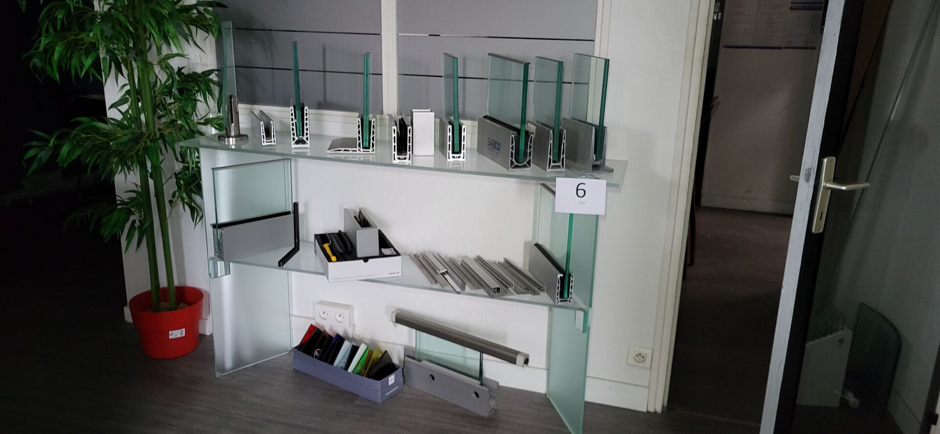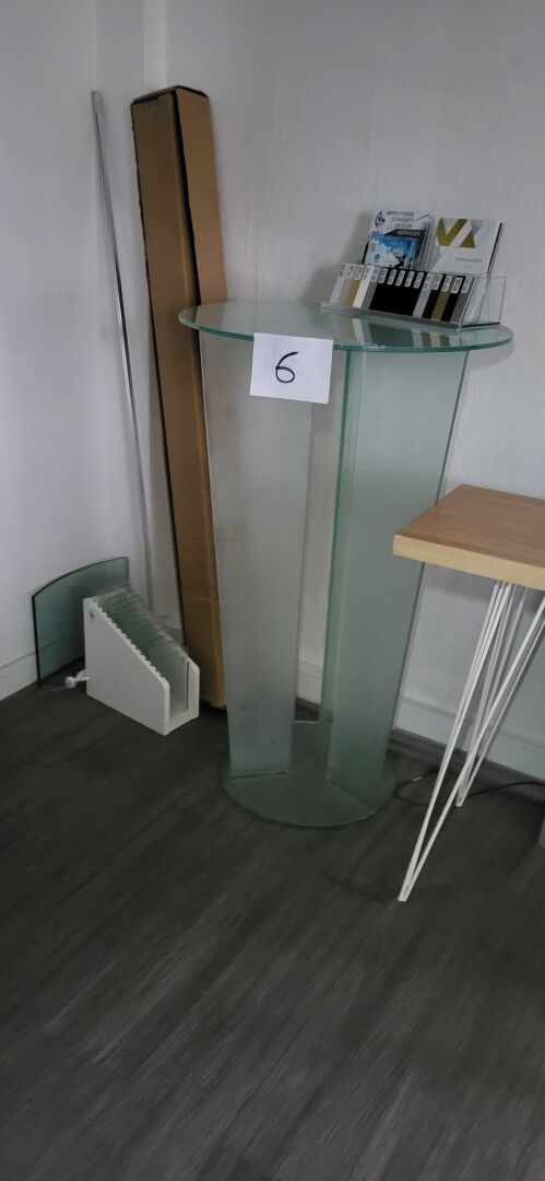 1 guéridon mange debout verre dépoli diam 70 cm 1 console verre dépoli 2 plateaux 150 x 35 x 91 cm 1 caisson verre dépoli 1 présentoir à échantillons tournant électrique 1 lot d'échantillons de verres