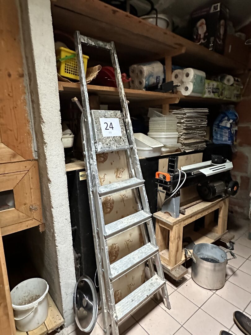 Escabeau cinq marches et Fendeuse à buches, électrique sur châssis roulant WOODSTAR modèle LH520, de 2014.
