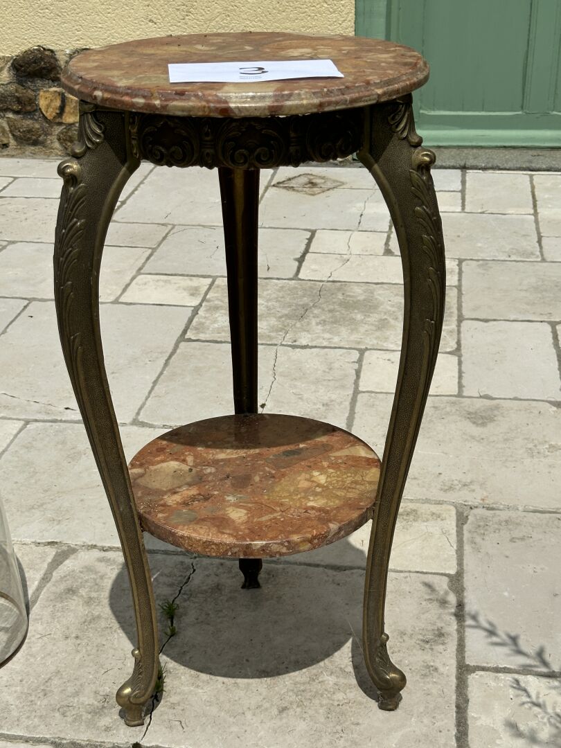 Guéridon à plateau circulaire, les montants sinueux en métal. Style Louis XV.