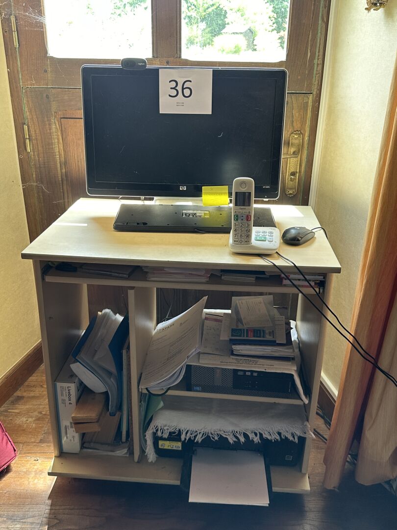 Configuration informatique (ancienne) comprenant : - Unité centrale DELL, - Écran HP, - Webcam LOGITECH - Clavier - Souris HP. On joint : Téléphone sans fil sur base GIGASET modèle E290A.