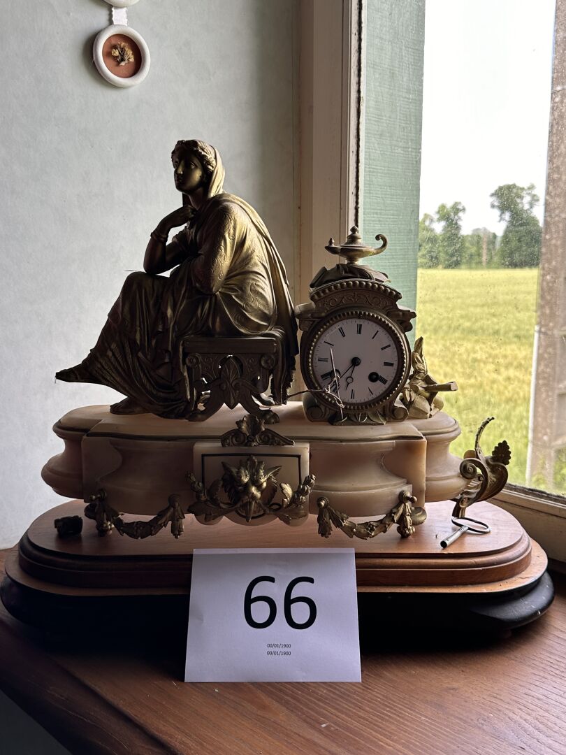Pendule en albâtre et régule à la vestale. Vers 1840.