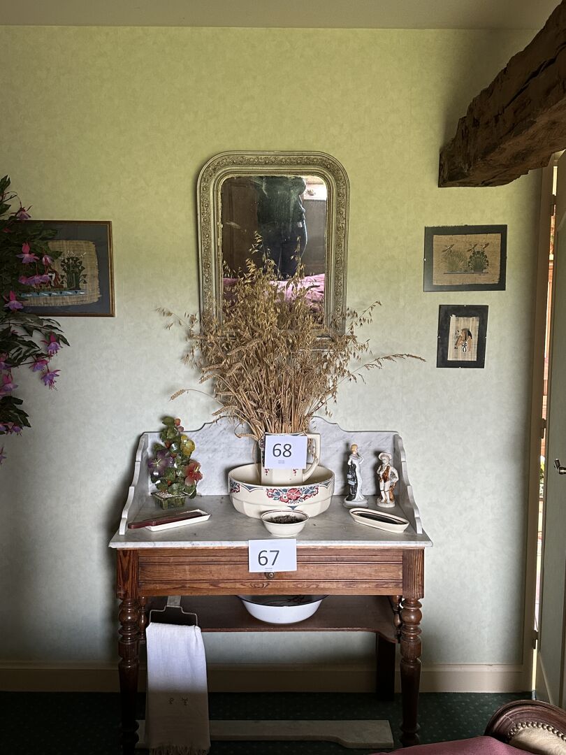 Meuble de salle de bain, en pitchpin, ouvrant à un tiroir, dessus de marbre blanc. Début XXe siècle. On joint : Miroir cintré à décor en relief de roses.