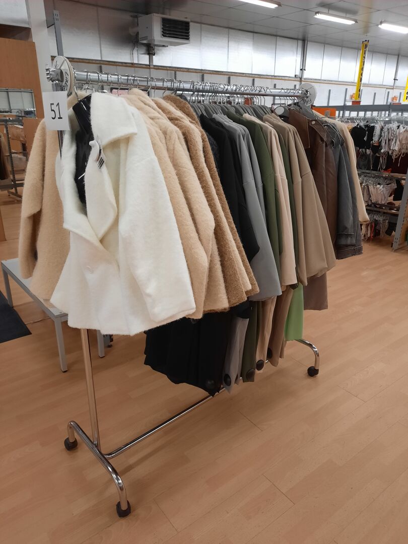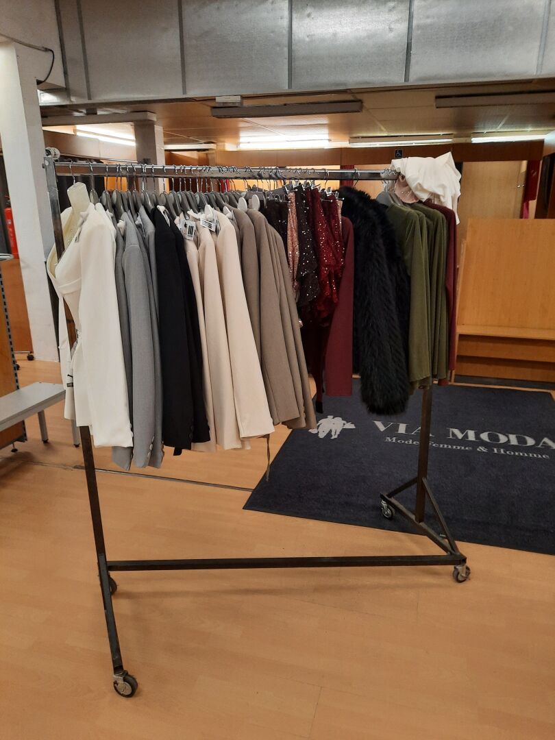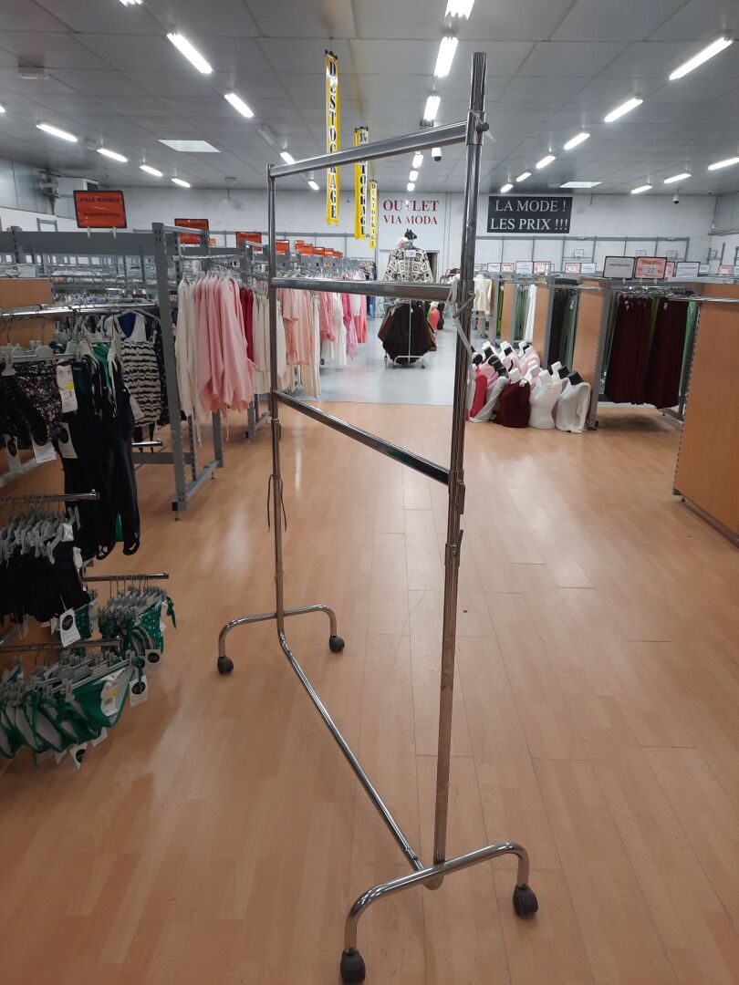Ensemble de supports et portants comprenant : Environ 180 supports de cintres en métal chromé, longueur 1 m Environ 50 présentoirs grilles en métal chromé. Dim. : 100 x 36 cm Environ 63 montants doubles faces en métal laqué gris. Dim. : 174 x 103 cm Environ 31 cadres au modèle. Dim. : 170 cm x 103 cm Agencement de magasin en métal laqué gris et mélaminé ton bois comprenant : 161 montants d'environ 2.5 m dont une centains coupés 161 pieds 199 supports de cintres en métal chromé 84 présentoirs doubles faces, au modèle, hauteur 1.5 n, largeur 1.03 m et longueurs 1.2 m ; 3 m et 6 m
