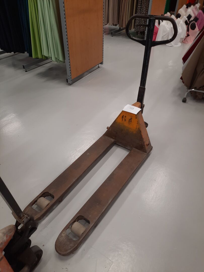Transpalette sans marque apparente en métal laqué orange, sans capacité apparente