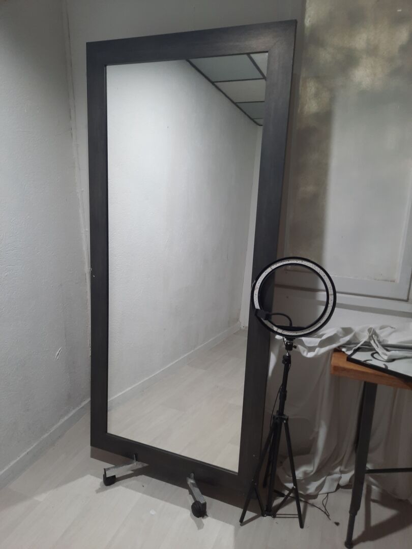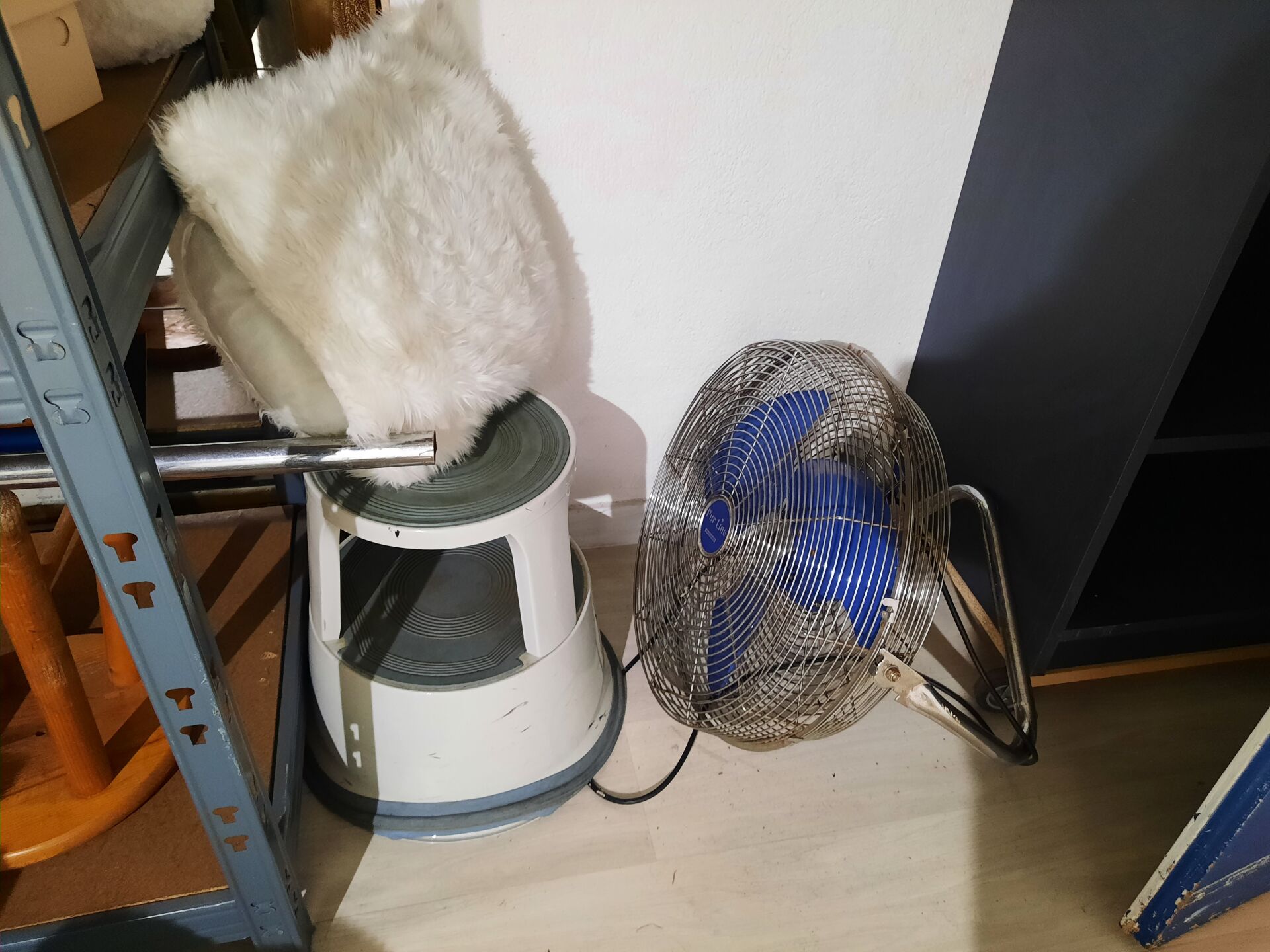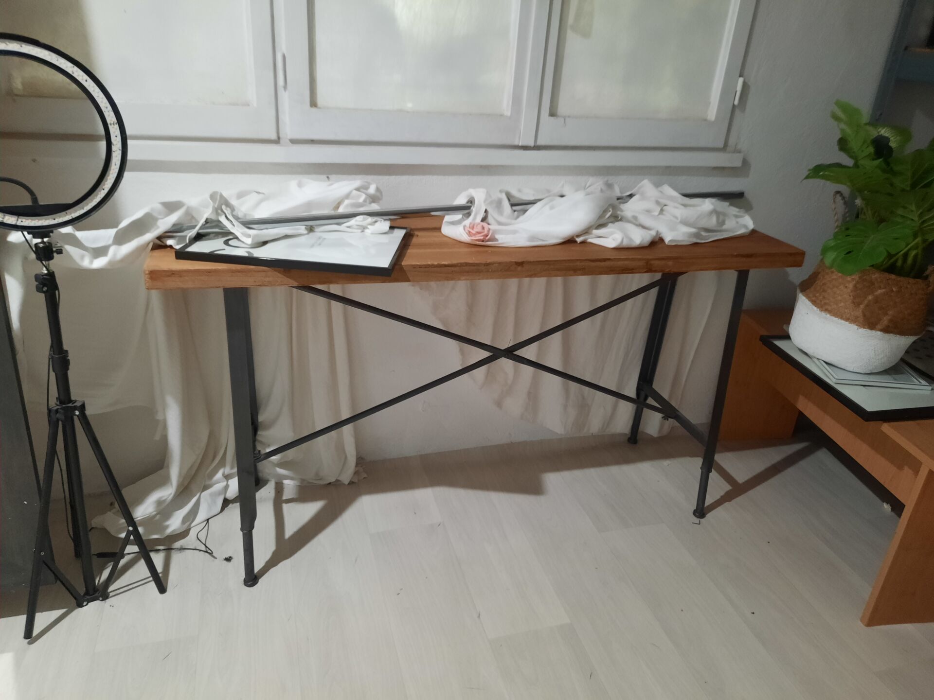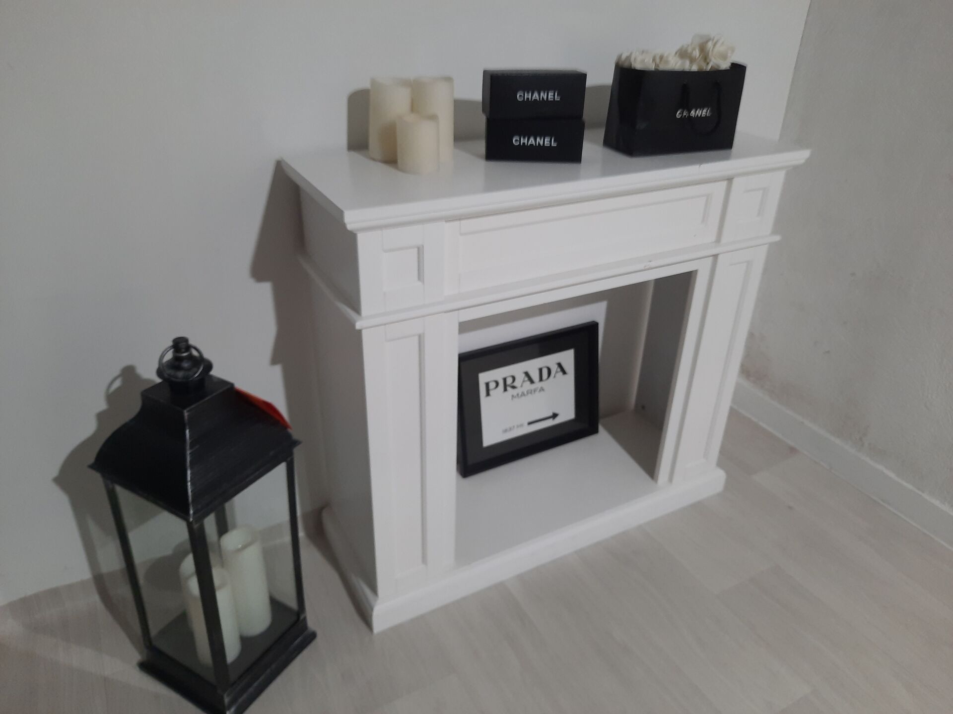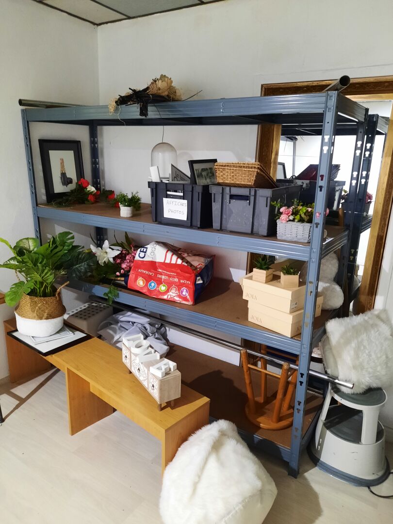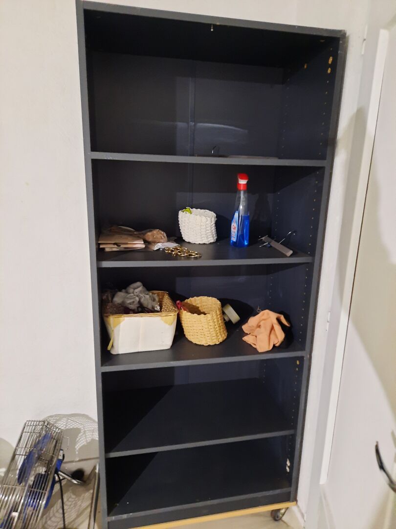 Ensemble de mobilier comprenant : Étagère sur roulettes en mélaminé gris, mauvais état Entourage de cheminée en bois laqué blanc. Dim. : 34 x 100 x 91 cm Console en bois naturel et métal laqué noir. Dim. : 130 x 40 x 788 cm Miroir en bois laqué gris On joint : Vase, cadres décoratifs, lanterne, tabouret, banc, ventilateur, étagère en métal et bois, globe, éléments de décoration Ventilateur sur pied, cassé Lampe led circulaire sur pied