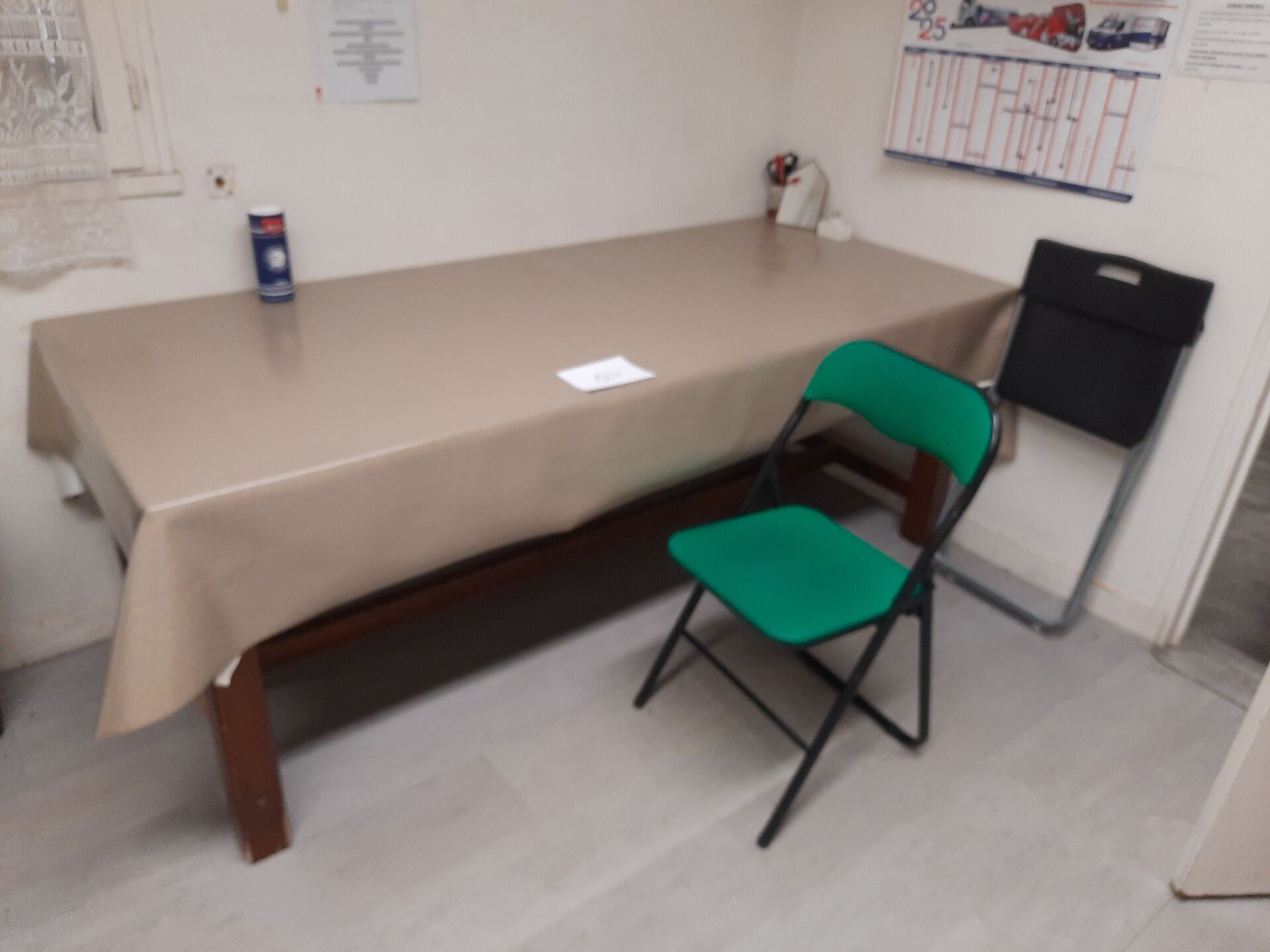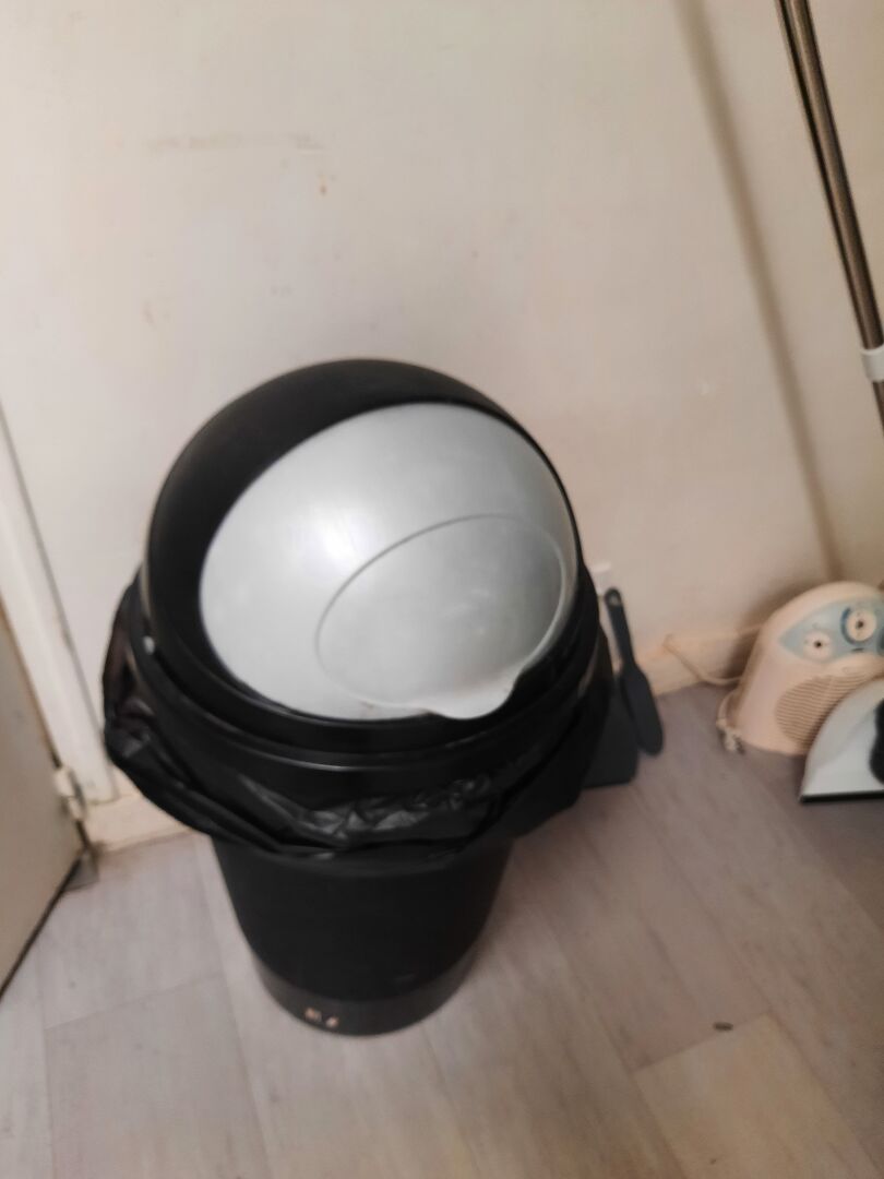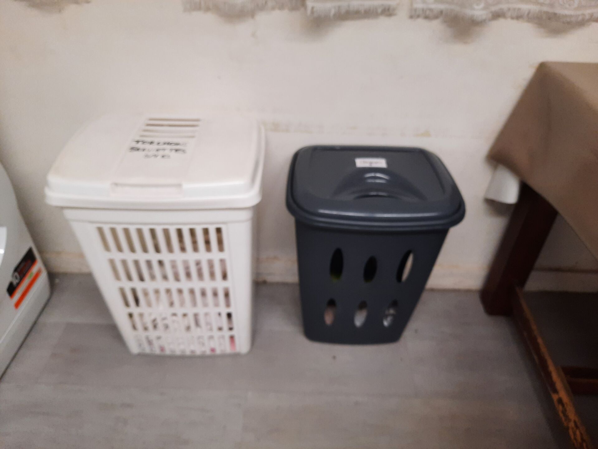 2 chaises pliantes dépareillées Table en bois naturel Poubelle en PVC noir et gris 2 bacs à linge Vaisselle