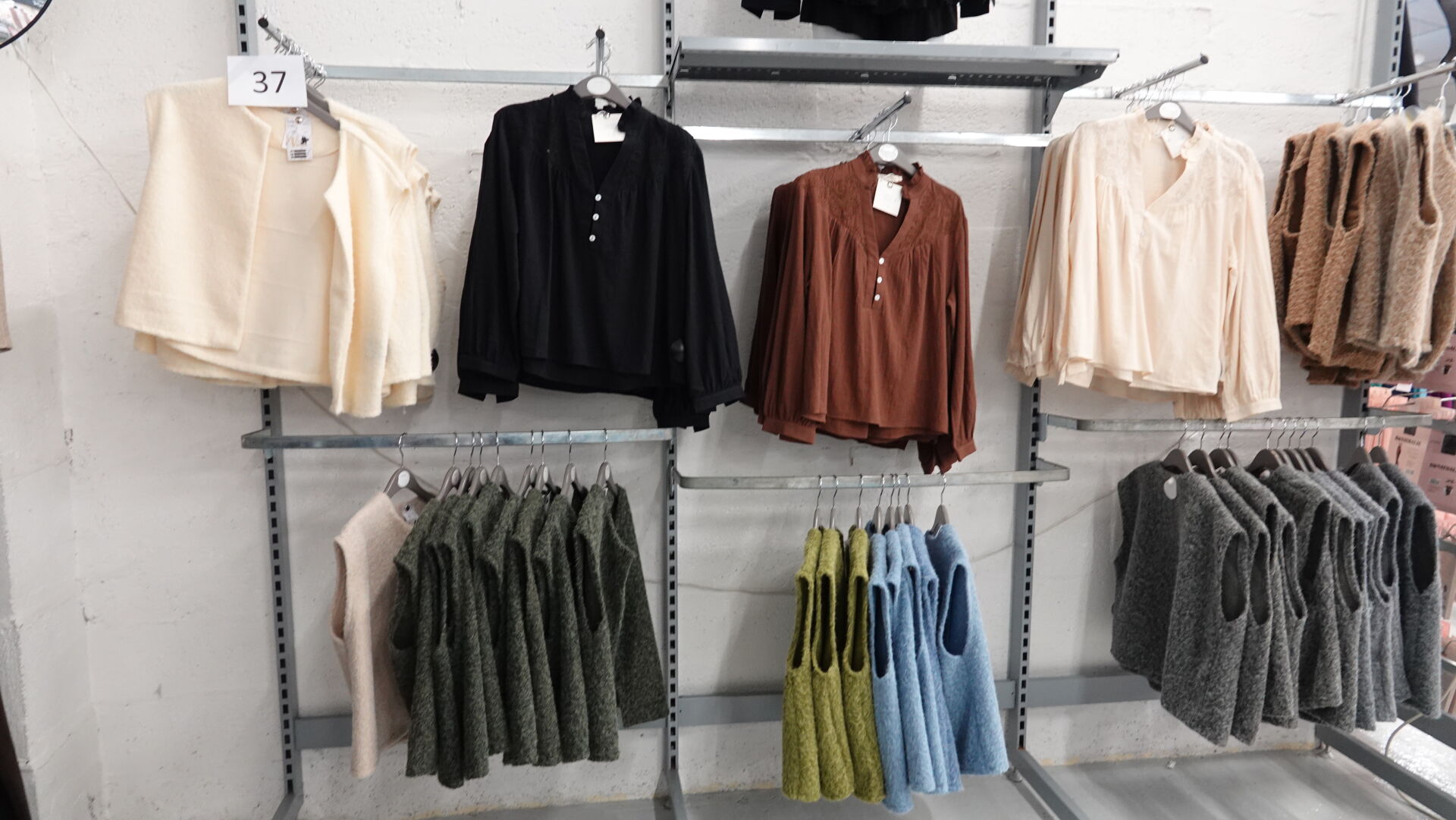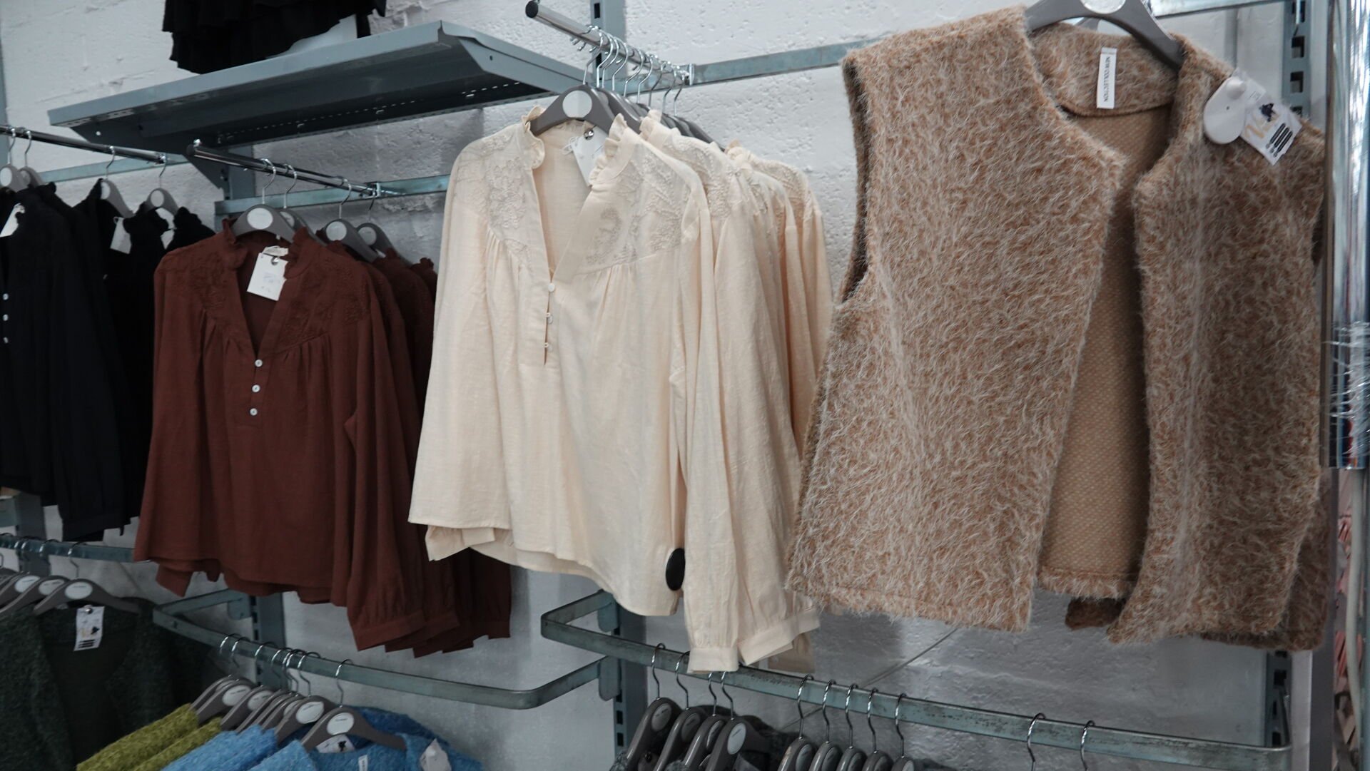 Ensemble d'environ 121 manteaux longs, gilets sans manche, chemisiers et pantalons/jeans pour femme, tailles et coloris divers