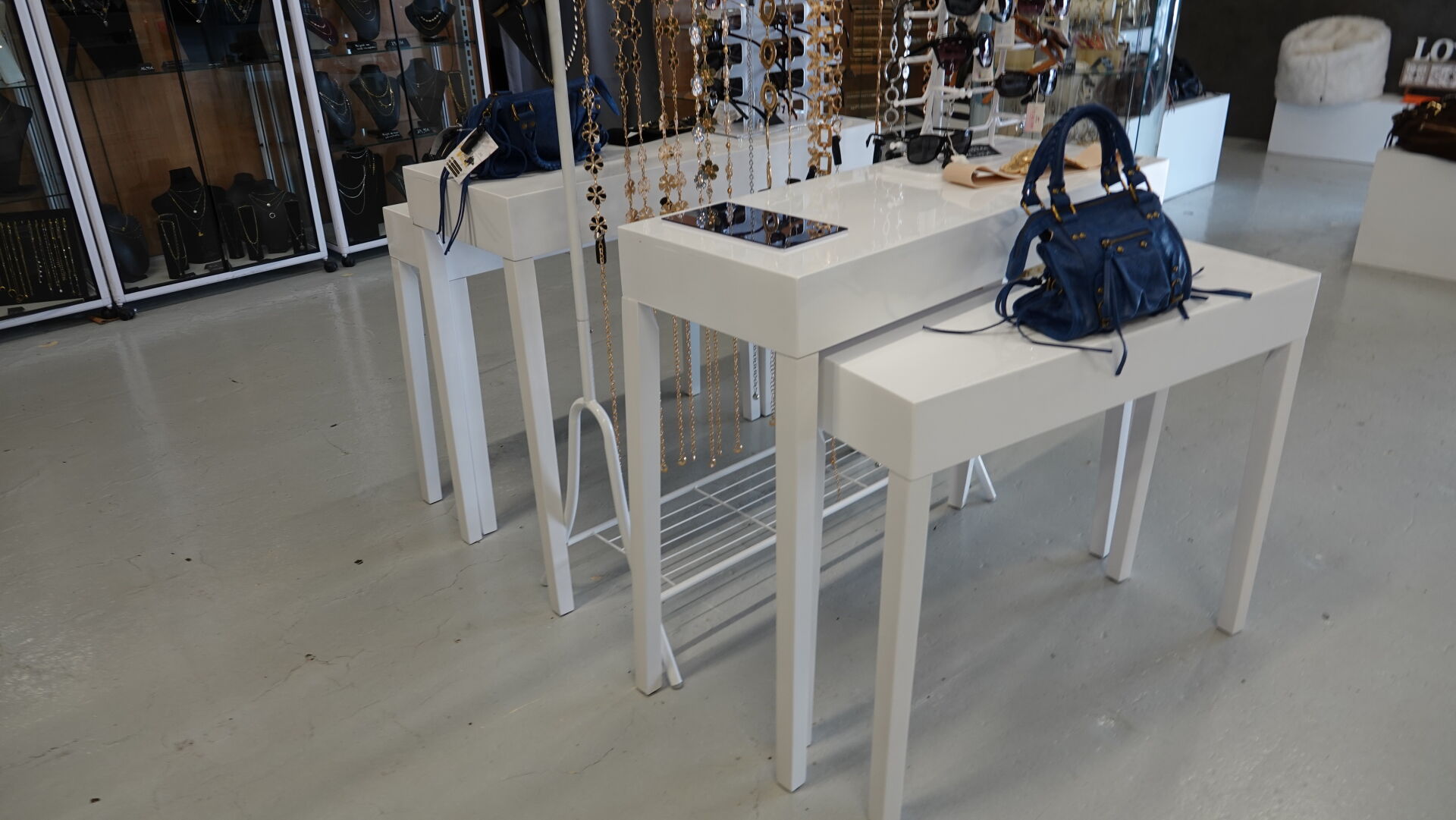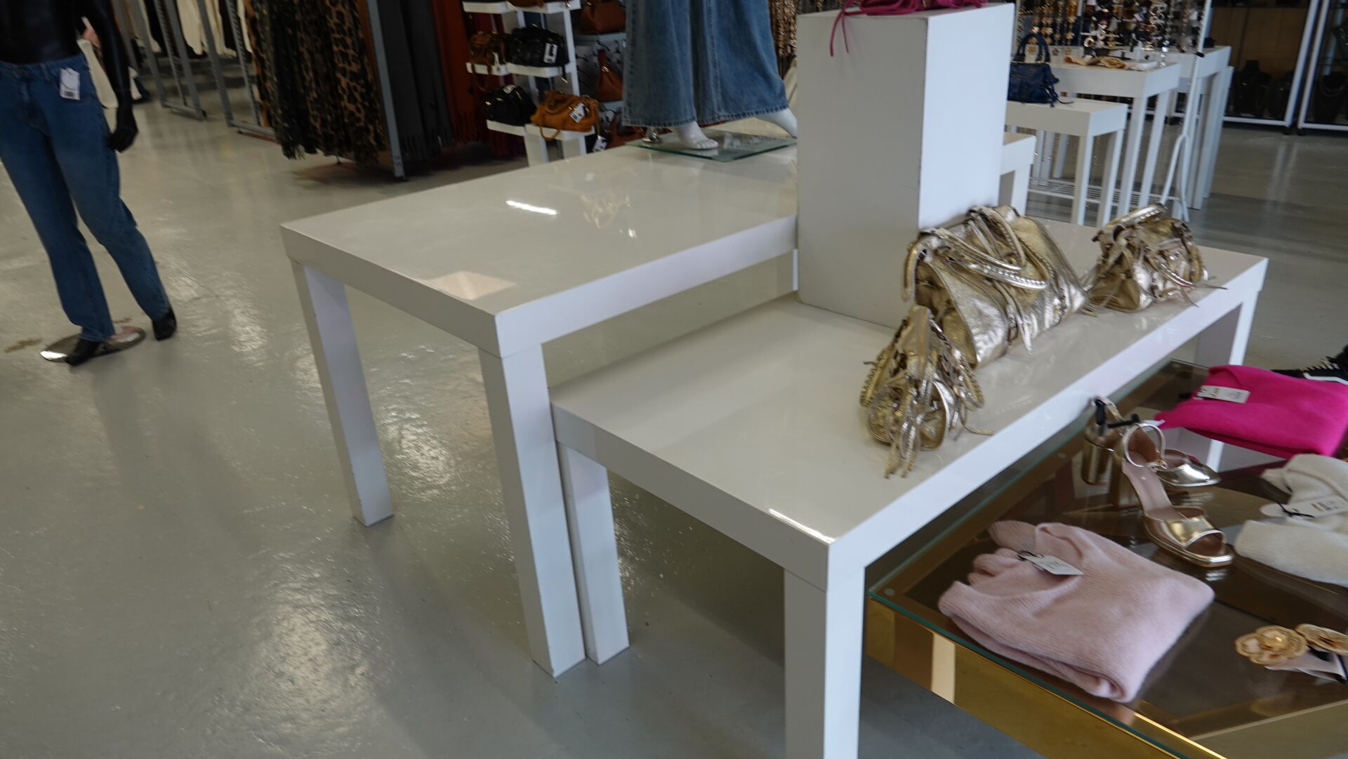 6 tables en mélaminé blanc dont : 180x90x80 cm 160x70x60 cm 2 de 90x34x78 cm 2 de 80x24x66 cm 2 bancs en métal laqué gris