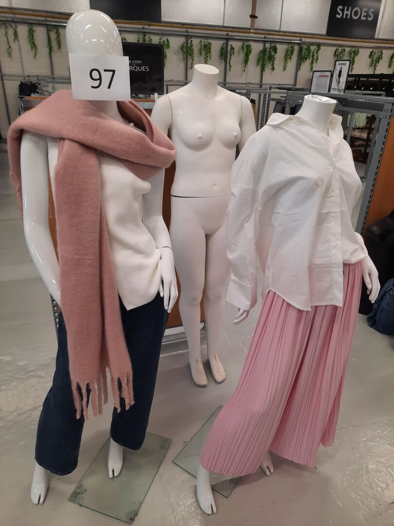 3 mannequins femmes sur socle dont 1 grande taille sans socle On joint : Vêtements portés