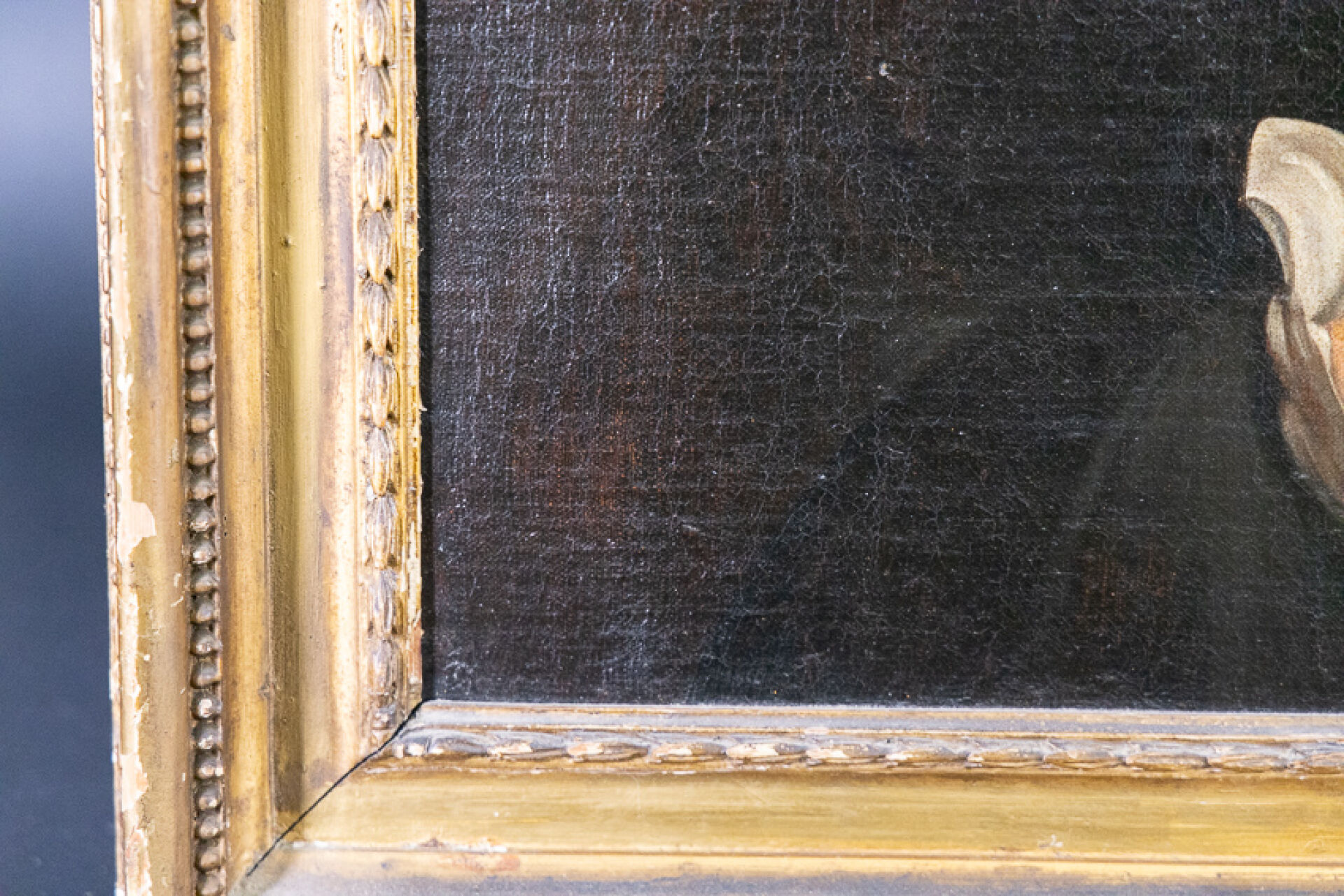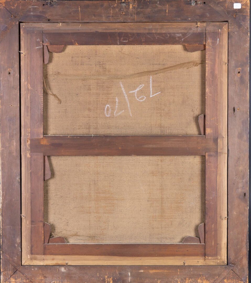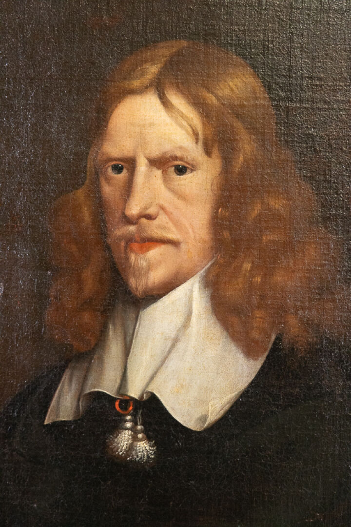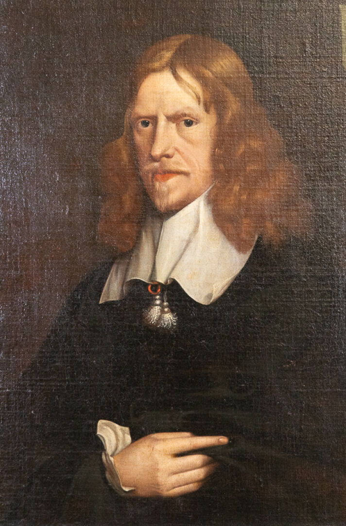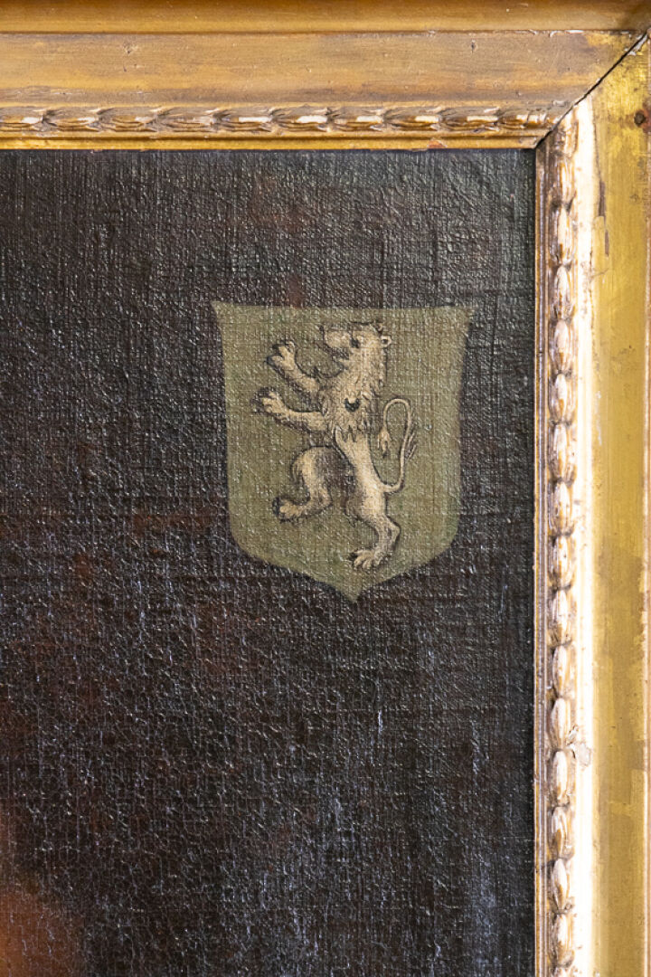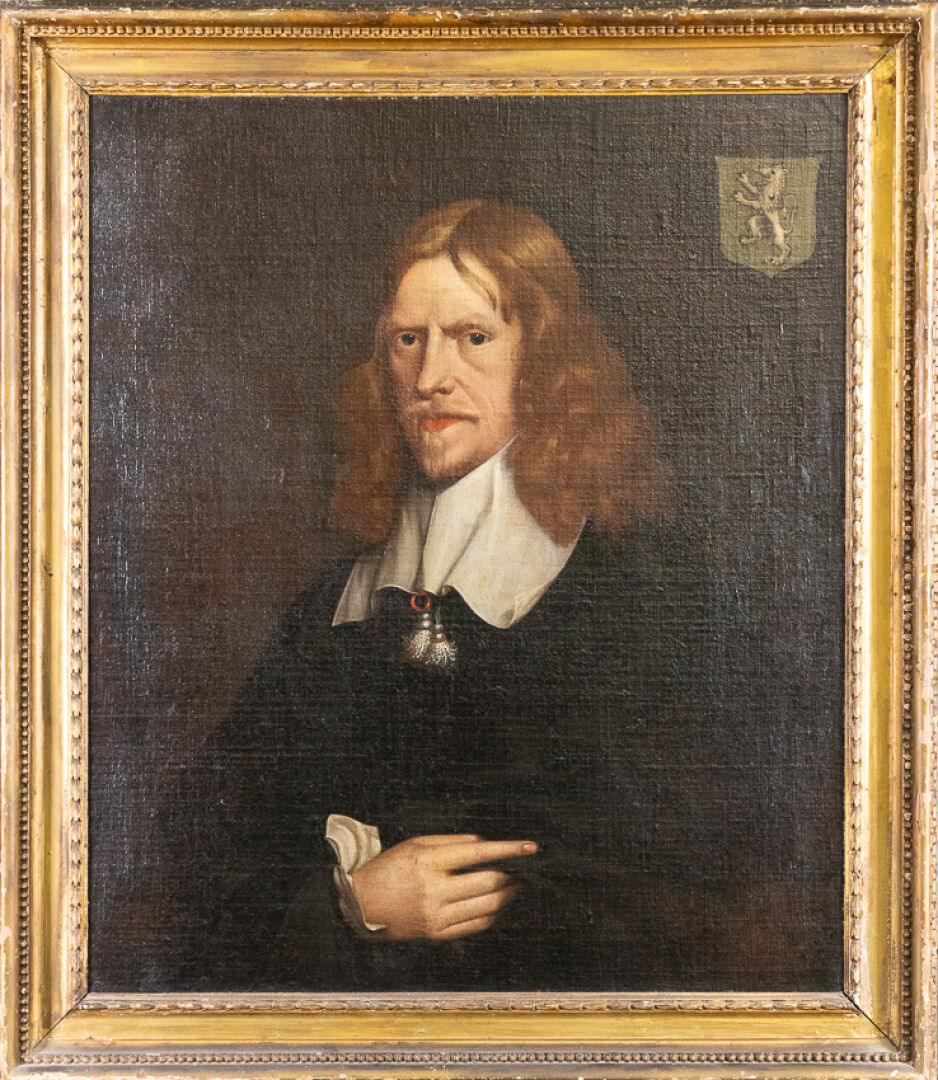 Dans le goût de l'école hollandaise du XVIIe siècle. Portrait d'homme aux cheveux roux au col blanc, aux armes au lion d'or sur fond sinople. Huile sur toile (restaurations). Haut. : 76 cm - Larg. : 64 cm