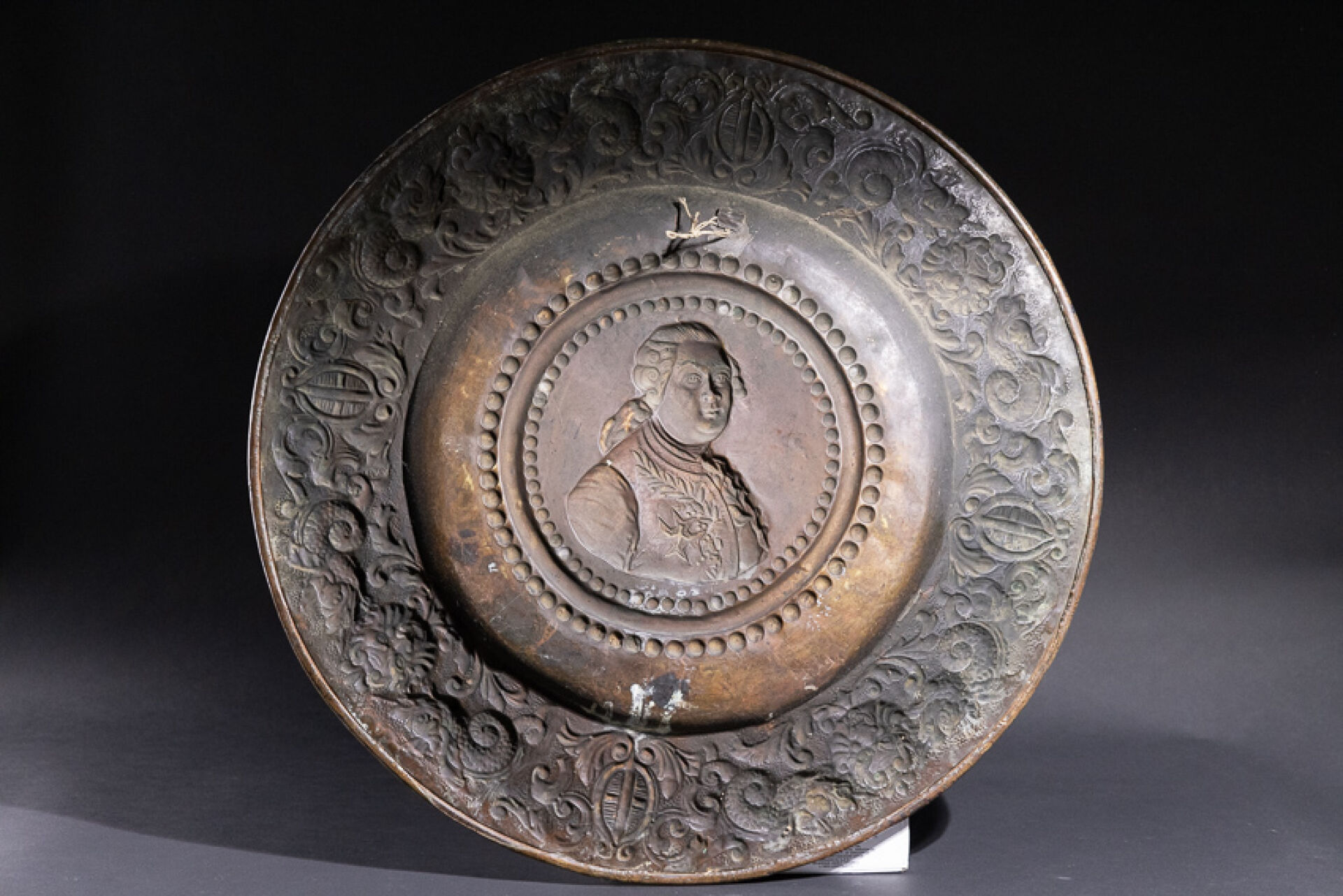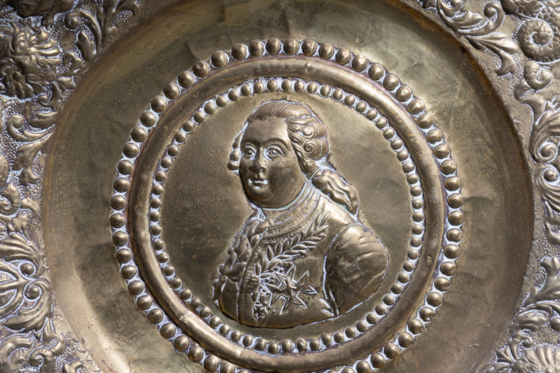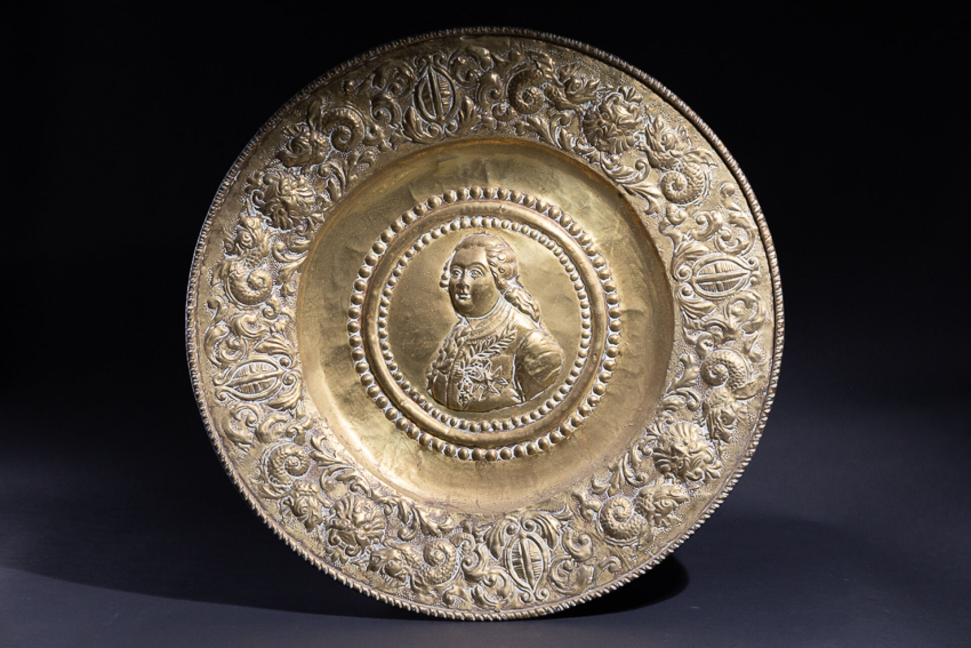 Grand plat d'apparat en laiton doré à décor repoussé et ciselé du portrait de Louis XVI, frise de perles, mascarons, volutes feuillagées (restaurations). Fin du XIXe siècle. Diam. : 62 cm