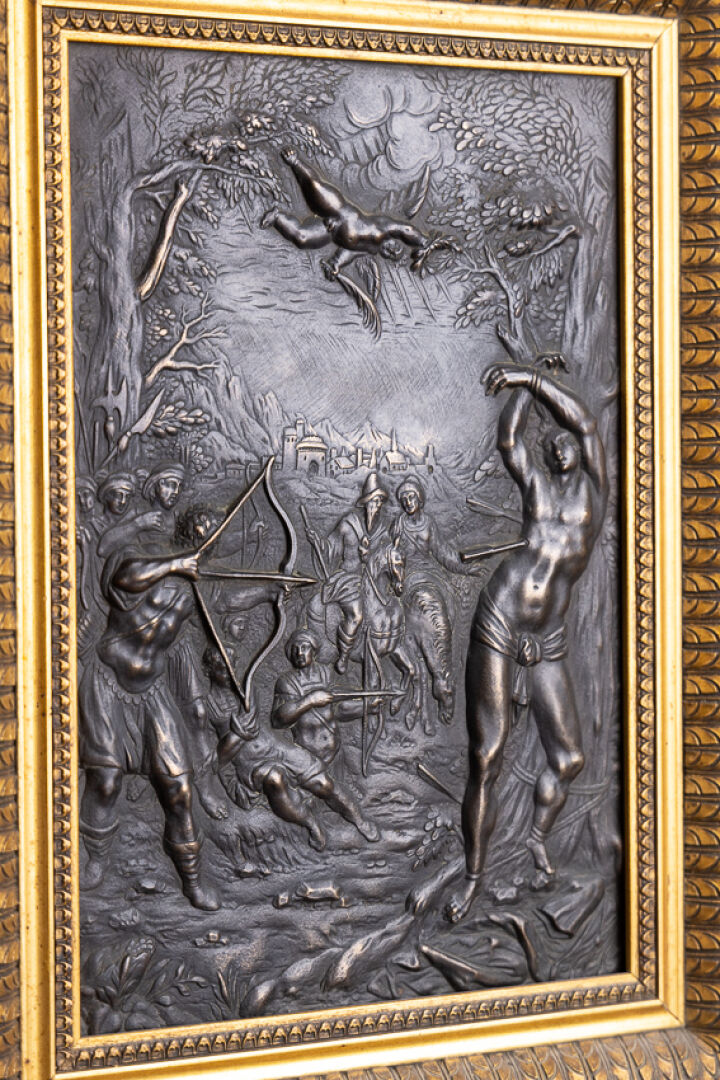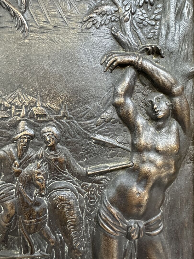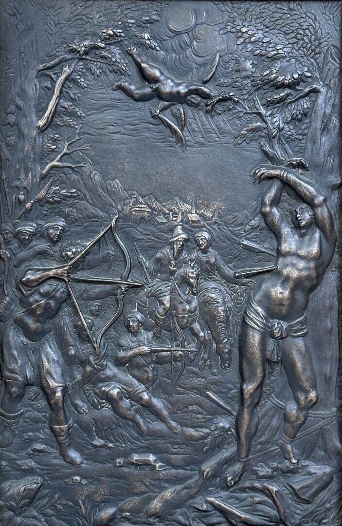 Dans le goût de la Renaissance. Le martyr de saint Sébastien. Bas-relief en bronze patiné noir. Dim. à vue : Haut. : 28.5 cm - Larg. : 19 cm Saint Sébastien est né au IIIe siècle à Narbonne dans une famille chrétienne. Il s'engage dans l'armée des coempereurs Maximien et Dioclétien et est rapidement nommé commandant de la garde prétorienne. Il profite de son rang pour encourager les martyrs à ne pas renier leur foi. Après avoir rendu la parole à une femme muette, il est convoqué au chevet du préfet de Rome qu'il guéri miraculeusement. Il est ensuite dénoncé aux empereurs qui le condamnent à être attaché et criblé de flèches par ses propres soldats. Soigné par sainte Irène de Rome, il confronte ses bourreaux une seconde fois et est battu à mort. Son corps est jeté aux égouts pour éviter une résurrection mais sainte Lucine trouve son corps et l'enterre dans les catacombes de Rome. Les flèches, symboles des épidémies lancées par le dieu Apollon, font de saint Sébastien le protecteur des peuples contre la peste au Moyen-Age puis le saint patron des Archers.