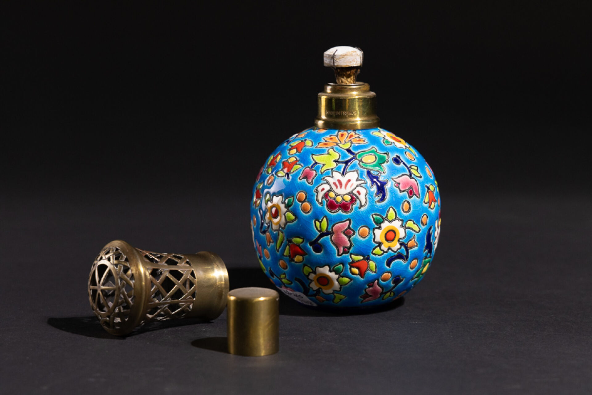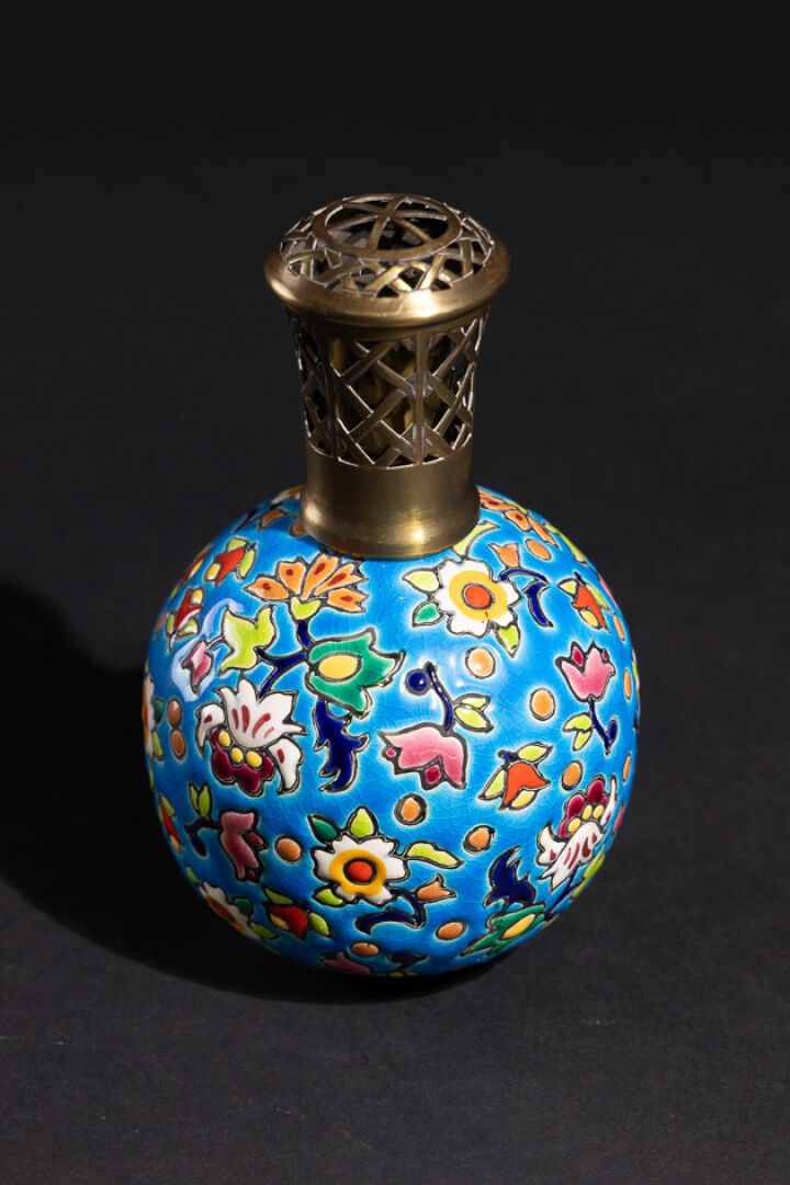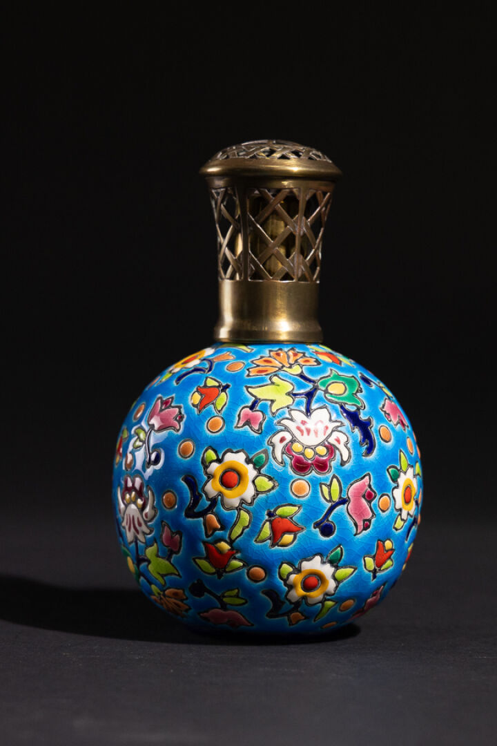 Manufacture de LONGWY. Lampe Berger en faïence émaillée polychrome à décor de fleurs sur fond bleu, décor LY Sévigné, tampon sous la base. Haut. : 17 cm