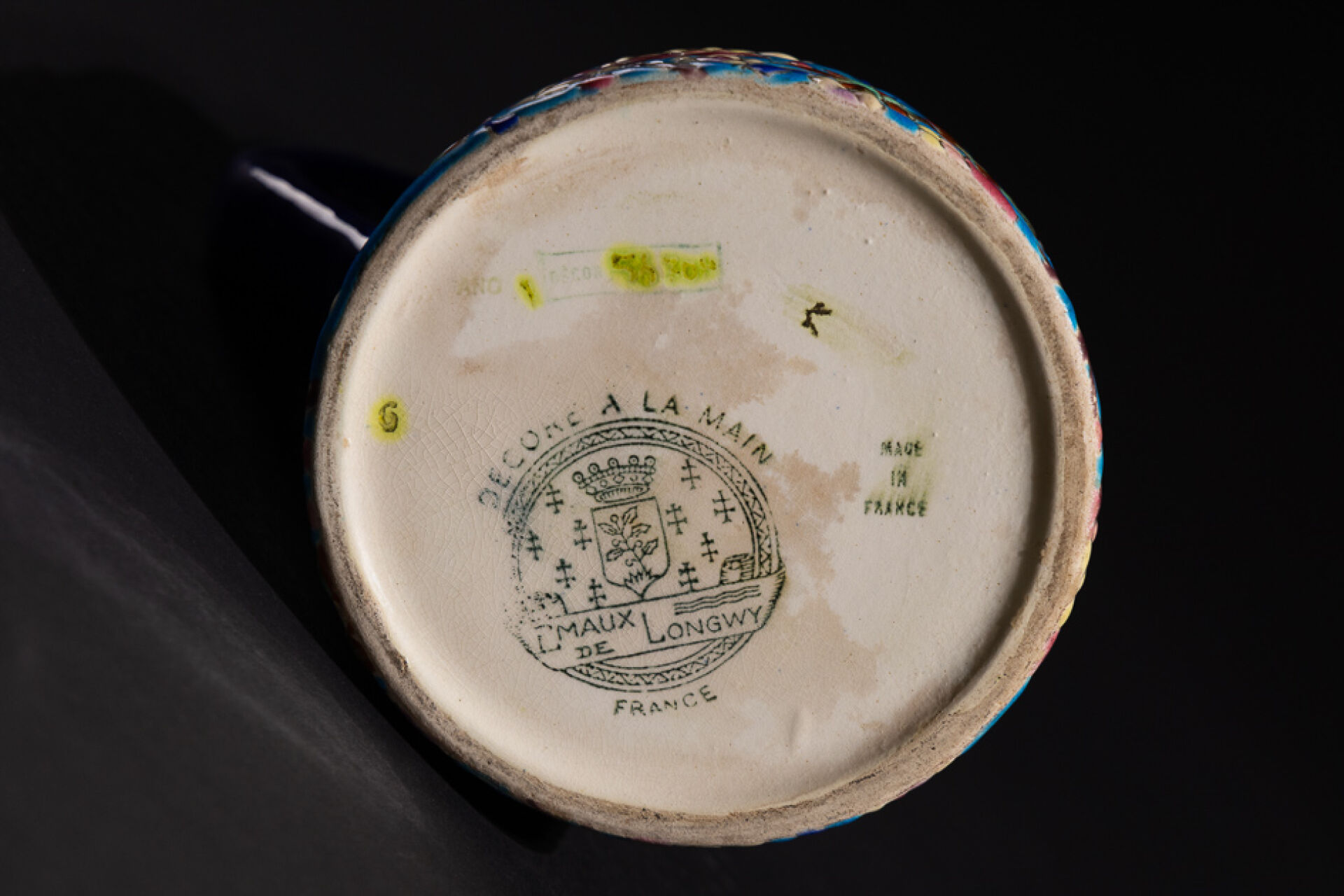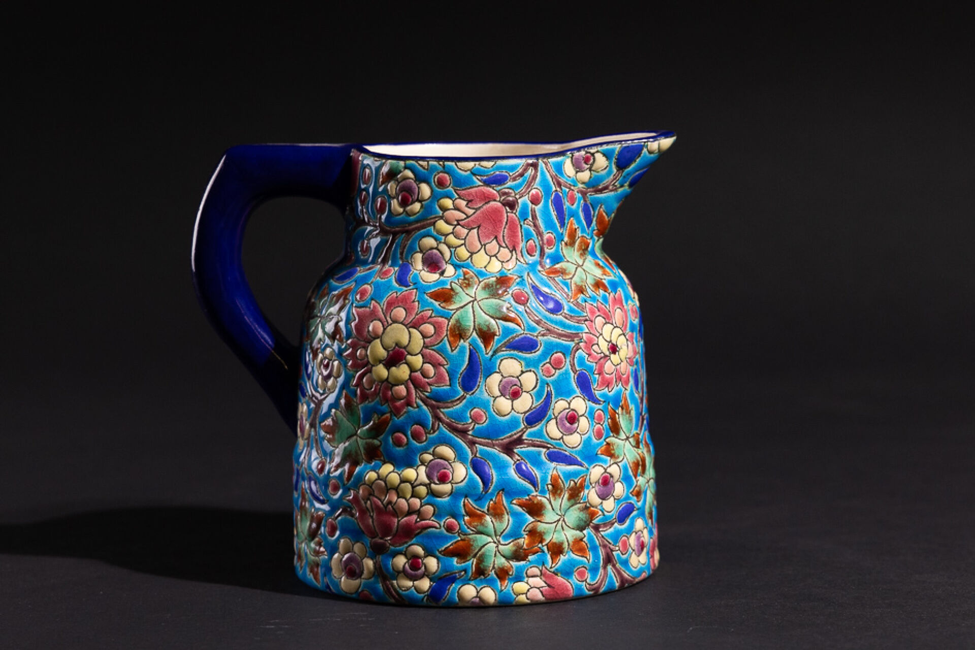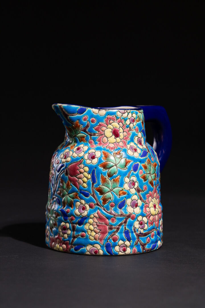 Manufacture de LONGWY Pichet en faïence émaillée polychrome à décor de fleurs, tampon Emaux de Longwy sous la base. Haut. : 15 cm