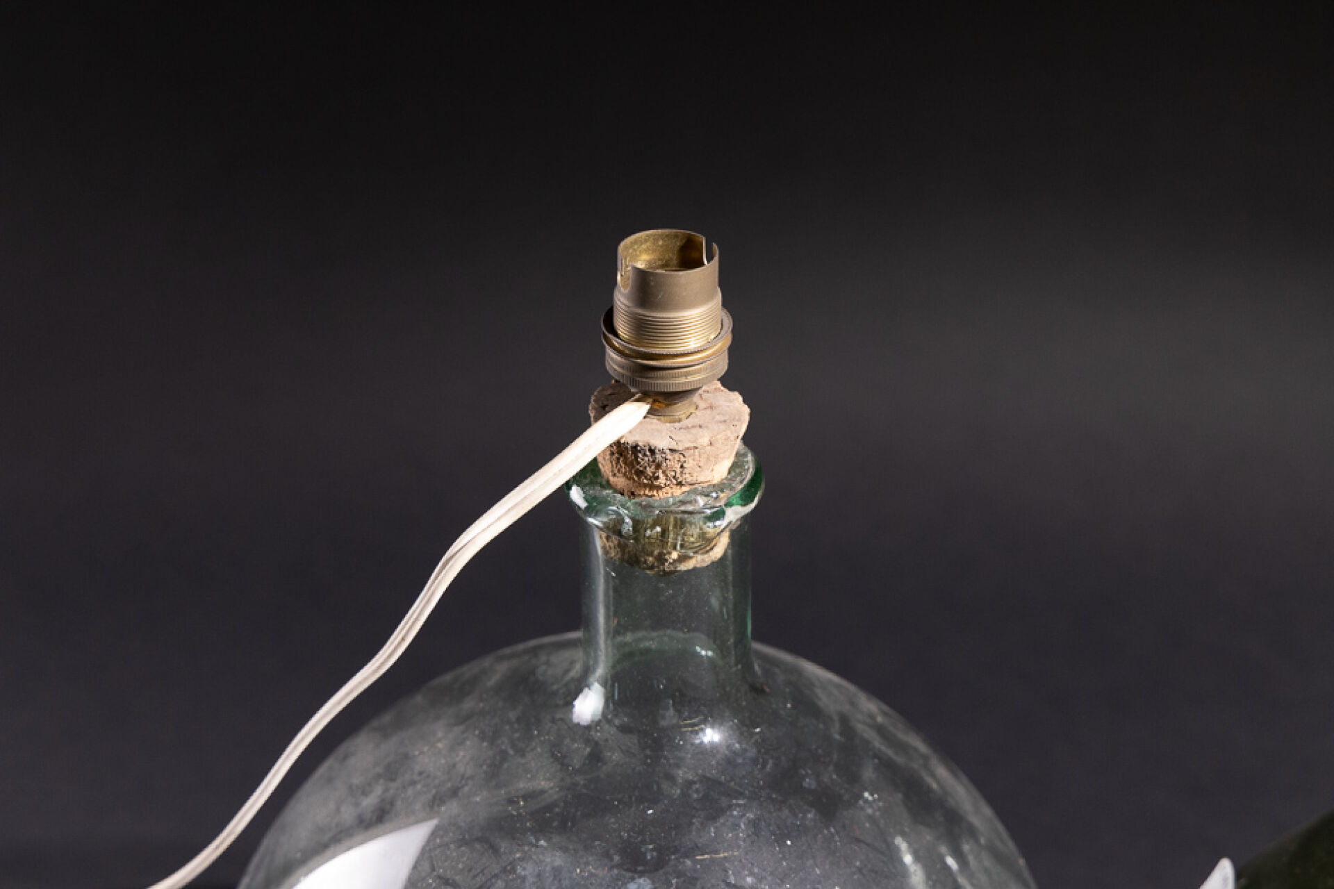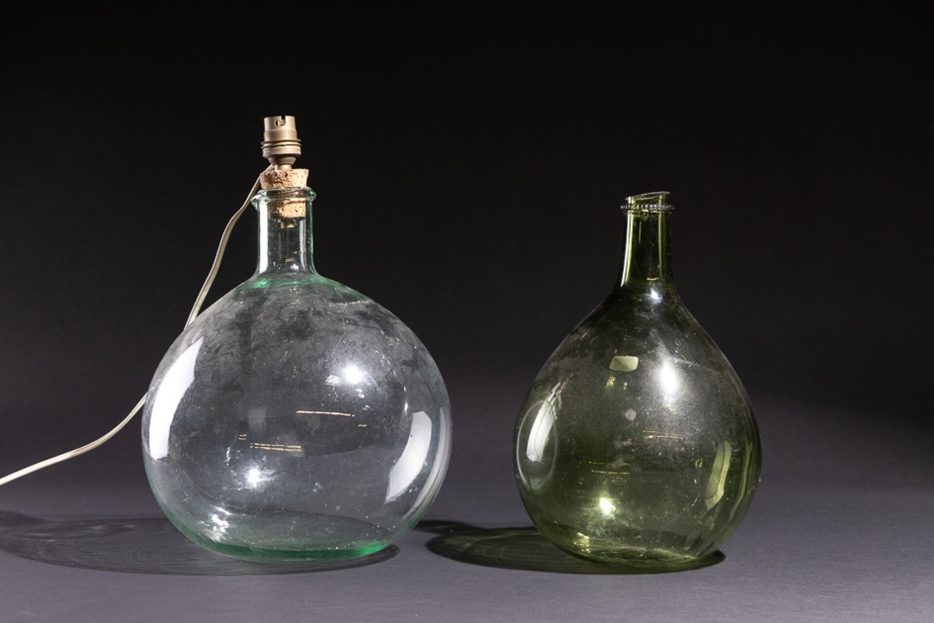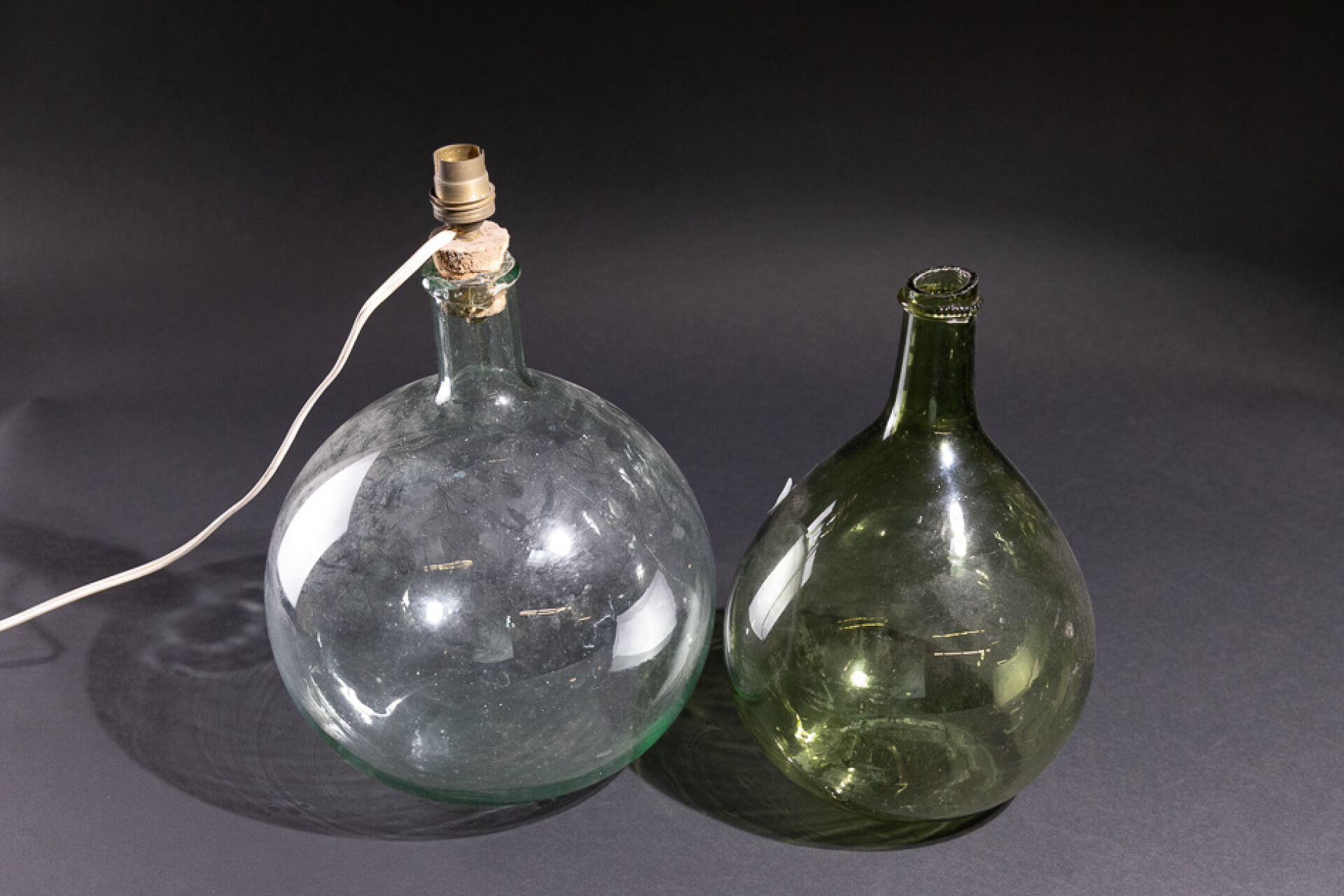 Deux bouteilles à panses globulaires dites Dame Jeanne, l'une au bouchon de liège monté à l'électricité, l'autre teintée verte. XIXe siècle Haut. : 29 et 30 cm