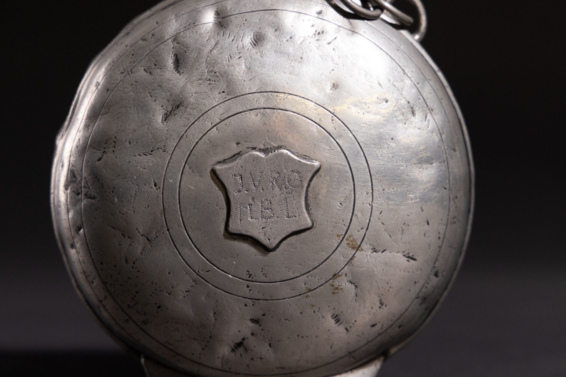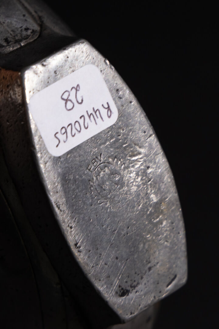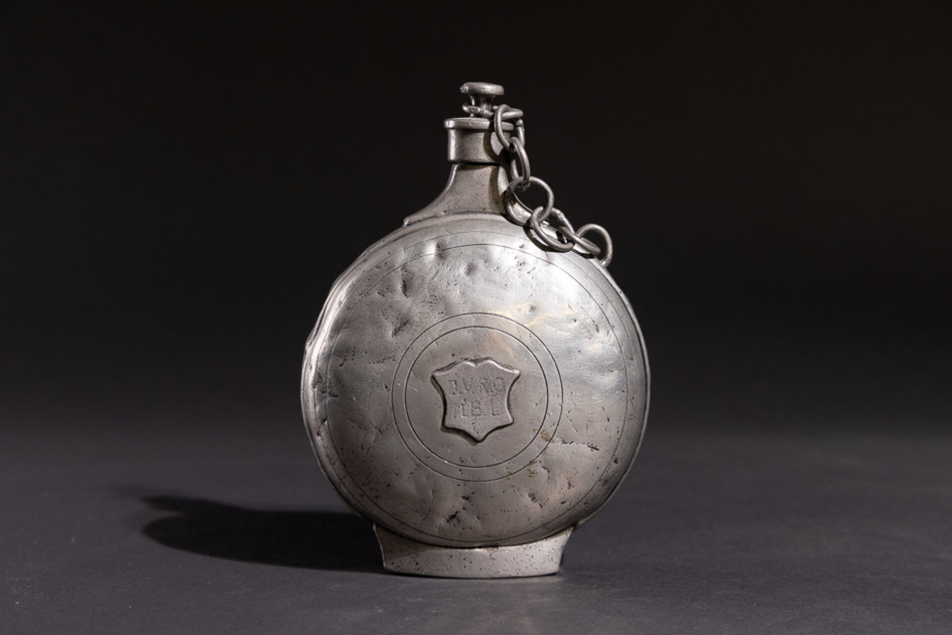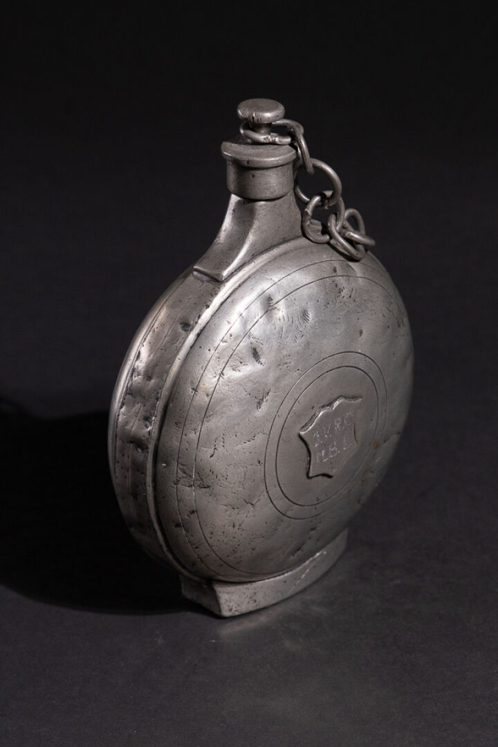 Gourde en étain sur pied ornée d'un écusson marqué J.V.R.O M.B.L. Porte sous la base une marque en creux FBV (chocs, usures). Vers 1900. Haut. : 20 cm - Diam. : 13 cm