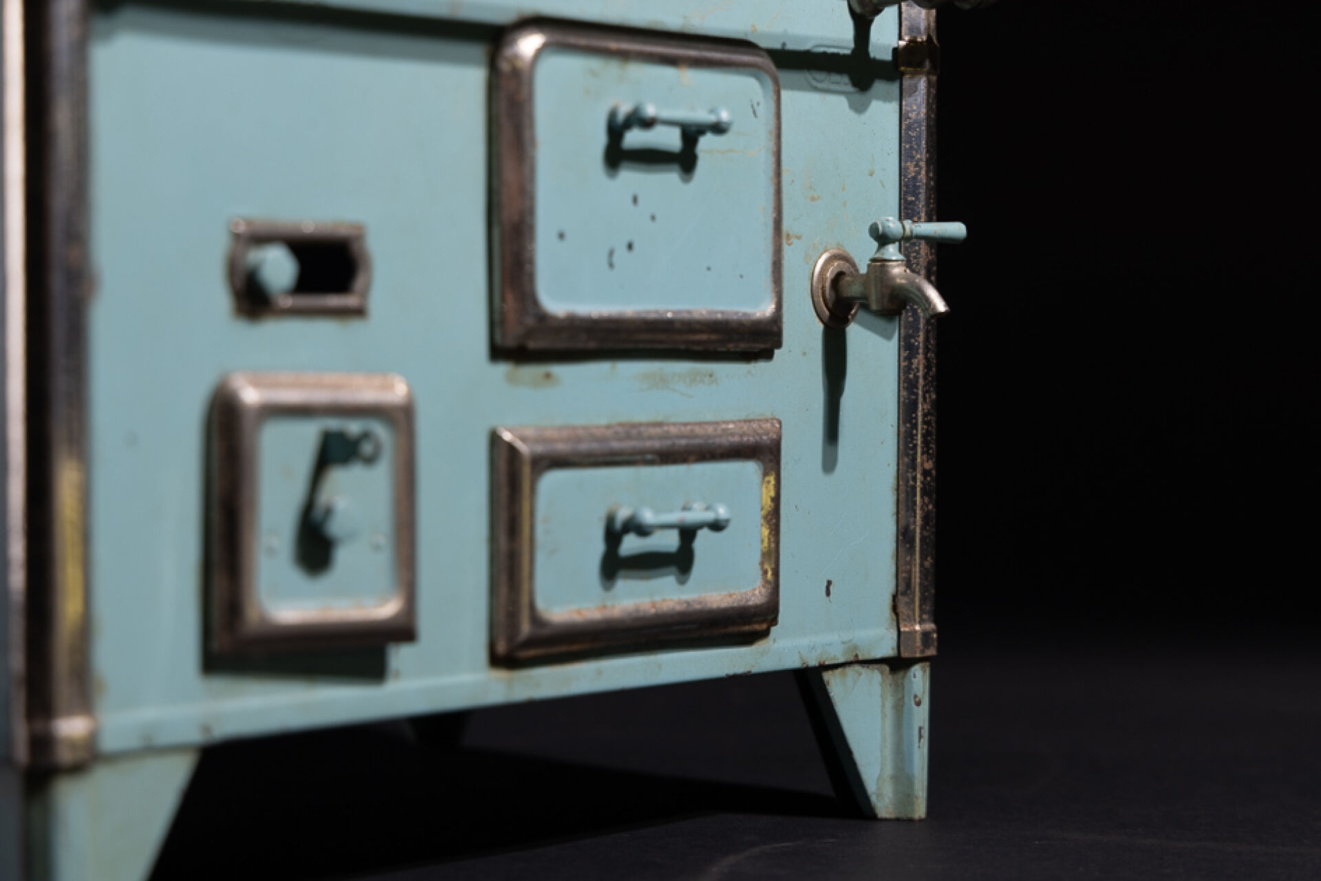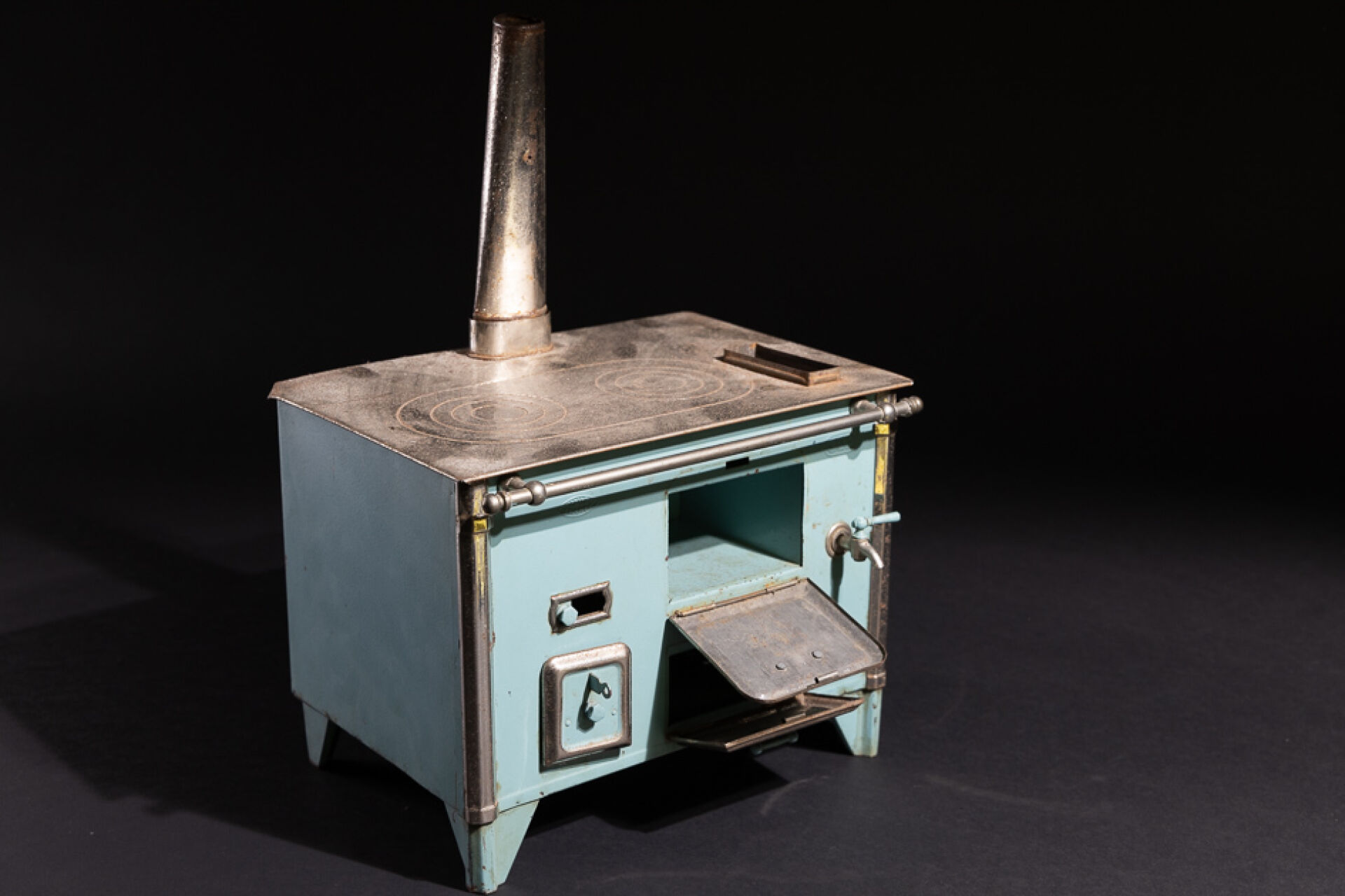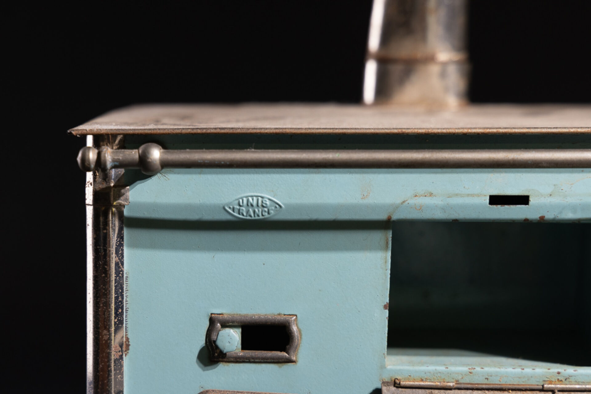 JEP-UNIS FRANCE. Cuisinière de poupée en métal laqué bleu (oxydation, petites tâches de rouille et éclats) Haut. : 37.5 cm - Larg. : 27 cm - Prof. : 20 cm