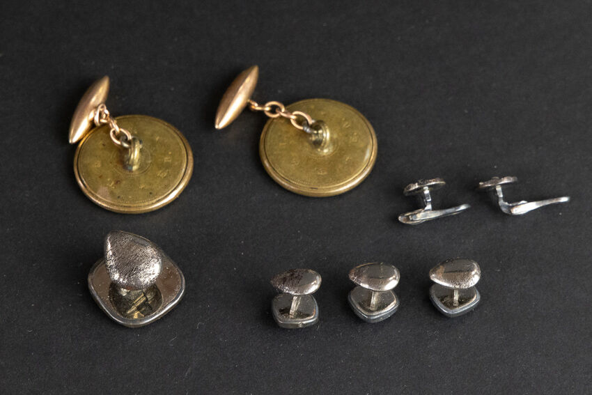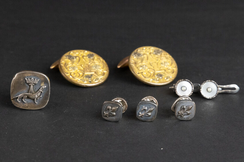 Ensemble de boutons comprenant : - 1 bouton carré à l'Hermine en métal argenté ; - 3 boutons de col fleurdelysés ; - 1 paire de boutons nacrés en métal argenté ; - 1 paire de boutons de manchettes circulaires à motifs de rinceaux.