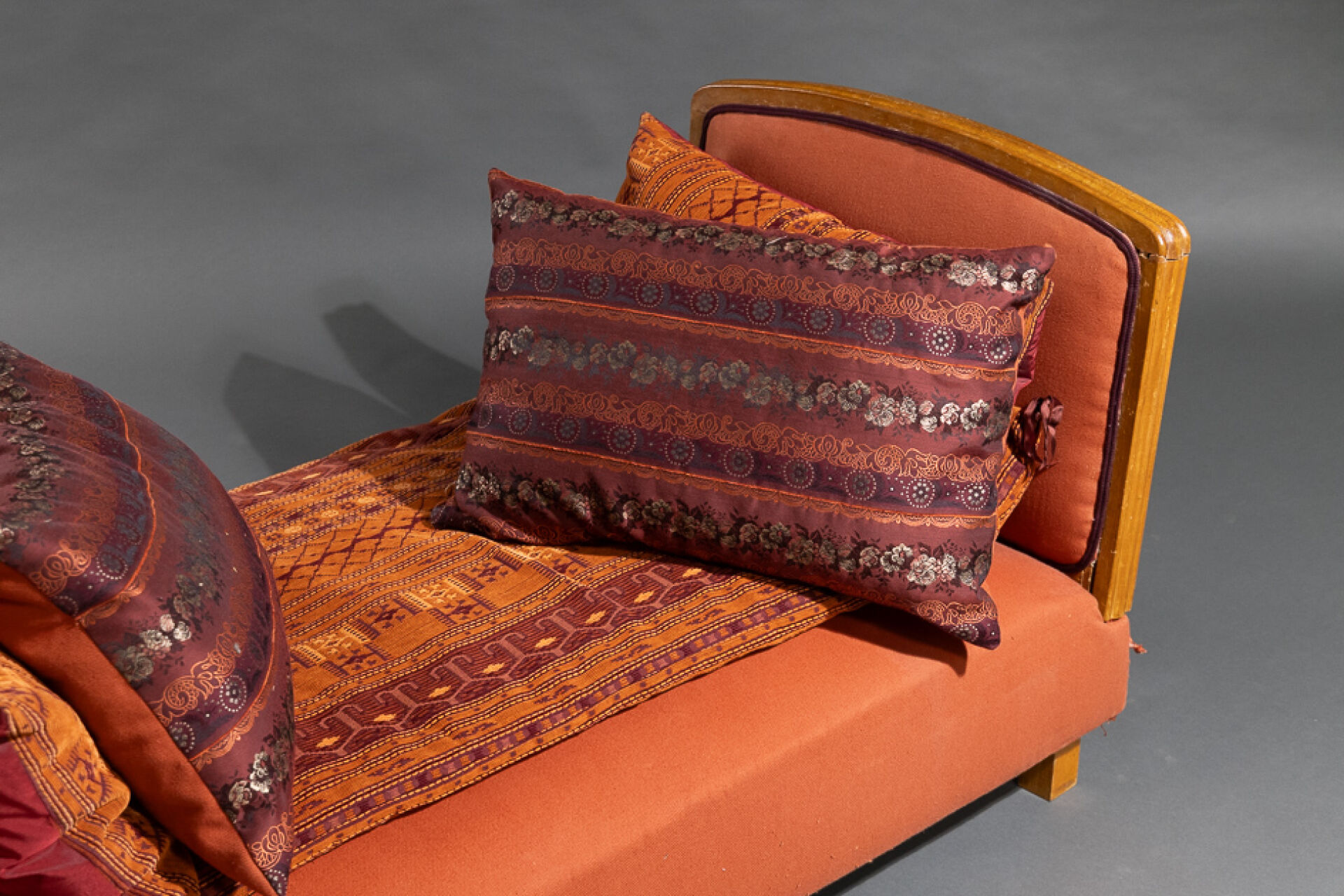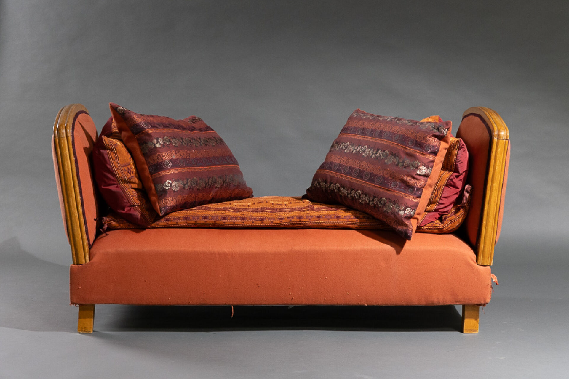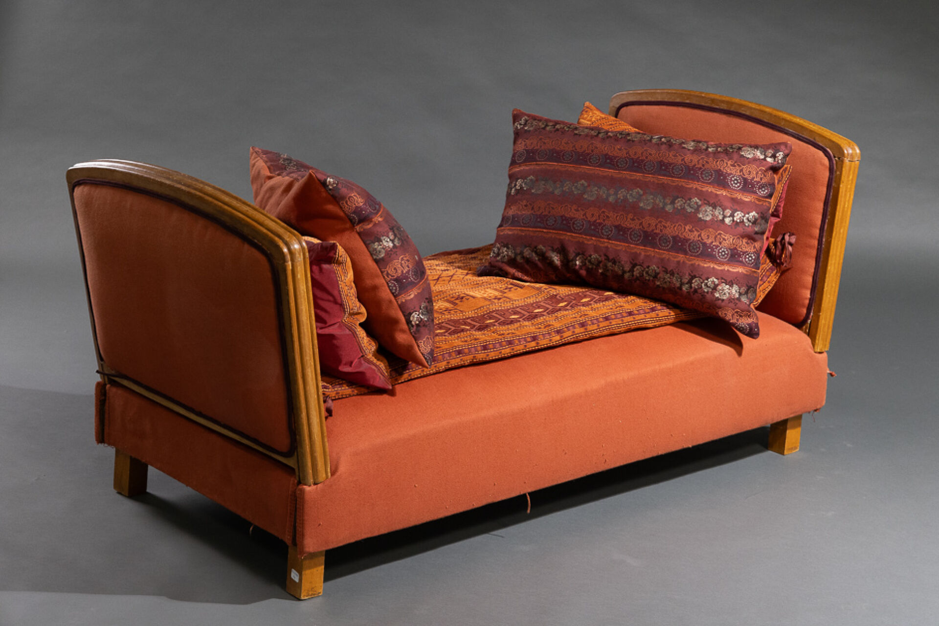 Banquette de repos en bois mouluré (petits accidents). XXe siècle. Haut. : 65 cm - Larg. : 120 cm - Prof. : 75 cm Garniture de tissu rouge. On joint : Cinq coussins dans les tons rouges et orange.