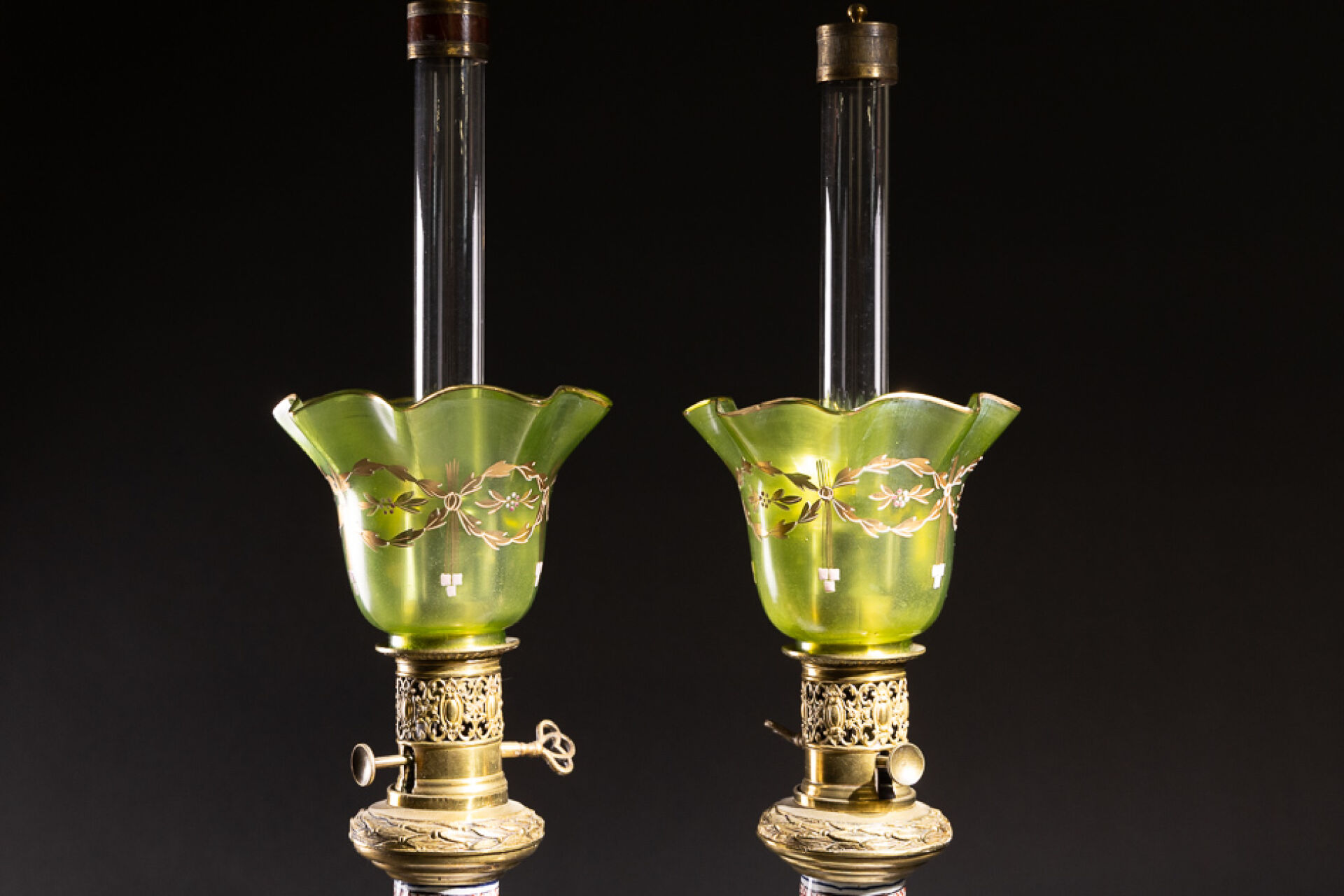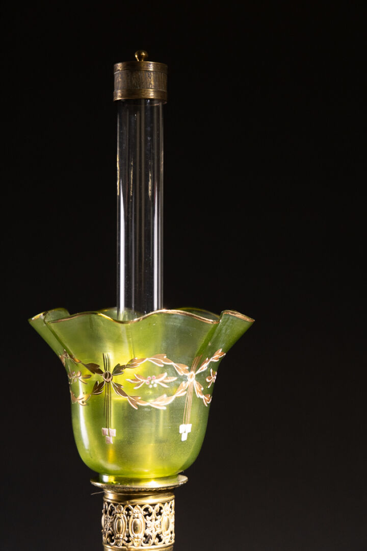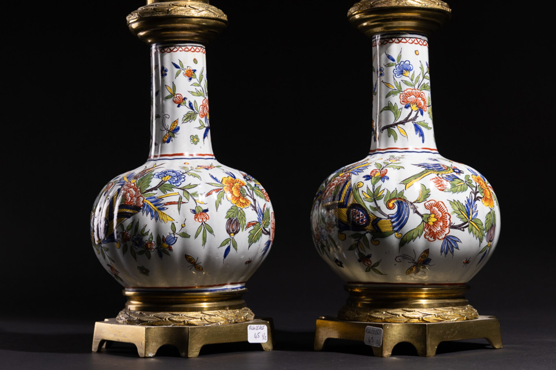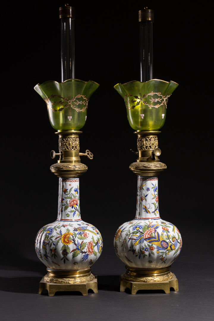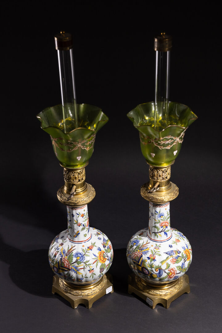 Paire de lampes à pétrole, en bronze ciselé et doré de tors de lauriers, le corps en faïence à décor polychrome dit aux petits feux de cornes d'abondance fleuries habitées d'oiseaux, dans le goût de Rouen. La verrerie en forme de corolles teintée verte à motifs dorés de feuillages. XIXe siècle. Haut. : 70 cm