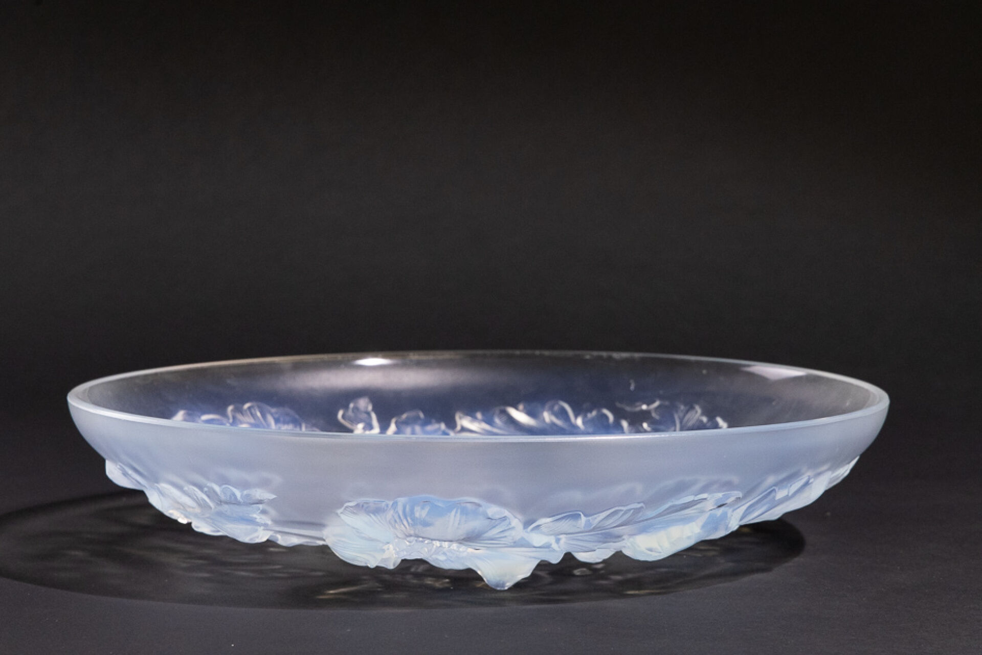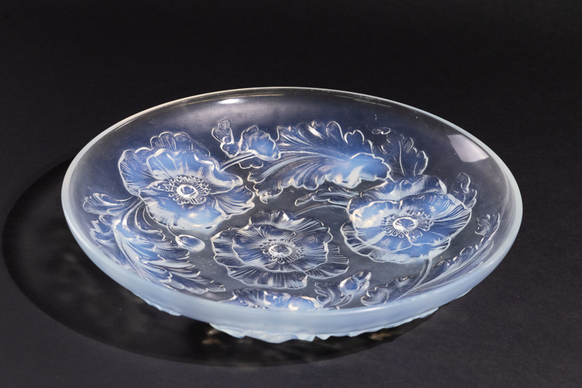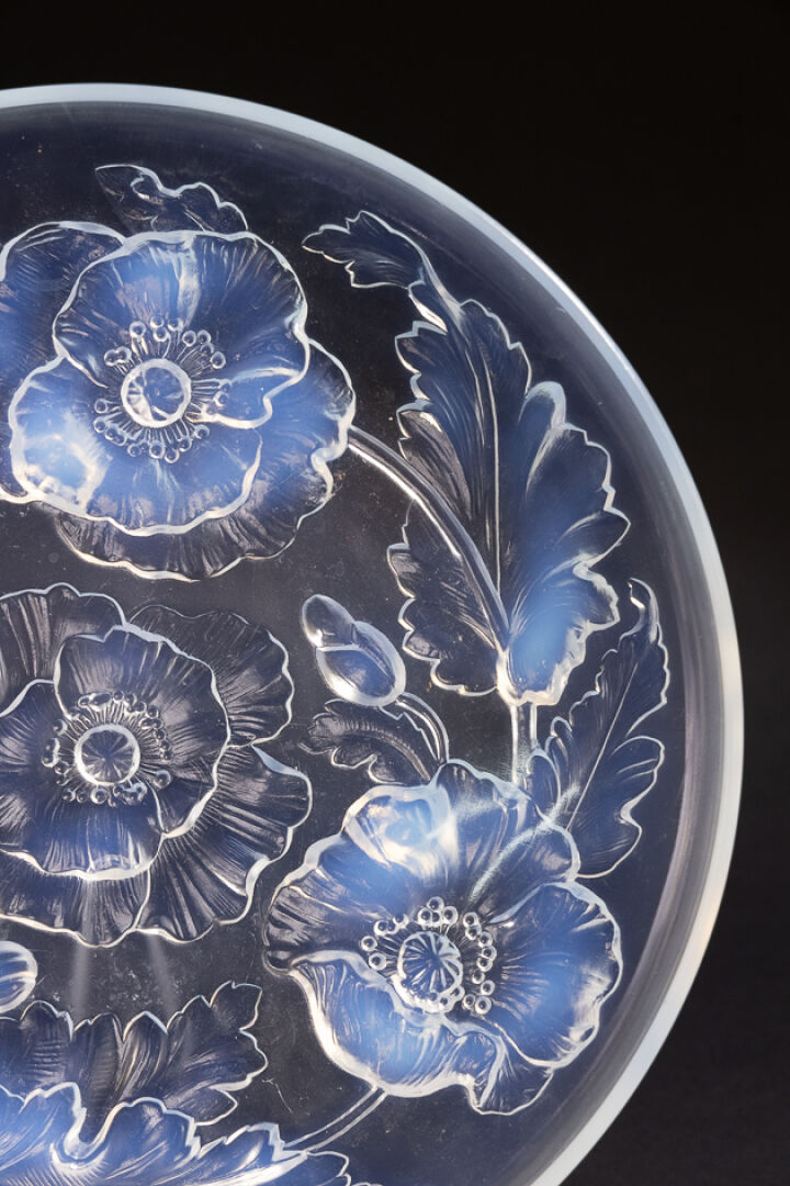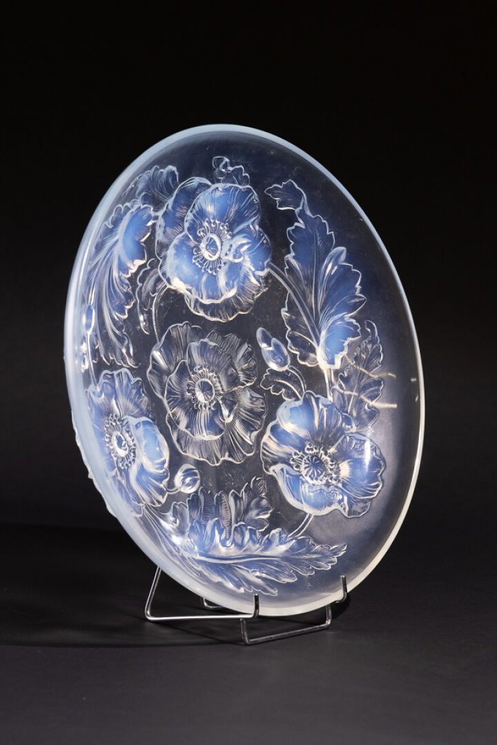 VERLYS France. Coupe circulaire en verre opalescent à décor de pavots tournoyant. Diam. : 35 cm